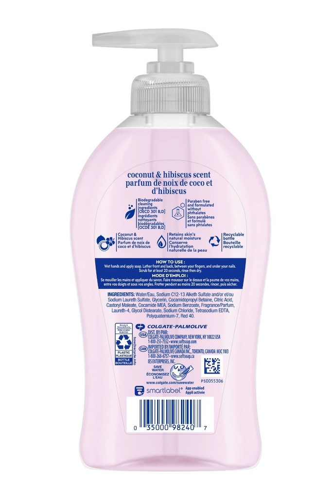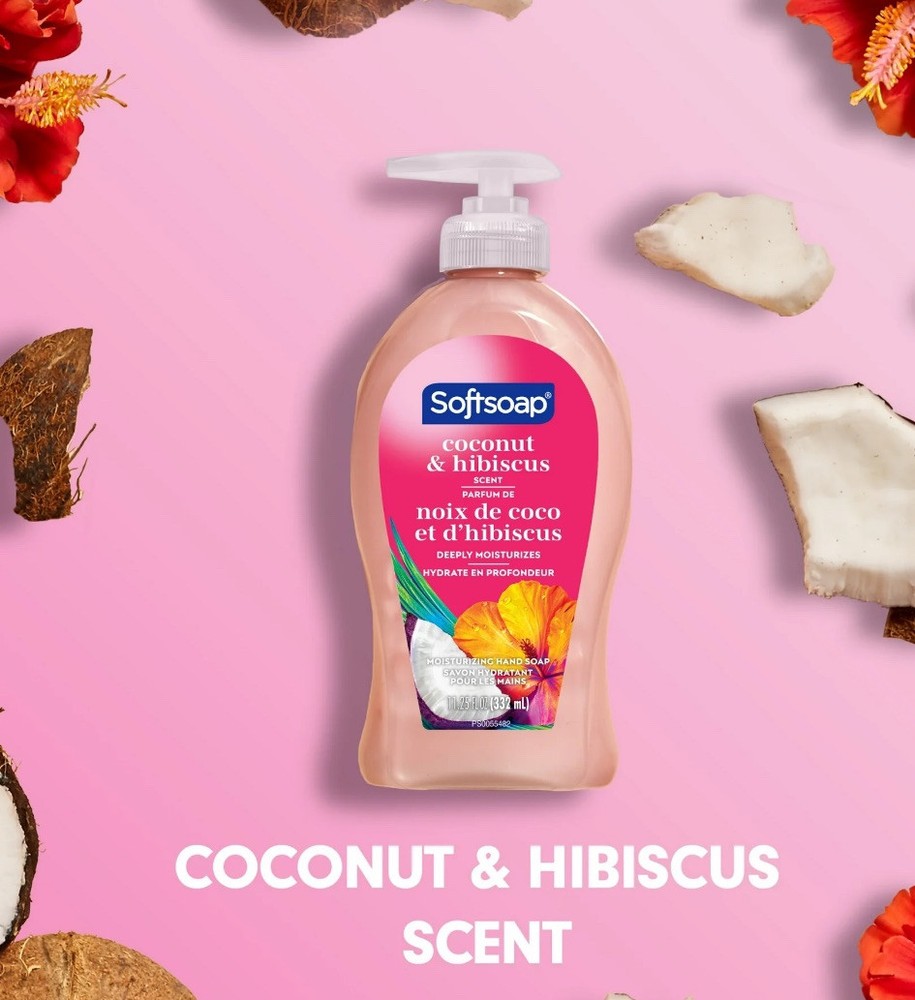 3 Pack Softsoap Moisturizing Liquid Hand Soap, Coconut & Hibiscus, 11.25 oz. From the #1 liquid hand soap brand (1) comes a deeply moisturizing hand soap with a coconut and hibiscus scent. Softsoap’s Coconut and Hibiscus Liquid Hand Soap perfectly complements the elegance of your bathroom or kitchen sink. This fun pink hand soap with its sweet and floral scent will infuse joy into the smallest moments. This tropical scented kitchen hand soap deeply moisturizes to hydrate dry skin, all while effectively washing away bacteria for clean and fresh hands. The creamy formula hydrates dry skin, leaving your hands feeling soft and smooth. Our dermatologist tested formula retains skin’s natural moisture and is formulated without parabens and phthalates. This bathroom hand soap is one you’ll want to keep on your sink to infuse every small moment with joy THREE 11.25 oz Bottle of Softsoap Coconut and Hibiscus Liquid Hand Soap Pump - The #1 Liquid Hand Soap Brand (1) This fun pink hand soap with it's sweet and floral scent will infuse joy into the smallest moments Its beautiful bottle design will perfectly complement the elegance of your bathroom or kitchen sink This bathroom hand soap has a creamy formula that hydrates dry skin, leaving your hands feeling soft and smooth Elevate your senses while effectively washing away bacteria with this moisturizing kitchen hand soap Paraben free and formulated without phthalates Retains skin’s natural moisture Dermatologist tested & pH balanced for your skin