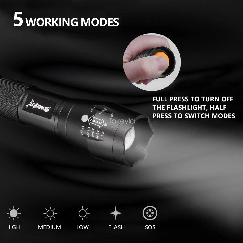 Battery Included: No IP Rating: IP55 Battery Technology: Rechargeable Battery(Not Included) Item Height: 0.98 inch Model: Super Bright LED Flashlight Small Item Weight: 8.46 ounce Item Width: 1.18 inch MPN: Does Not Apply Color: Black Power Source: 1x Rechargeable Battery(No included) Material: Aluminum Item Length: 4.88 inch Brand: Tokeyla Operating Time: 1-5 Hours Features: Battery Included, Handheld, Waterproof, Adjustable Focus, With Wrist Strap Country/Region of Manufacture: China Number of Batteries: 1 Lighting Technology: LED Type: Flashlight
