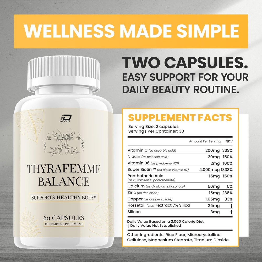 The ThyraFemme Balance Capsule by Avenura is an advanced formula designed for joint support. It contains active ingredients like Vitamin C, Vitamin B3, Calcium, and Horsetail extract, among others. This liquid formulation is suitable for adults of any gender and is made with all-natural ingredients. The pack includes 60 capsules, providing a convenient and effective way to help support healthy joints. ThyraFemme Balance Capsule Natural Ingredient General Wellness Formula ThyraFemme Balance Support ThyraFemmeBalance Made in USA ThyraFemme Balance Capsules
