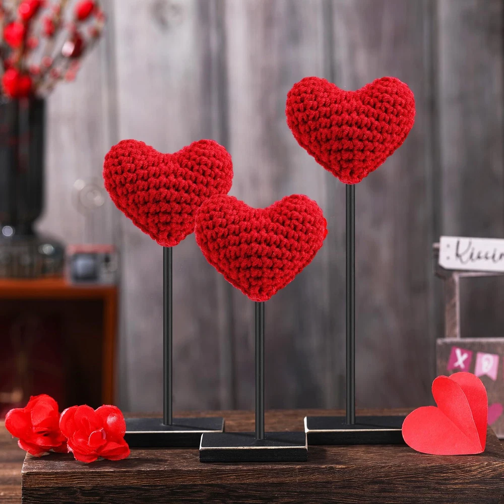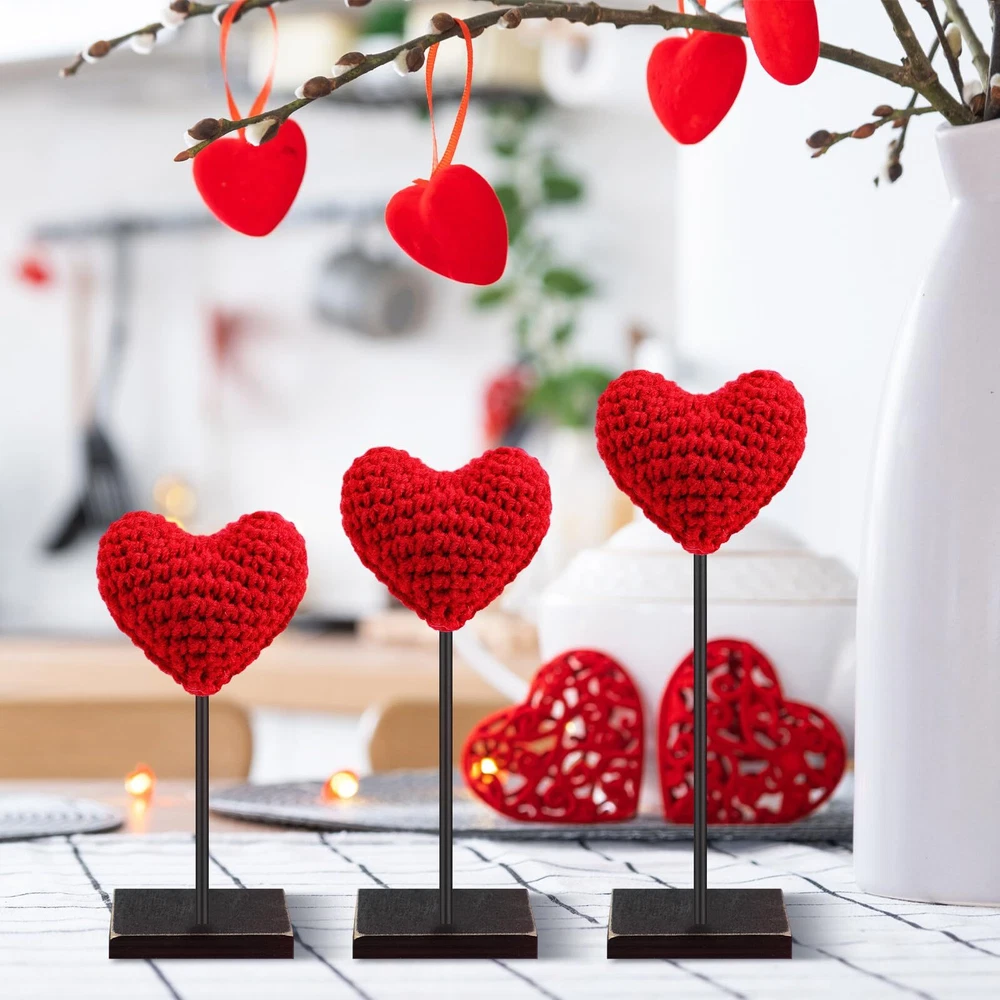 Features: With these exquisitely knitted heart table decors, every day can be a special celebration of love. Whether it's an ordinary day you want to make special, or a significant occasion like an anniversary, these decors ensure to enhance the ambiance. These delicate heart shaped decors play a significant role in establishing a strong romantic atmosphere. Whether applied for a Valentine's Day dinner, a wedding or an anniversary celebration, they're sure to add a dash of romance to the proceedings. Specifications: Sticks material: wood Color: red Heart part of knitted heart table decor size: about 3.35 inches/ 8.5 cm Sticks size: about 7.09 inches/ 18 cm, 5.91 inches/ 15 cm, 4.72 inches/ 12 cm Bases size: about 1.57 x 2.36 inches/ 4 x 6 cm Package includes: 3 x Valentine's Day knitted heart table decors Notes: Manual measurement, please allow slight errors on size. The color may exist a slight difference due to different screen displays. Valentine's Day Knitted Heart Decor Set: the package includes 3 pieces of Valentine's Day knitted heart table decors, with 3 sturdy bases and 3 sticks; Simply combine the components to effortlessly create a romantic Valentine's Day setting Ideal Size: the heart parts measure about 3.35 inches in size, and the sticks have 3 different lengths, respectively about 7.09 inches, 5.91 inches and 4.72 inches; The sturdy bases are about 1.57 x 2.36 inches, offering stable support Hand Knitted Design: the heart part is meticulously hand knitted, providing a rustic, charming touch to your decor; The vintage design on the bases adds a touch of timeless elegance, serving as an aesthetically pleasing manner to celebrate love Stable and Versatile: our table decors come complete with thick bases and sticks, ensuring that they stand firmly; Our design allows easy removal and storage, making them an ideal decor piece for windows, tables, fireplaces, and more Suitable for Various Occasions: these heart table signs aren't just for Valentine's Day, you can use them to spruce up your Christmas decor, add a romantic touch to a wedding or anniversary, or even create a special atmosphere for an engagement or a date