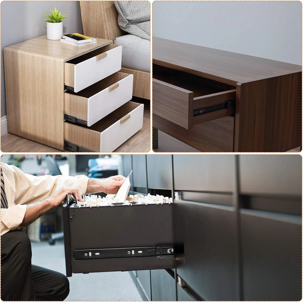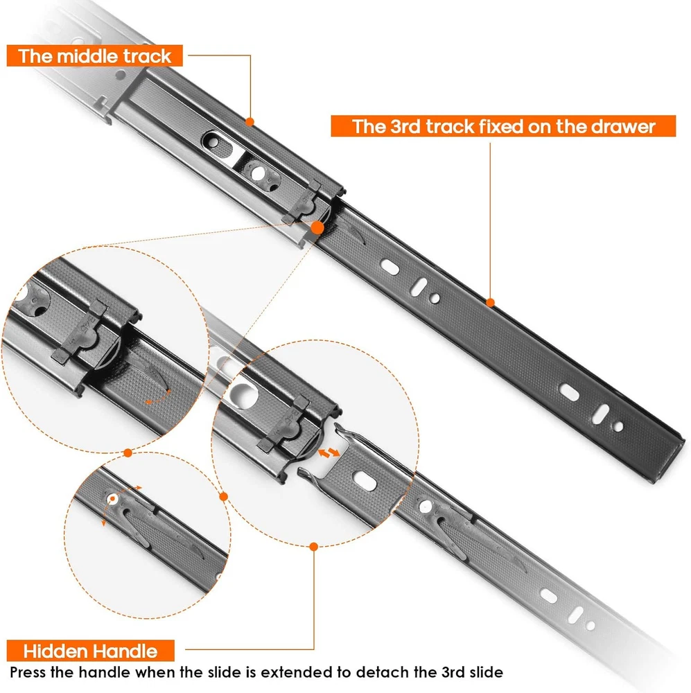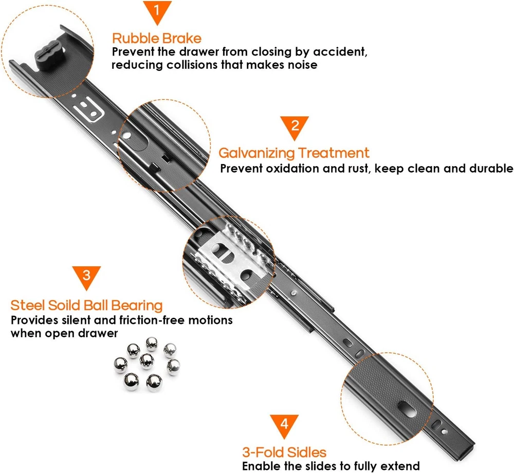 3 Pair Drawer Slides 10 inch, Heavy Duty Ball Bearing Full 10Inch, Black Product Details Mounting Type: Side Mount Weight Limit: 100 Pounds Drawer Type: Side Mount Manufacturer: ESPEN Part Number: DrawerSlides-10inch-6-BK-210116m Item Weight: 2.9 pounds Product Dimensions: 10 x 1.75 x 0.46 inches Item model number: DrawerSlides-10inch-6-BK-210116m Size: 10Inch Finish: Steel Maximum Weight Capacity: 100 Pounds Batteries Included?: No Batteries Required?: No Color: Black Material: Alloy Steel Brand: ESPEN Product Dimensions: 10"L x 1.75"W x 0.46"Th Finish Type: Steel 10 INCH SOFT CLOSE DRAWER SLIDES: Length: 10 inch(250mm), Suitable for long cabinet depths of 10-12 inches(250-300 mm), Carrying capacity: 45 kg / 100 lb FULL EXTENSION DRAWER RUNNERS & DETACHABLE: Full extension drawer runners noiseless ball bearing drawer runners rail.Detachable internal guide rail (to remove the tool from the drawer). SOLID BALL BEARING DESIGN: Steel ball bearing action that offer less noise at closing and opening. very effectively ensure the stability and smoothness of the orbital operation. WIDE APPLICATIONS: They are widely used on: dresser, spice rack, kitchen cupboard, bed drawers, keyboard, shelves... perfectly for your DIY projects EASY INSTALLATION: Push to open style which do not need a drawer handle.Side mount and will fit most cabinet drawers, Mounting screws not included. ESPEN 3 Pair Full Extension Drawer Slides, 10 Inch 3-Section Silent Soft Closed Ball Bearing Drawer Slides is suitable for kitchen cabinets, offices, hotels, accommodations, institutions and residences SPECIFICATION Material: High quality cold rolled steel Size: 10 inch Color: Black Max Load Capacity: 45KG/100 lb Features: ball bearings & cushion pad FEATURE 1.Solid metal steel ball design: Pull back and forth more smoothly and more firmer quality 2.Full extension: 3 Folds Full Extension, opening allows for the entire drawer to be accessed. 3.Slides easily with a slight push and operate smoothly. 4.Quality Material : Made from high-grade cold rolled steel. Zinc Plated. Rust resistant for your lifetime use. 5.Less noise : Steel ball bearing action that offer less noise at closing and opening. 6.Rubber brake preventing from automatic opening.provides slient and friction-free motions when open drawer. 7.Anti rust and corrosion protection: drawer slides are treated with electrophoresis, and the electrophoretic layer blocks the direct contact between the air and the rail steel plate, which is resistant to oxidation and corrosion PACKAGE INCLUDED: 3 Pair 10 inch Ball Bearing Full Extension Drawer Slides