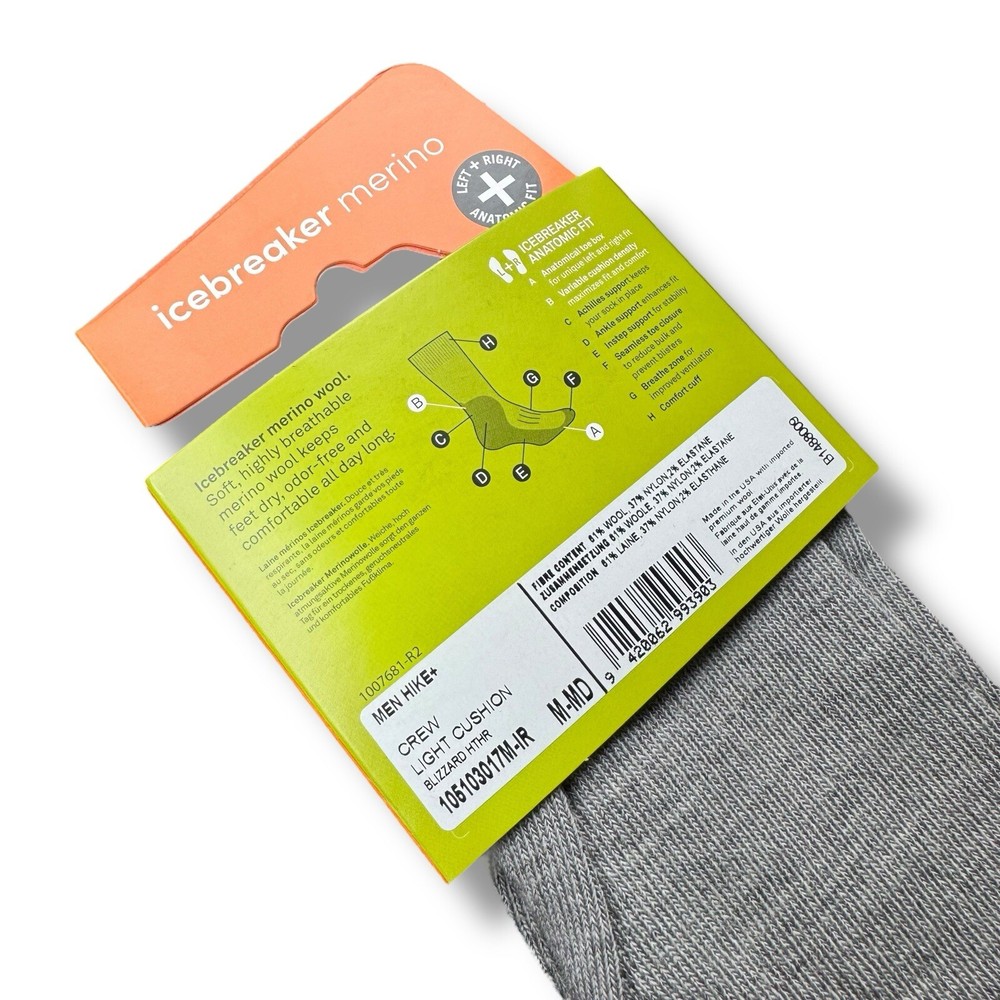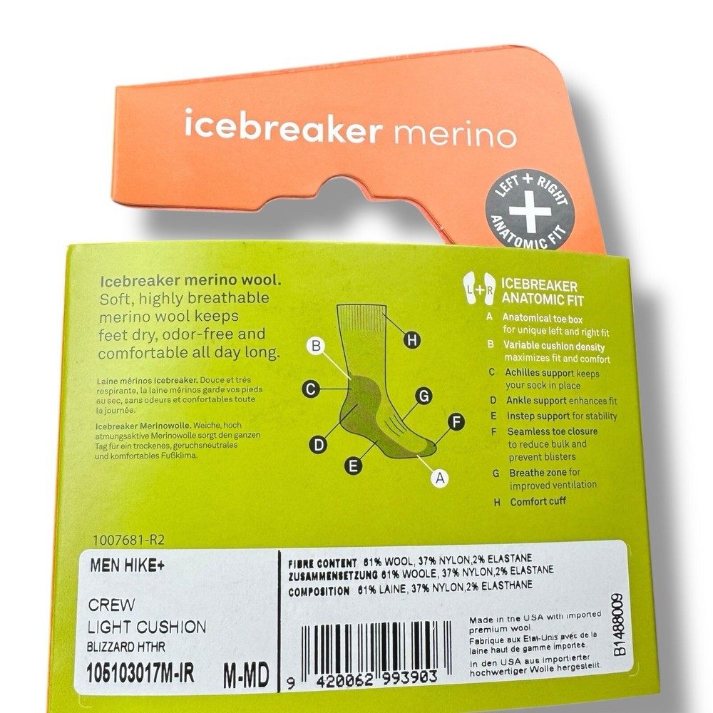 Description: Stay comfortable on every hike with these Icebreaker Merino Men’s Hike+ Crew Socks. Designed with a left and right anatomical fit, they provide superior support and comfort. Made with soft, highly breathable merino wool, these socks keep your feet dry, odor-free, and comfortable all day long. • Size: Medium ( US 9-10.5) • Color: Blizzard Heather • Material: 61% Wool, 37% Nylon, 2% Elastane • Features: • Anatomical toe box for unique left and right fit • Variable cushion density for maximum comfort • Achilles and ankle support to keep socks in place • Breathable zone for improved ventilation • Comfort cuff Perfect for hiking enthusiasts looking for durability and comfort!