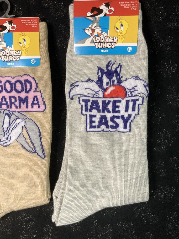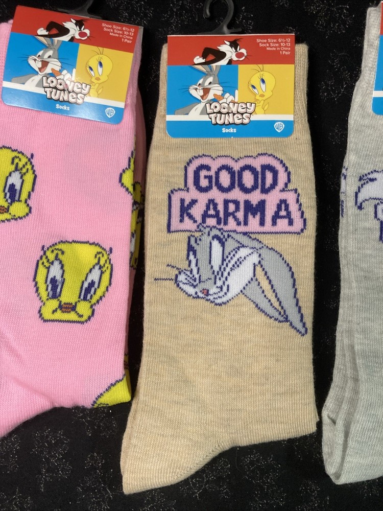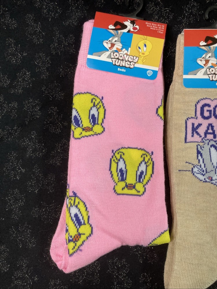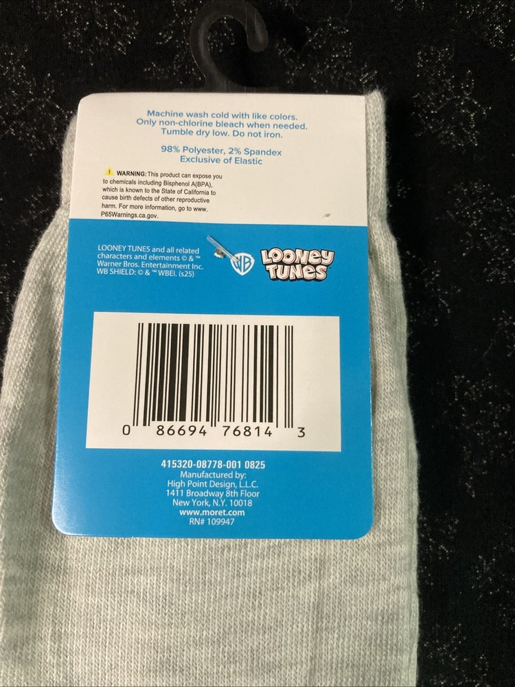 The product is a set of three pairs of Looney Tune unisex crew shoes in size 6.5 to 12, featuring popular characters from the Looney Tunes franchise such as Tweety, Sylvester, and Bugs Bunny. These shoes are perfect for fans of the Looney Tunes series and offer a fun and stylish way to show off your love for these classic characters. With a unisex design, these crew shoes can be worn by anyone who appreciates the charm of the Looney Tunes universe.