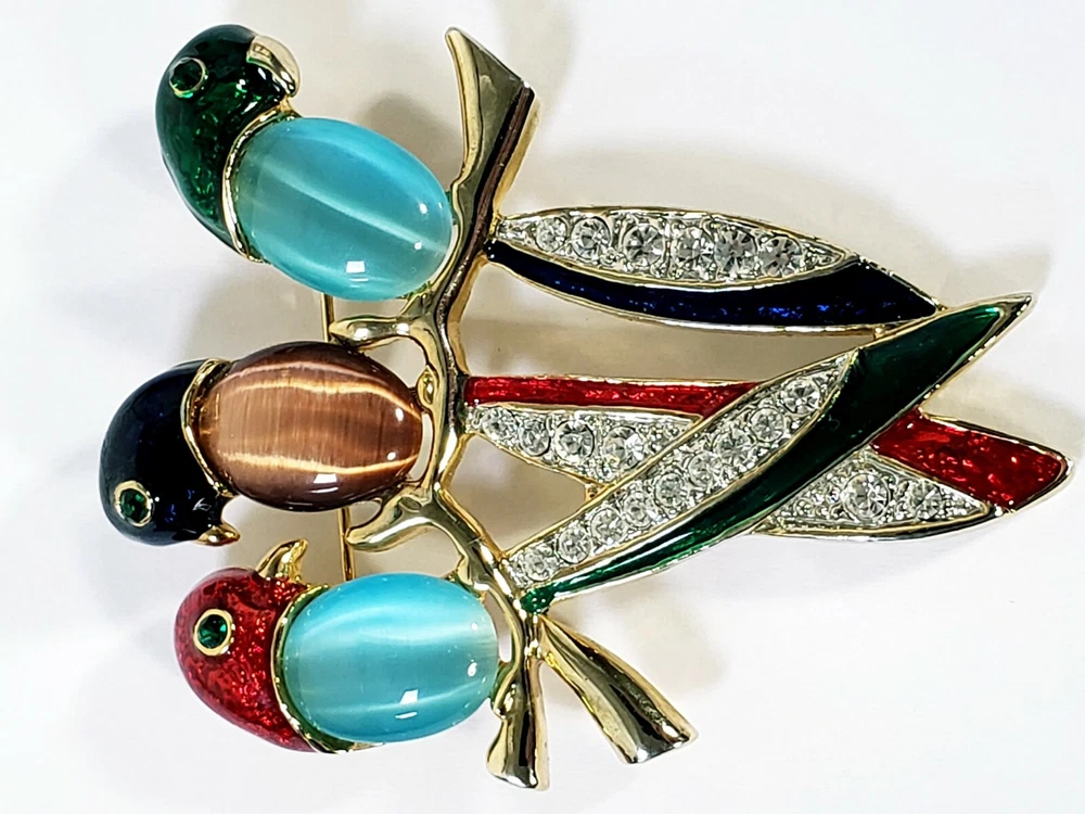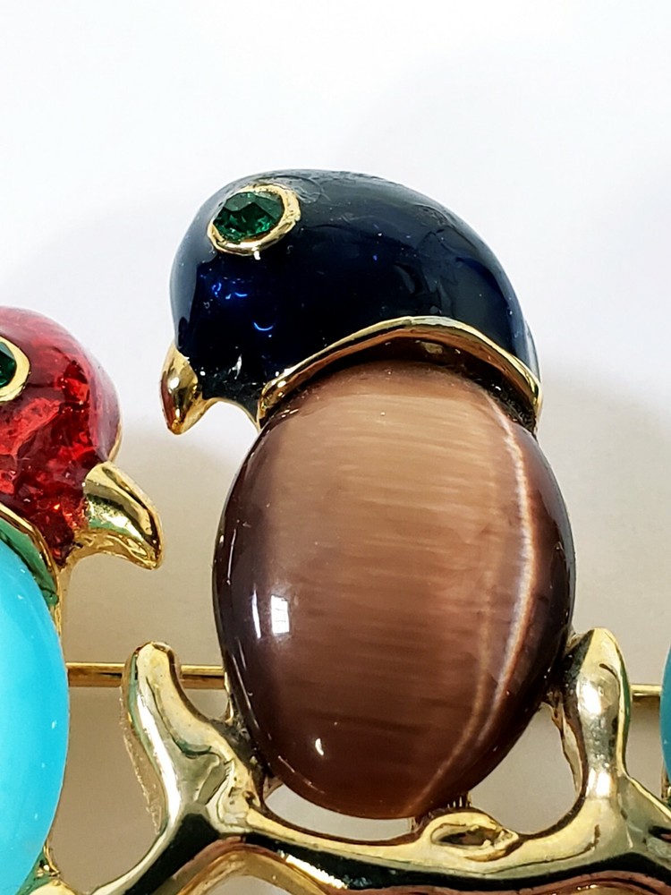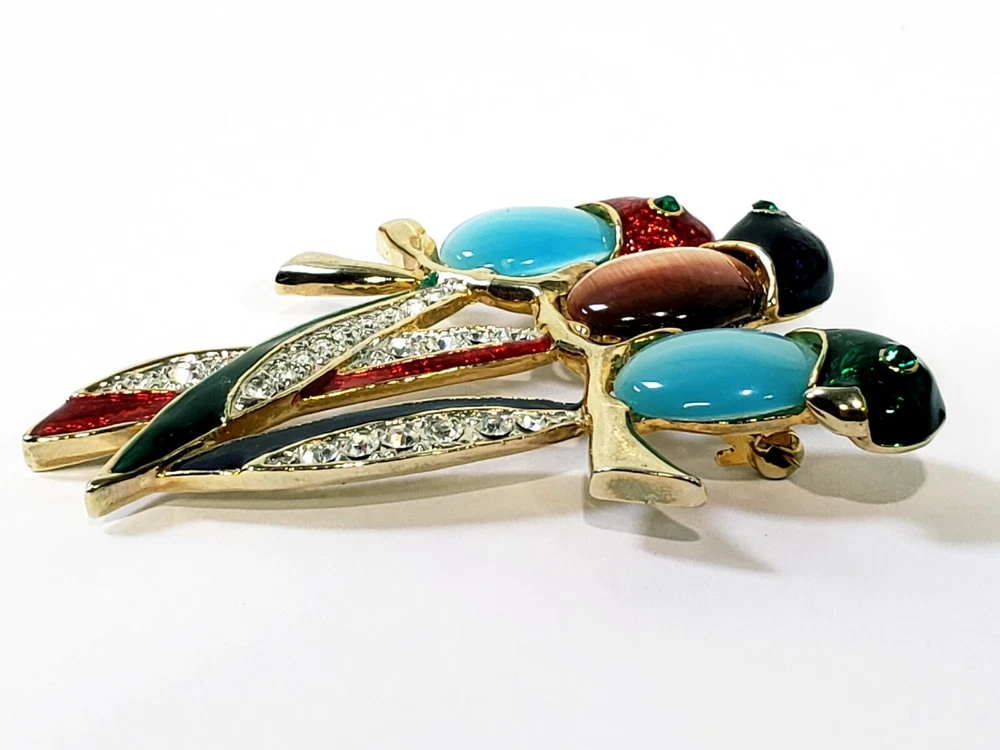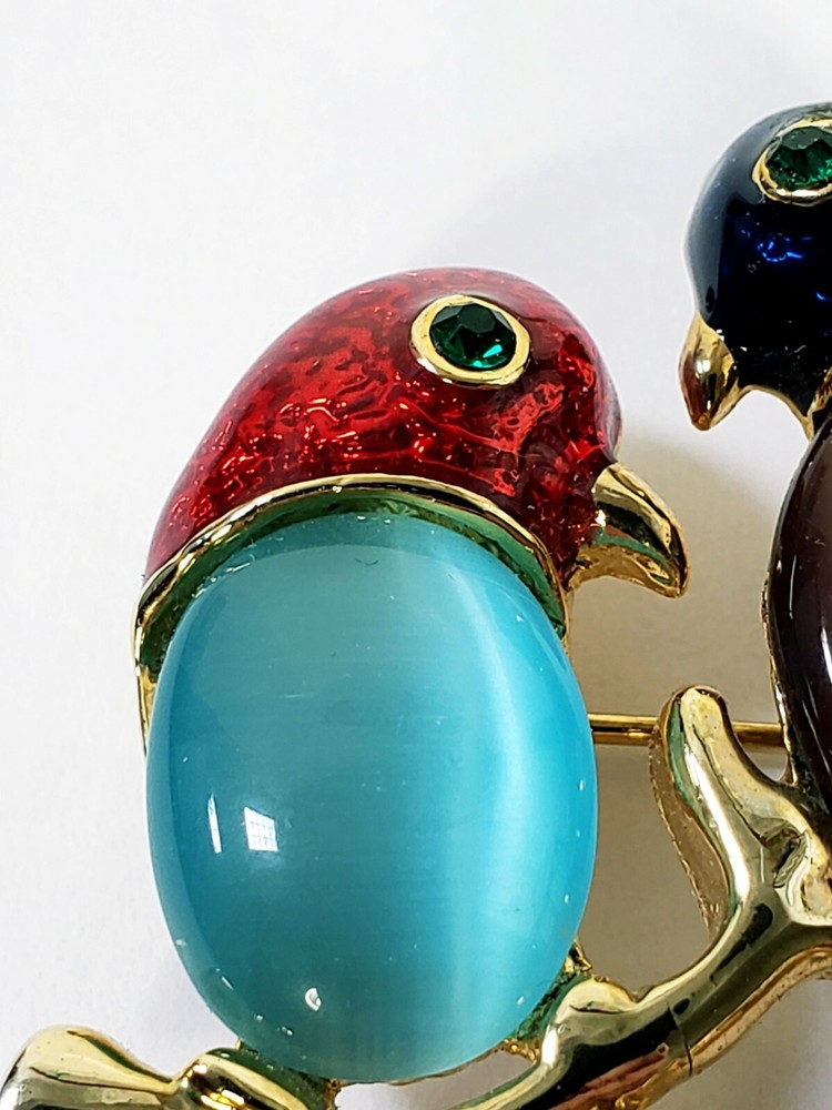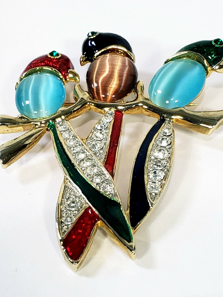 1. This brooch is absolutely stunning! The vibrant jelly belly parrots with their mesmerizing cats-eye effect really stand out. The gold tone setting and sparkling rhinestones add a luxurious touch, while the colorful enamel details make it pop. It's in perfect condition and larger than expected—definitely a showstopper! Would make a fabulous gift or a bold statement piece for any outfit. Love it!