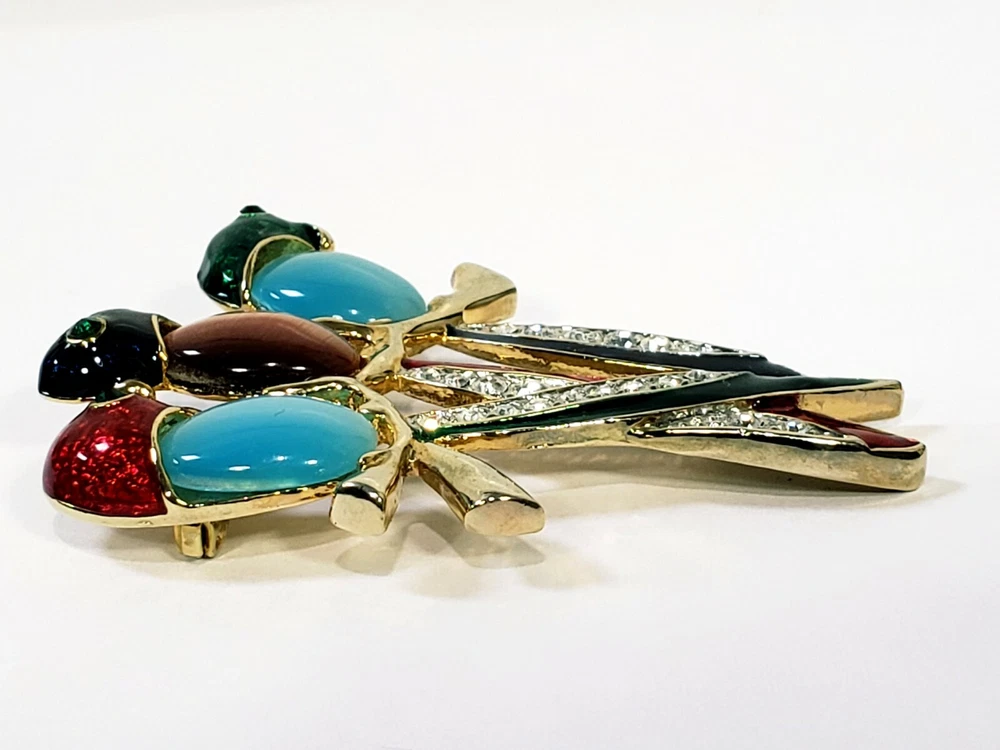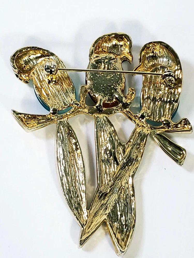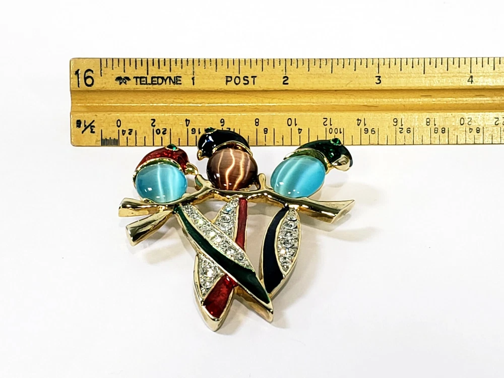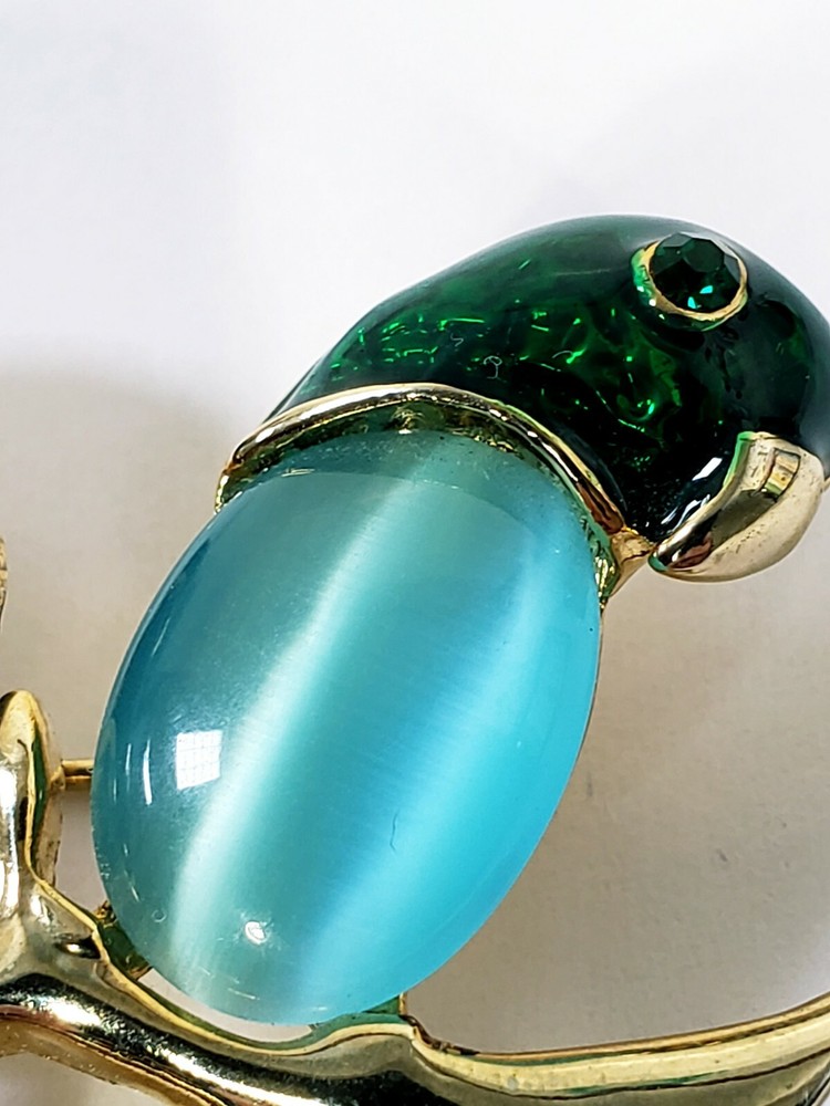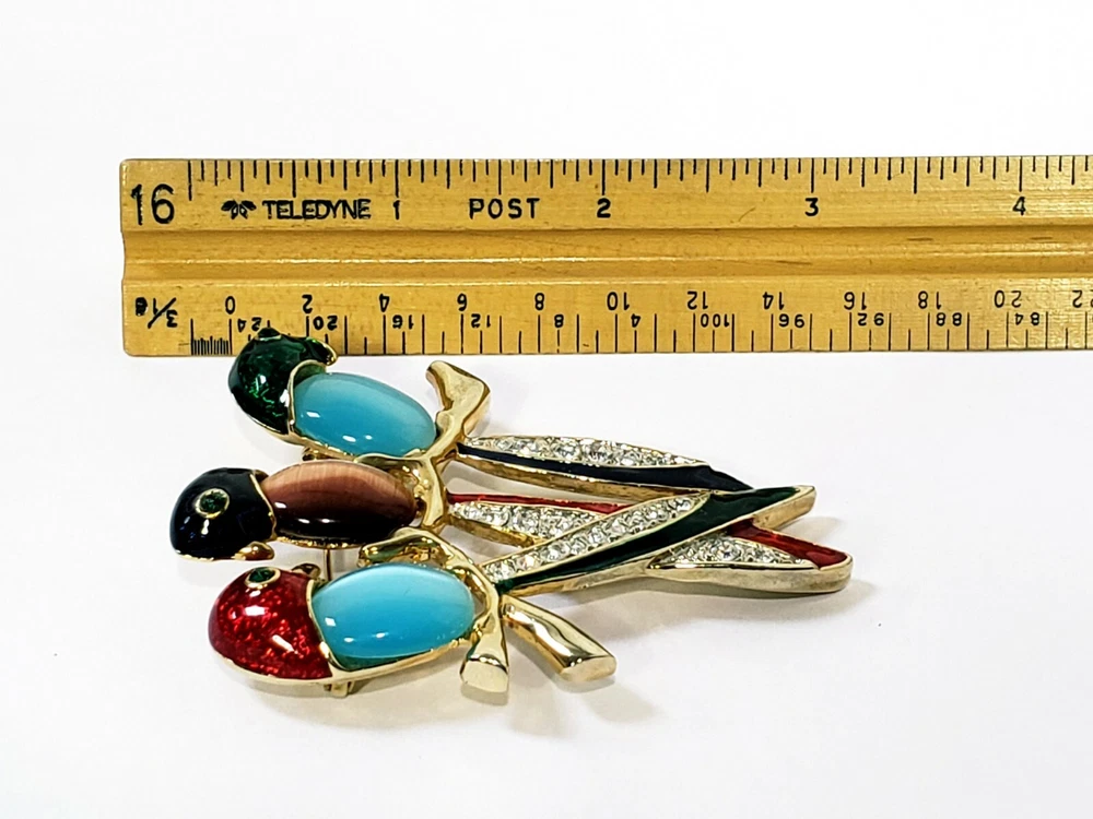 1. This brooch is absolutely stunning! The vibrant jelly belly parrots with their mesmerizing cats-eye effect really stand out. The gold tone setting and sparkling rhinestones add a luxurious touch, while the colorful enamel details make it pop. It's in perfect condition and larger than expected—definitely a showstopper! Would make a fabulous gift or a bold statement piece for any outfit. Love it!
