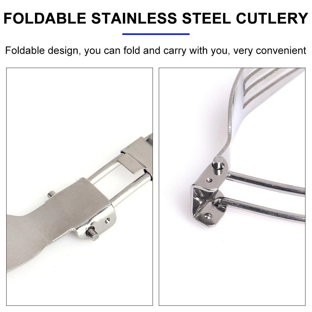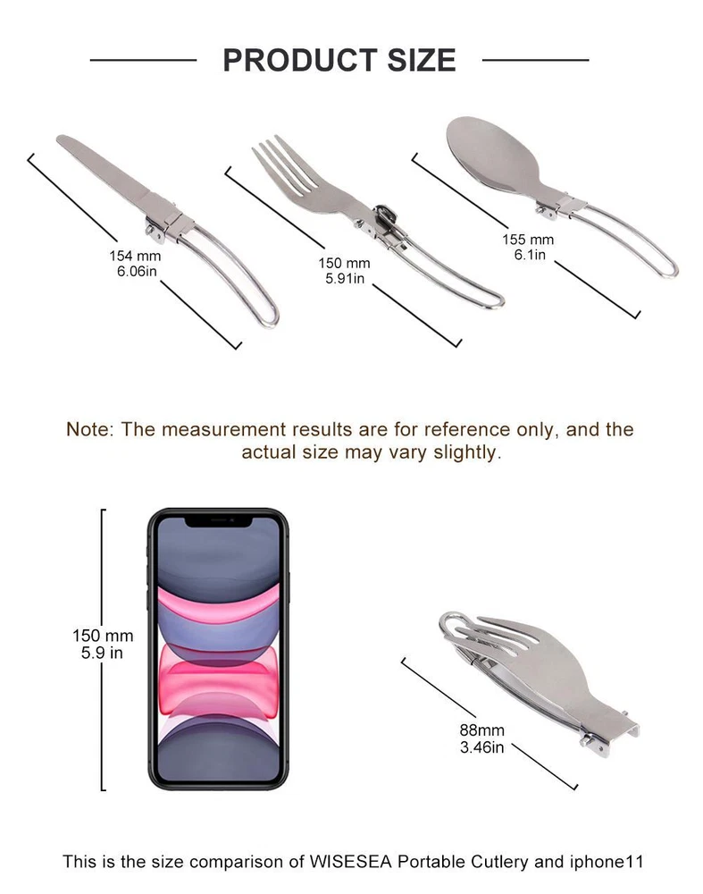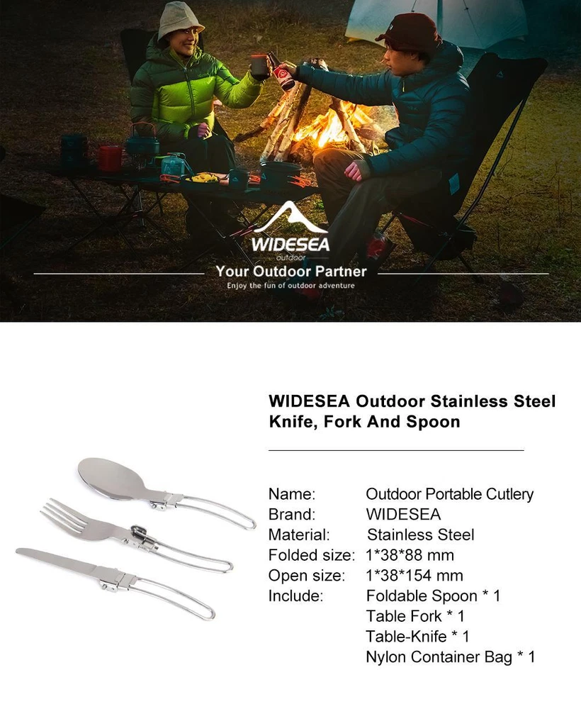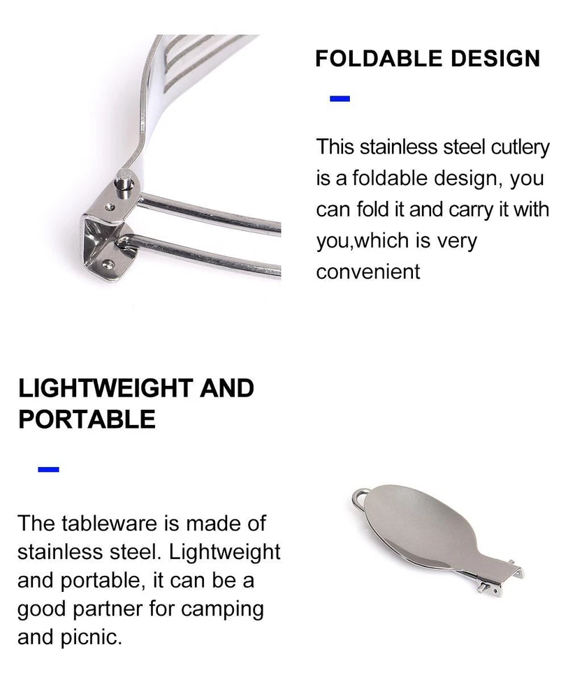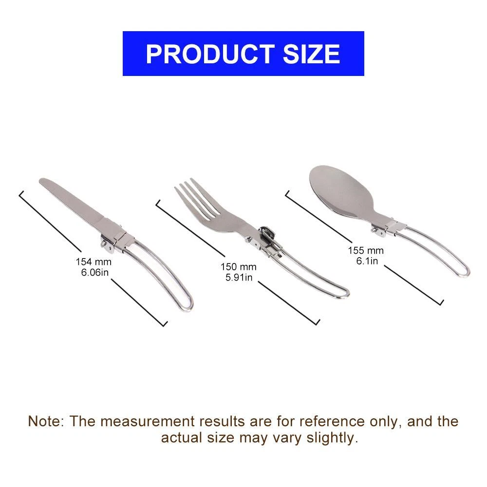 Title 3 pcs 1 set Portable Outdoor Camping Travel Picnic Foldable Stainless Steel Cutlery Set Spoon Fork Knife tableware Free Shipping Details and Description: Item: 3 pcs/set Outdoor Camping tableware cutlery Set Material: 304 Stainless Steel. Size: Folded size: 1*38*88 mm Open size: 1*38*154 mm Color: Silver Color Packing: Waterproof Nylon Container Bag. Package includes: Foldable Spoon * 1 piece, Table Fork * 1 piece, Table-Knife * 1 piece. Appliance: Your best Personal Cutlery Set for Outdoor Travel Camping Picnic Dinner. Features: 1. Foldable Design, Portable Size. 2. Stainless Steel Quality.
