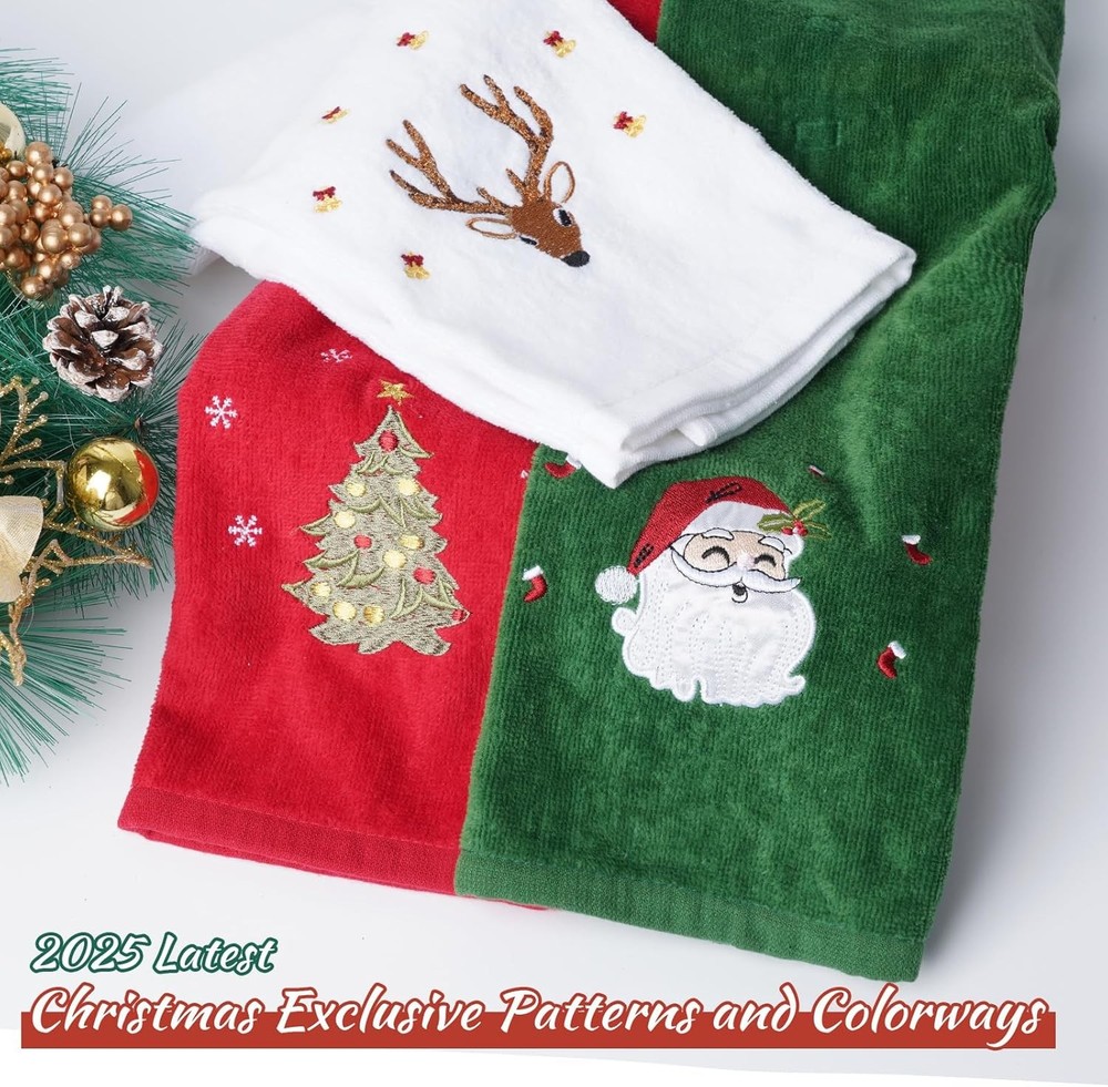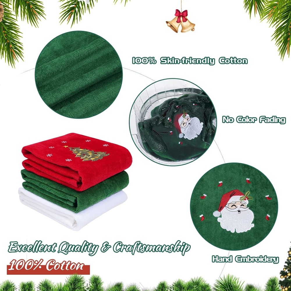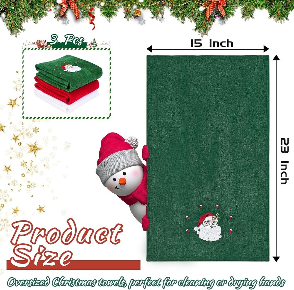 3 Pcs Christmas Hand Towels for Bathroom, 100% Cotton Soft Small, 3pcs LuxeFusion Product Description Features You will get 3 pieces of 15 x 23 inch Christmas hand towels with fun holiday embroidery patterns including Santa Claus, Christmas tree and elk. Use this hand towels to add the finishing touch to your home holidays. The Christmas hand towels for bathroom are made of 100% pure cotton fabric, which is comfortable, soft, breathable, lightweight, does not fade, and has excellent water absorption. Bathroom hand towels can easily absorb several times its weight in water to meet your basic drying needs. Each kitchen towels is finished with a double stitched hem at the border for reduced breakdown after washing while it also adds to the aesthetics of the cotton towel. For optimal longevity, we suggest using warm water and tumble dry on low heat. Patterned Christmas towels are perfect as gifts for friends and family who also like to decorate their homes at Christmas, parties, holidays, birthdays, and housewarming celebrations. Your friends or family will love them. Merry Chrismas! Perfect as hand towels, dish towels, guest towels, bathroom towels, kitchen towels, cleaning cloths and more. Product Details Color: 3pcs Brand: JUXINGDAZYF Towel form type: Hand Towel Material: Cotton Product Dimensions: 23"L x 15"W Number of Items: 3 Style: Christmas Pattern: Embroidered Special Feature: Non-toxic Theme: Christmas Product Care Instructions: Machine Wash Shape: rectangle Size: Small Unit Count: 3.0 Count Fabric Type: Cotton Item Weight: 0.25 Kilograms Set Name: 3-pack Christmas Hand Towels Manufacturer: JUXINGDAZYF Item Weight: 8.8 ounces Free Shipping All orders ship free and fast to your doorstep. Easy Returns Satisfaction guaranteed. 30-day returns, no questions asked. 24/7 Support Contact us anytime; we’re here to help, day or night. Brought to you by LuxeFusion – Quality you can trust.