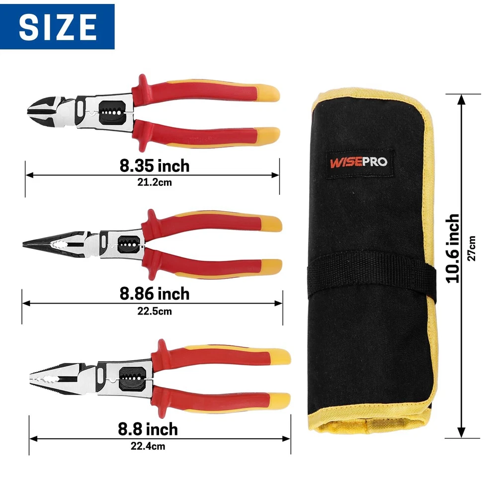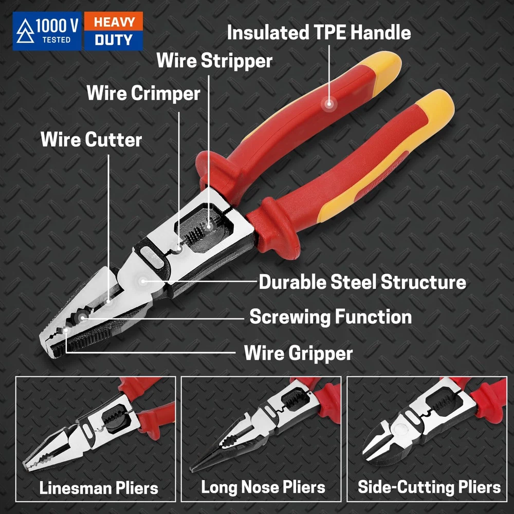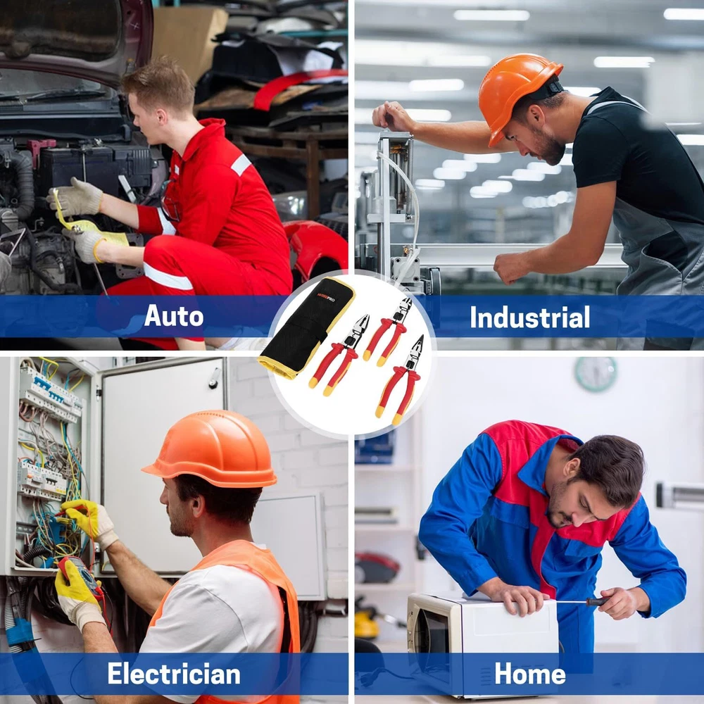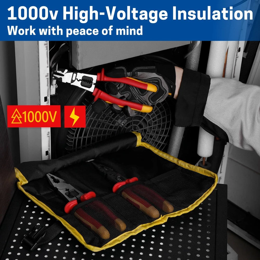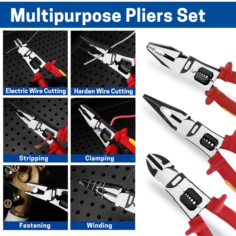 Multipurpose Insulated Pliers Set: You will receive a 6-in-1 insulated lineman's pliers, a 6-in-1 insulated needle nose pliers, a 3-in-1 insulated diagonal cutting pliers, and a durable storage pouch. Each pliers is designed with 1000V high-voltage insulation to ensure safety during electrical work. Safety Insulation: The handles of the insulated pliers are made of TPE insulation material and have undergone rigorous 1000V voltage testing, providing users with safe protection in high-voltage environments. This ensures reliable safety during electrical work, reducing the risk of electric shock. Durable Materials: The body of the insulated pliers set is made of 55 steel, with a specialized blackening and water-grinding surface treatment. This not only ensures the tool’s hardness and durability but also provides excellent corrosion and rust resistance. Precision and Efficiency: The wire stripping holes are suitable for various sizes of solid wires (12, 14, 16, 18 AWG) and stranded wires (14, 16, 18, 20 AWG), allowing for precise stripping without damaging the core. Additionally, the insulated tool set features an eccentric design, making operation effortless and improving work efficiency. Wide Application: The durability, versatility, and safety of the insulated pliers make them an excellent choice for various tasks, such as home repairs, electrical maintenance, and circuit installation. For electricians and repair professionals, the insulated electrician pliers set can ensure both work efficiency and operational safety.