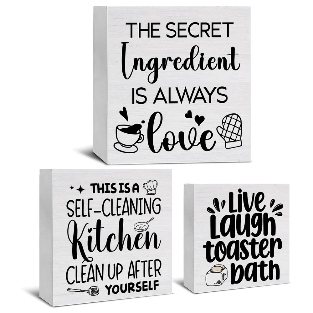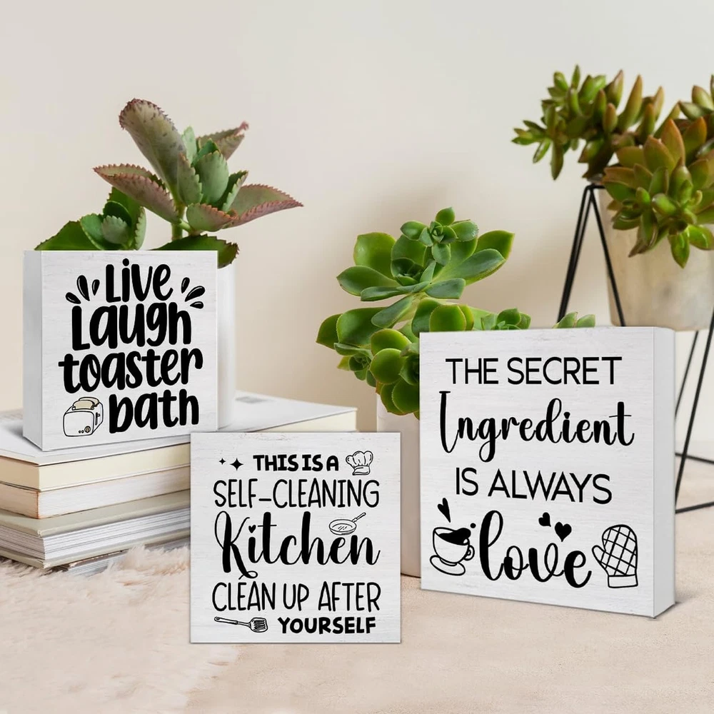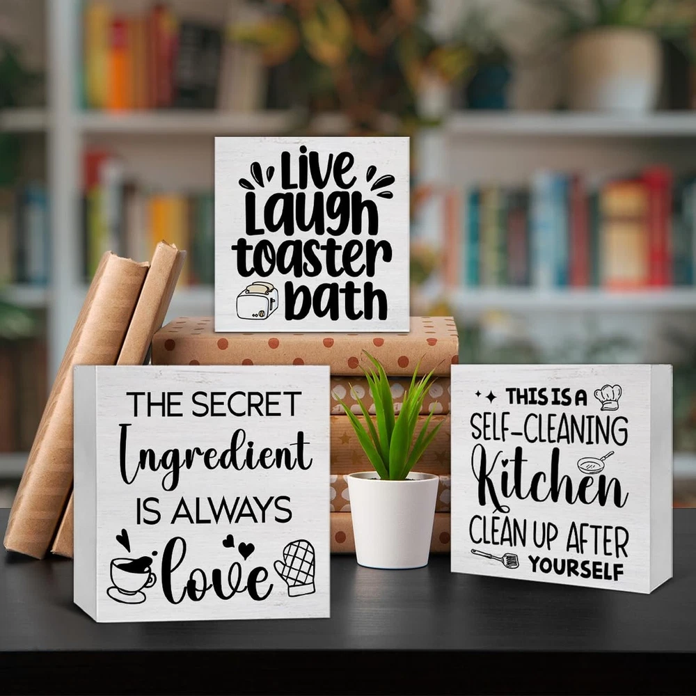 3 Pcs Kitchen Decor for Counter Funny Kitchen Island Wall Decorations Farmhouse Home Wood Sign for Desk Table Shelf Tiered Tray Decor Product Details Color: Kitchen Brand: SOFEGY MPN: SOFEGY 01112 UPC: Does not apply EAN: Does not apply Color: Kitchen Brand: SOFEGY Style: Modern Product Dimensions: 5.6 x 5.6 x 0.04 inches Item Weight: 0.882 ounces Manufacturer: SOFEGY Country of Origin: China Item model number: SOFEGY 01112 Package content: This ornament set contains 3 wood signs that measure approximately 5.7 x 5.7 inches, 5 x 5 inches, 4.3 x 4.3 inches, which is just the right size, especially for display Suitable occasions: They can be decorated as a group or displayed separately. They are Ideal accents for a farmhouse home decor sign, office desk decor, or a cute shelf decor home accessory, which can not only stand freely on the desk fixtures counter or tables, but can be hung on the wall and meet your diverse decoration needs, especially layered trays Great Gift: This decorative wood sign is a great gift choice for yourself, friends, bosses, family, colleagues, kids birthdays, anniversaries, weddings, engagements, graduations, Thanksgiving, Halloween, Christmas, or any other holiday High-Quality Material: These decors are made of natural wood material with clear printing, firm in construction and smooth to touch, not easy to break or corrode. You can keep them for a long time Extensive Places to Display: You can use these wooden box signs to decorate your home, farmhouse, kitchen, bedroom, living room, dining room, bathroom, laundry, garage, office, coffee bar, club, restroom, garden and more Suitable occasions: They can be decorated as a group or displayed separately. They are Ideal accents for a farmhouse home decor sign, office desk decor, or a cute shelf decor home accessory, which can not only stand freely on the desk fixtures counter or tables, but can be hung on the wall and meet your diverse decoration needs, especially layered trays
