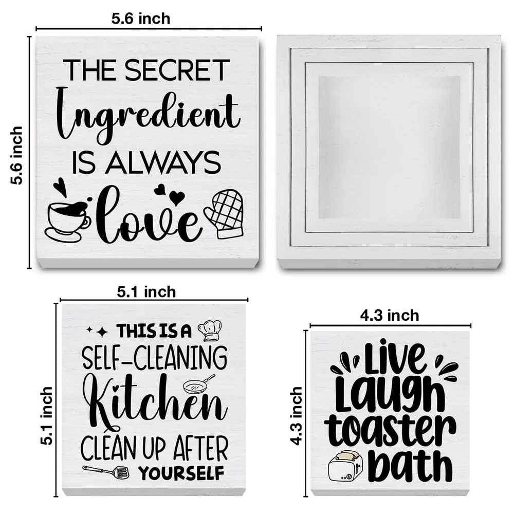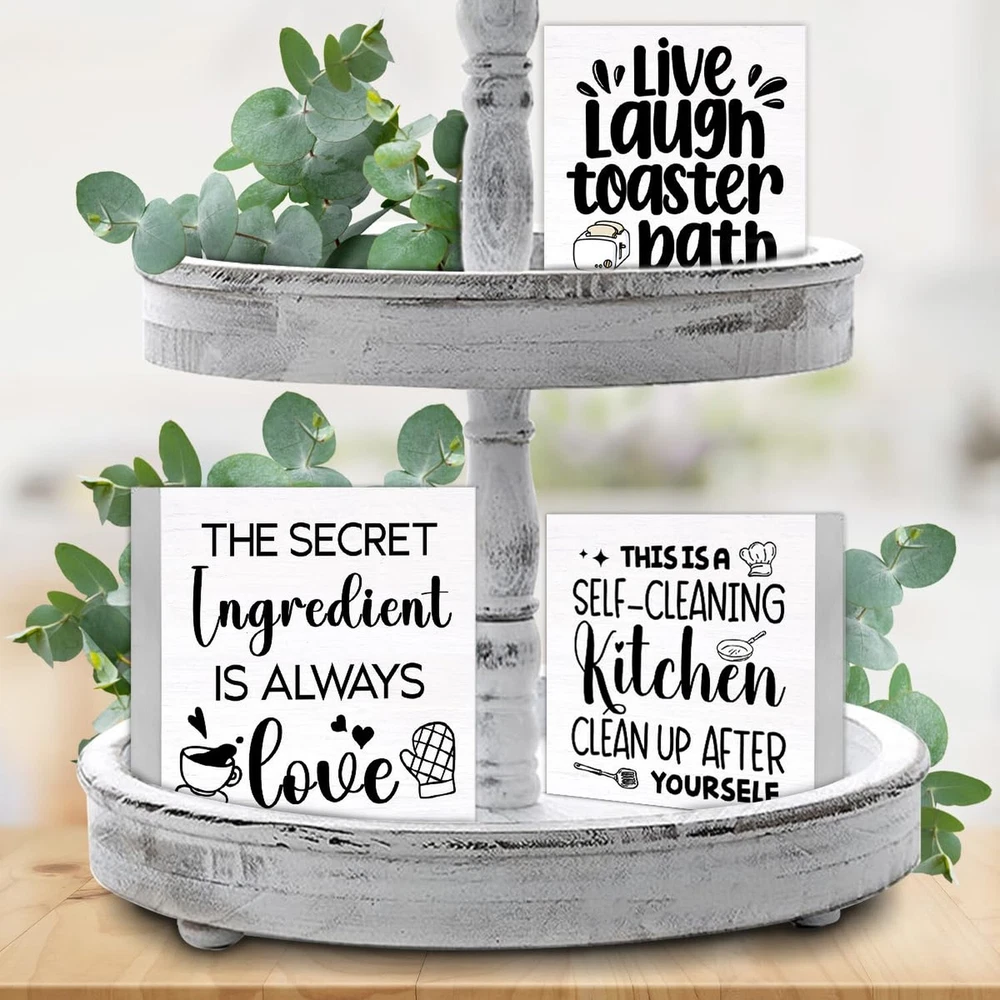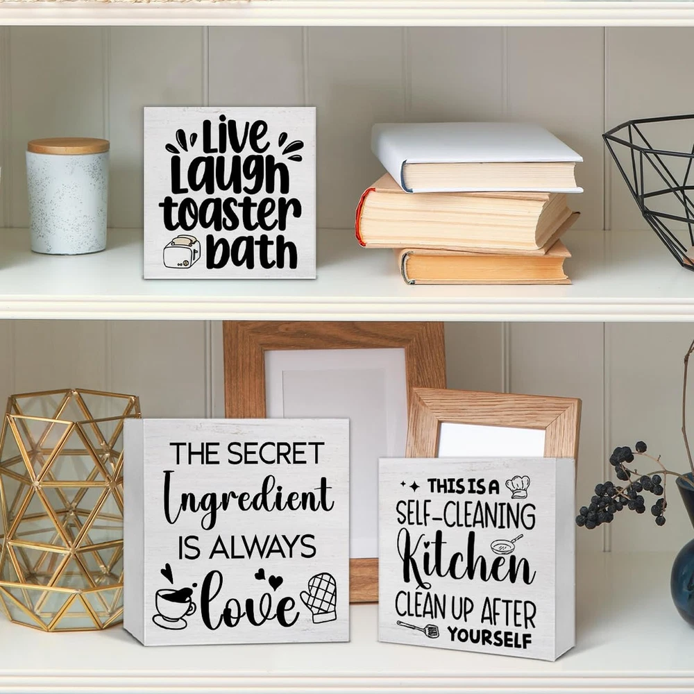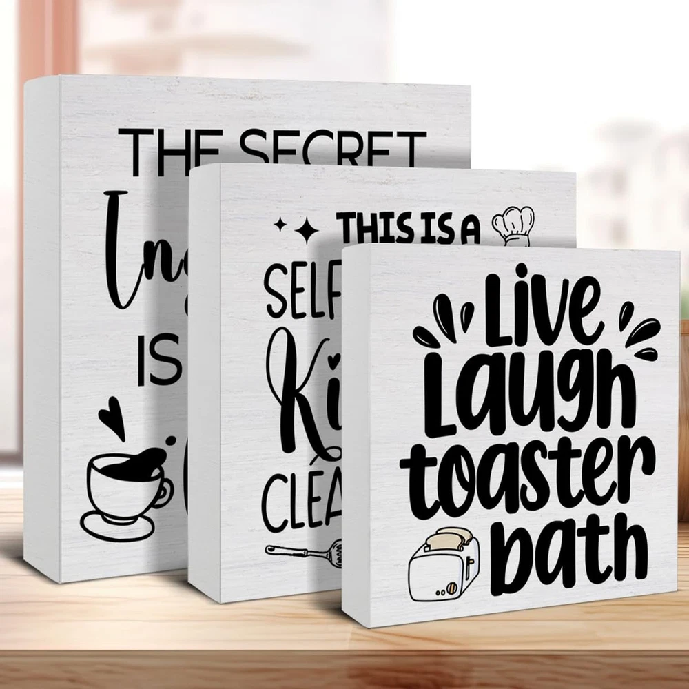 3 Pcs Kitchen Decor for Counter Funny Kitchen Island Wall Decorations Farmhouse Home Wood Sign for Desk Table Shelf Tiered Tray Decor Product Details Color: Kitchen Brand: SOFEGY MPN: SOFEGY 01112 UPC: Does not apply EAN: Does not apply Color: Kitchen Brand: SOFEGY Style: Modern Product Dimensions: 5.6 x 5.6 x 0.04 inches Item Weight: 0.882 ounces Manufacturer: SOFEGY Country of Origin: China Item model number: SOFEGY 01112 Package content: This ornament set contains 3 wood signs that measure approximately 5.7 x 5.7 inches, 5 x 5 inches, 4.3 x 4.3 inches, which is just the right size, especially for display Suitable occasions: They can be decorated as a group or displayed separately. They are Ideal accents for a farmhouse home decor sign, office desk decor, or a cute shelf decor home accessory, which can not only stand freely on the desk fixtures counter or tables, but can be hung on the wall and meet your diverse decoration needs, especially layered trays Great Gift: This decorative wood sign is a great gift choice for yourself, friends, bosses, family, colleagues, kids birthdays, anniversaries, weddings, engagements, graduations, Thanksgiving, Halloween, Christmas, or any other holiday High-Quality Material: These decors are made of natural wood material with clear printing, firm in construction and smooth to touch, not easy to break or corrode. You can keep them for a long time Extensive Places to Display: You can use these wooden box signs to decorate your home, farmhouse, kitchen, bedroom, living room, dining room, bathroom, laundry, garage, office, coffee bar, club, restroom, garden and more Suitable occasions: They can be decorated as a group or displayed separately. They are Ideal accents for a farmhouse home decor sign, office desk decor, or a cute shelf decor home accessory, which can not only stand freely on the desk fixtures counter or tables, but can be hung on the wall and meet your diverse decoration needs, especially layered trays