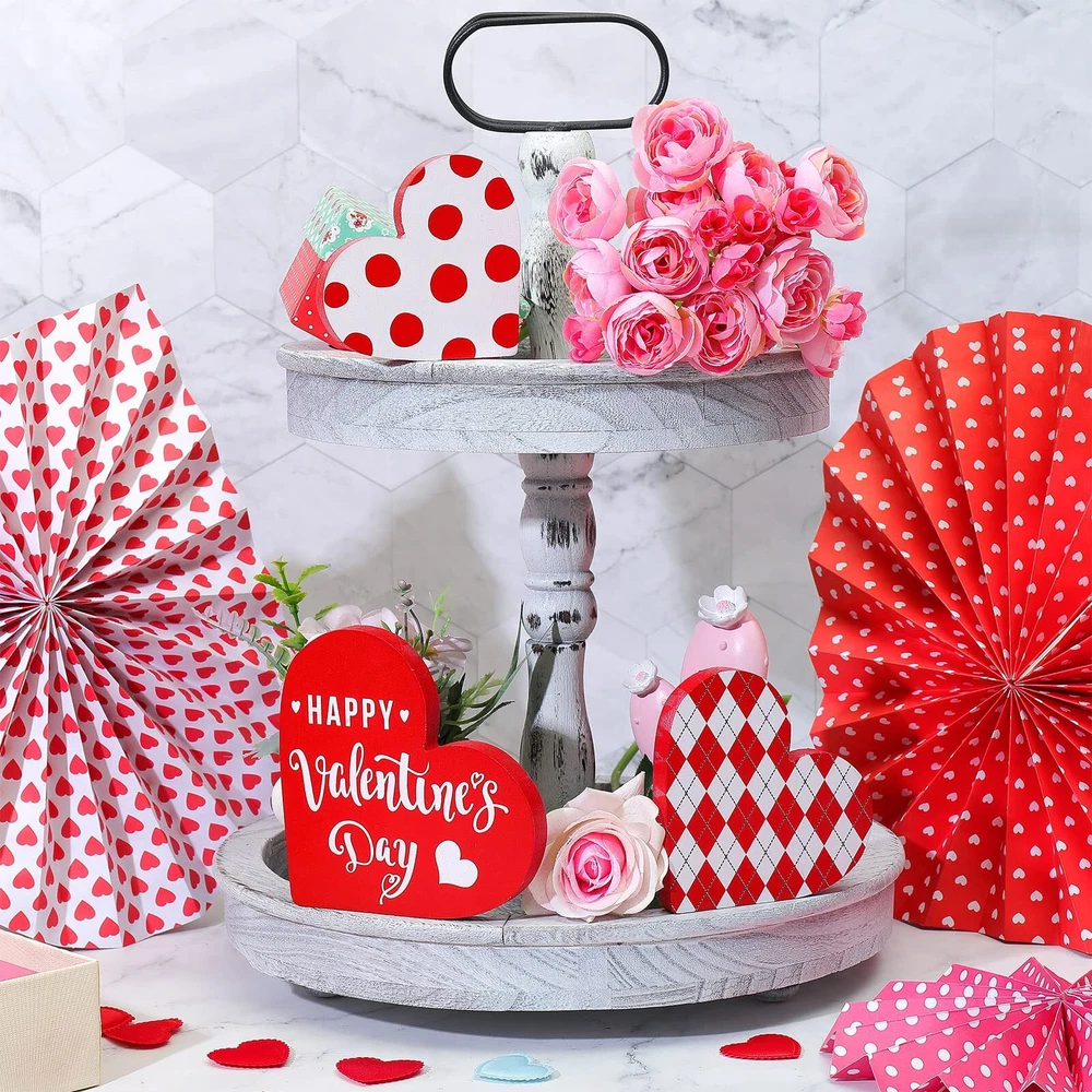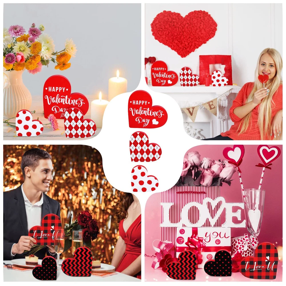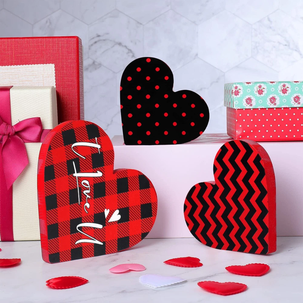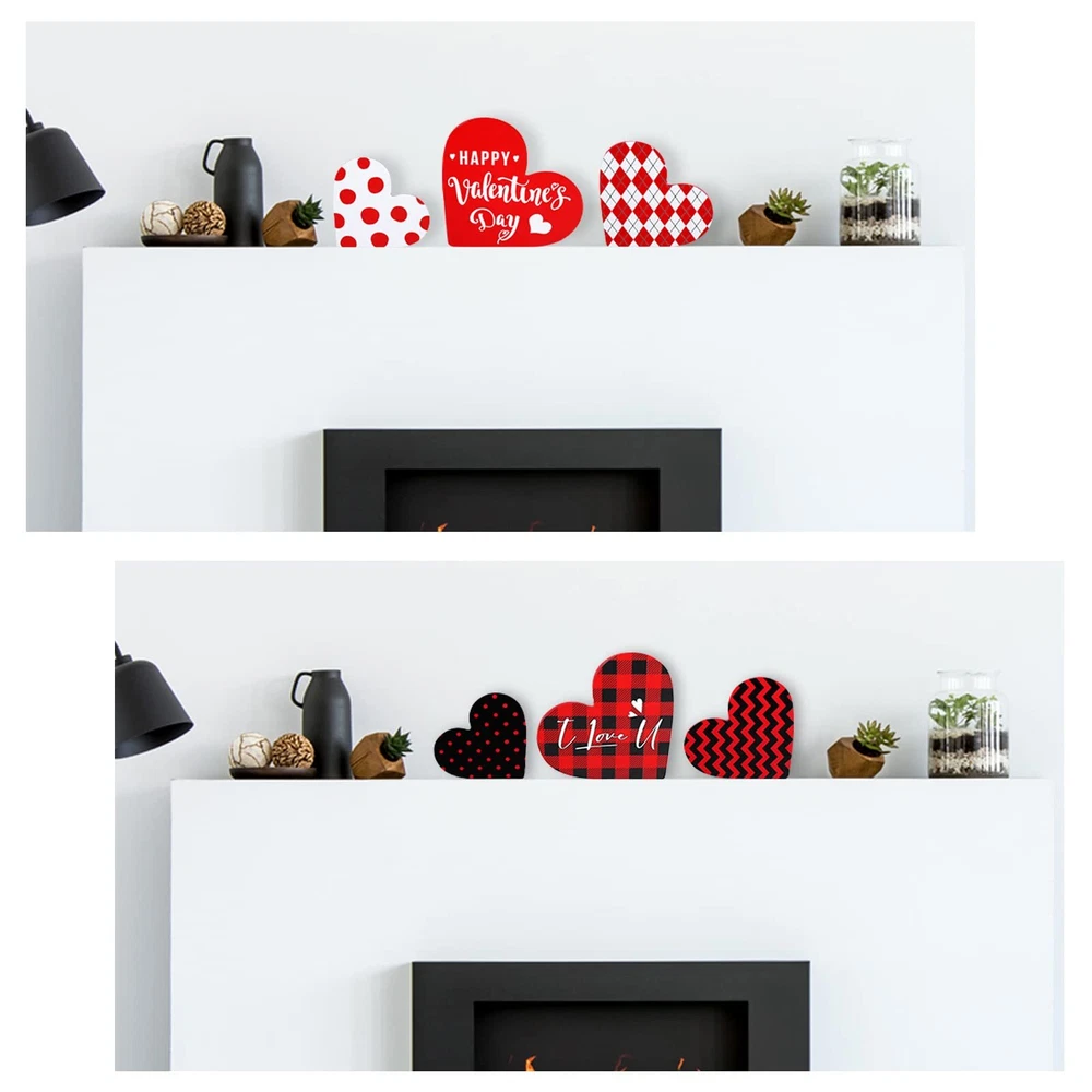 Features: Extensive applications: The heart shaped wooden pieces can be placed anywhere you want for a stunning Valentine's Day display, like your living room, kitchen, bedroom, hallway office, bathroom, hotels, bars, restaurants, and more. Reliable quality: Made of wood, the home table top sign is so firm and sturdy, hard to break or deform, without loose burrs and slivers, able to provide a long time service for you. Moreover, this valentine's day sign is of high color fastness and the color will hardly fade away. Specifications: Material: wood Color: as shown in the pictures Height of large size: 12 cm/ 4.72 inches Height of medium size: 10 cm/ 3.94 inches Height of small size: 8.5 cm/ 3.35 inches Thickness of all size: 1.2 cm/ 0.47 inches Package includes: 3 x Heart table decorations ( in different heights and designs) Notes: Manual measurement, please allow slight errors on size. The color may exist slight difference due to different screen displays. Sufficient quantity: the package includes 3 pieces of Valentine's Day signs in various adorable designs, sufficient enough to satisfy your needs for home decoration on Valentine's Day, add a warm and sweet touch to your room Double Sided Printing Design: the rustic sign decor is characterized by the large heart shaped body, and double sided printed with different romantic buffalo plaid patterns in vibrant colors of red, white, black, which presents a strong visual impact and looks quite charming Easy to use: the heart wood decor has three different heights, namely 12 cm/ 4.72 inches, 10 cm/ 3.94 inches, and 8.5 cm/ 3.35 inches, and it is designed with a flat bottom, 1.2 cm/ 0.47 inches in thickness, which enables it to stand upright on most flat surfaces and tabletops without supporting Create a romantic atmosphere: these wooden decorative signs can fill your home or office with love and lots of festive spirits, happily celebrating Valentine's Day with the one you adore, to warmly welcome your guests into your love filled home Romantic and delicate present: not only does the heart table decorations enhance the interior decorations of your home or workplace, but also make a sweet present for professing your love to your classmates, colleagues, friends on Valentine's Day, birthdays, or anniversaries