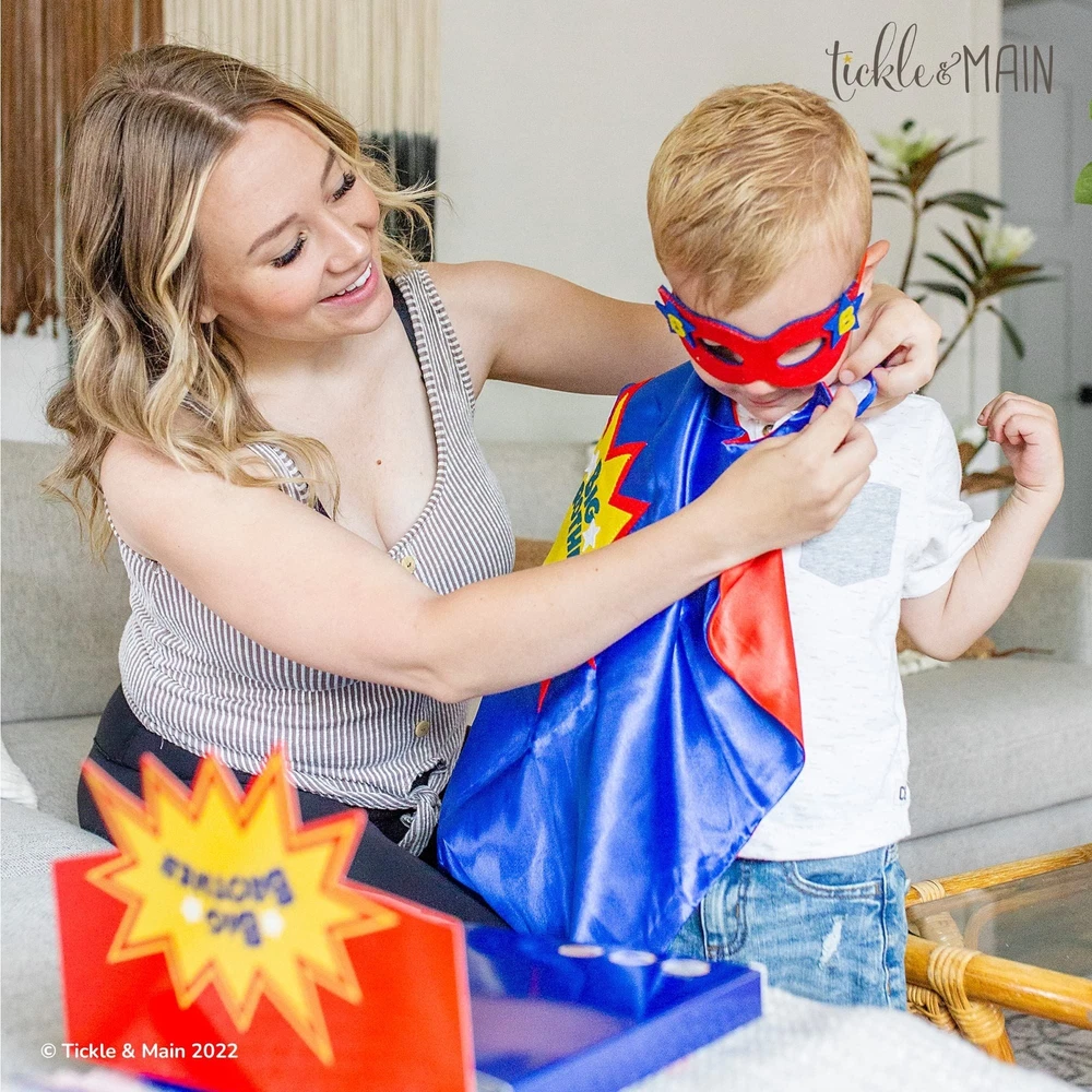 AccStation Introducing the perfect gift set for any little boy who's about to become a big brother! This 3-piece set from Tickle & Main has everything a new big brother needs to feel special and excited about his new role. First, there's the colorful storybook that comes with the set. This book is designed to educate kids about what it means to be a big brother and how to interact with a new younger sibling. It's a fun and engaging way for kids to learn about their new role in the family, and the colorful illustrations will keep them entertained as they read. But that's not all - this gift set also includes a child-sized superhero cape and matching mask! Made from 100% satin, the cape is blue on the outside and red on the inside, and measures 23” long (from the neck down) and 32” along the bottom hem. It's the perfect size for kids aged 3 to 7, and is sure to make any little boy feel like a superhero. The matching mask is double-layer felt, and is also child-sized. It's the perfect accessory to go with the cape, and will help your little one feel even more like a real superhero. With this gift set, your child will be ready to save the day and take on any challenges that come his way! And best of all, this gift set comes ready for gifting in its own custom box. So whether you're buying it for your own child or as a gift for someone else, you can be sure that it will arrive looking beautiful and ready to be opened. It's the perfect gift for any little boy who's about to become a big brother, and is sure to be cherished for years to come. So if you're looking for a gift that's both fun and educational, look no further than this 3-piece gift set from Tickle & Main. Your little one will love reading the storybook, wearing the superhero cape and mask, and feeling like a true superhero as he takes on his new role as big brother. Recommended ages 3 to 7. 3 Piece Gift Set Includes Big Brothers are Superheroes Book, Satin Cape, Mask FOR BIG BROTHER-TO-BE: Celebrate your big brother-to-be with the perfect gift set! Discover delightful big brother gifts for toddlers, including an enchanting illustrated book, a cuddly plush toy for comfort, and a fun-filled activity book. This thoughtful package will prepare and excite your child for his new role. Let him know how proud you are with a big brother cape he'll cherish for years. Get your new big brother gift set now and make his journey extra special! COMPLETE SET: Get ready for the ultimate big brother experience! This 3-piece set, featuring a storybook, felt mask, and satin superhero cape, is the perfect gift for toddlers becoming big brothers. The engaging storybook introduces the concept in a fun way. The mask and cape empower them to embrace their new role and live out their superhero dreams. Delight any young boy with this special big brother gift set, making their exciting journey even more memorable. A PRACTICAL STORY: This heartwarming story emphasizes the role of an older brother as a role model, protector, and friend. With colorful illustrations and relatable stories, it's perfect for toddlers, teaching valuable lessons about sibling love & respect. Complete with a big brother cape, it's the ideal present to show how much he cares and celebrates the big brother to be. A must-have for any family welcoming a new addition! JUST THE RIGHT SIZE: Introducing the ideal big brother gift! This 100% satin cape, measuring 23" long and 32" wide, guarantees a comfortable fit for kids aged 3 to 7. Complete with a child-sized double-layer felt mask, it's a fantastic addition to dress-up boxes and Halloween costumes. Pair it with a delightful big brother book for toddlers, and you'll make your little hero feel extraordinary! Ideal for big brothers-to-be. PERFECT HOLIDAY GIFT: Delight your little ones this holiday season with our specially curated children's gift sets, perfect for toddler Christmas gifts and baby Christmas gifts. Each set is designed with thoughtfulness and packaged for immediate gifting, making it a hassle-free choice for busy parents. Our range of toys fosters creativity, joy, and adventure, providing exciting opportunities for learning. Make this Christmas unforgettable for your little ones with our charming gift sets.