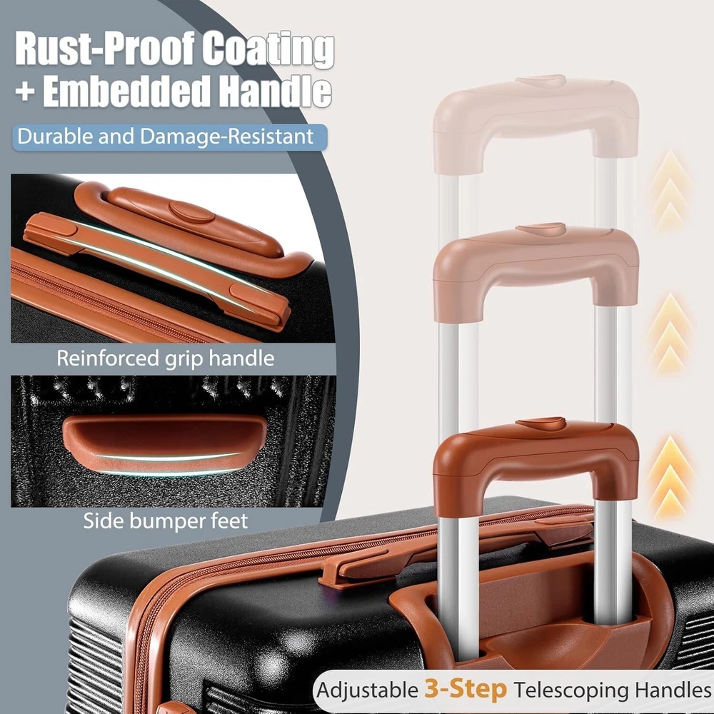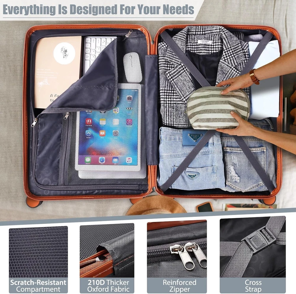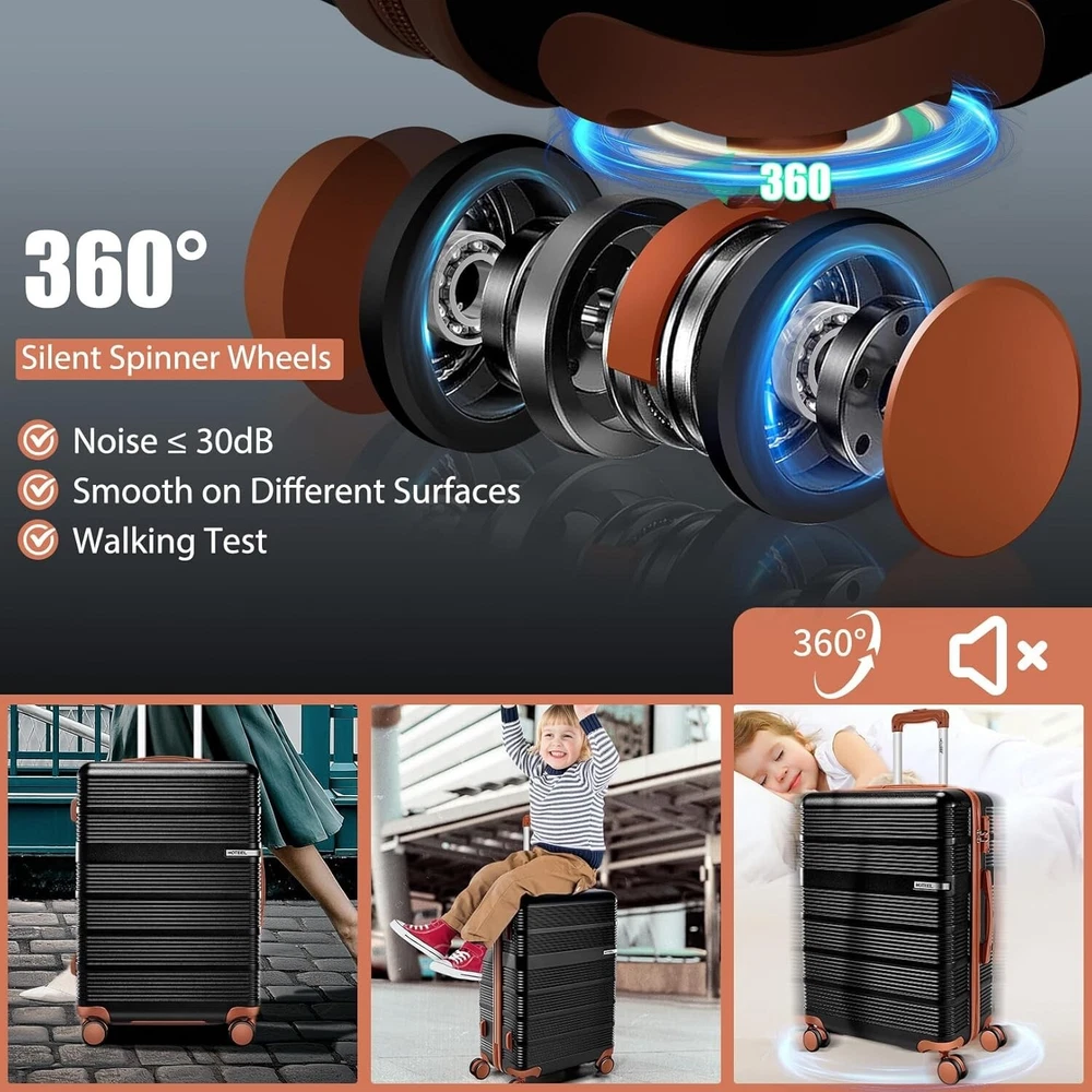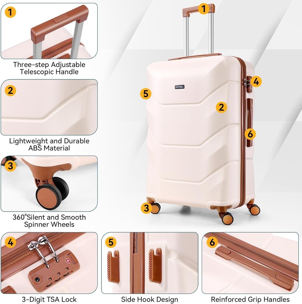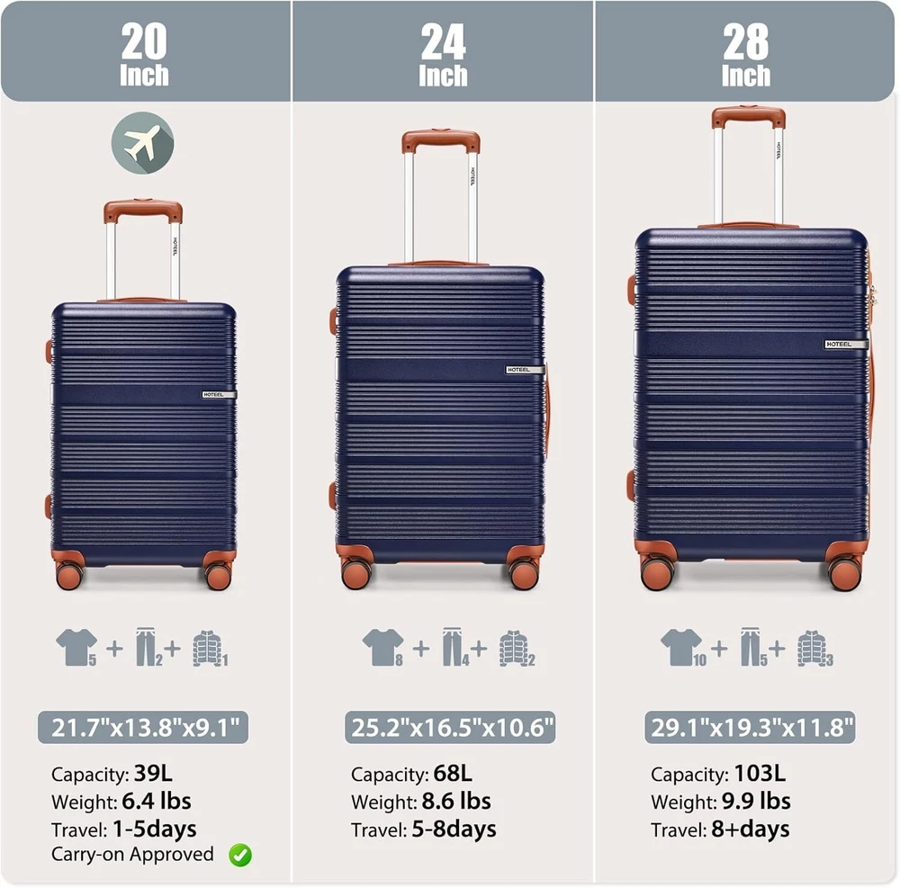 Product information Durable & Lightweight: 3-piece luggage set features thickened ABS material, perfectly balancing durability and lightweight. Reinforced hardshell ensures superior impact protection, while scratch-resistant texture maintains appearance through countless trips. Luggage available in three sizes (20"/24"/28") for all your travel needs. Wet & Dry Separation: Luggage features a book-style opening design with full zipper compartment and cross straps to effectively prevent items from shifting. Contains waterproof storage pockets and mesh pockets for wet and dry separation, making it easy to organize clothes, accessories and travel essentials. 3-Stage Handle & Hook Feet: Luggage set is equipped with an adjustable and durable ergonomic handle that is corrosion-resistant and rust-resistant, and retracts smoothly without shaking. Luggage top and side handles are thickly padded for a comfortable lifting and carrying experience. Suitcase set hook-style feet on the side of the suitcase protect the case, provide stable support, and can also hang accessories. Smooth & Silent Mobility: Luggage set is equipped with durable 360° silent spinner wheels, which can achieve smooth, stable and easy movement on any surface. Suitcases with wheels upright rolling design eliminates arm strain, making it perfect for business trips and extended travel. TSA Lock & Security Zippers: Luggage equipped with TSA-approved 3-digit combination lock ensures your belongings are secure while allowing TSA agents to inspect when necessary without damaging the lock. Luggage sets high-quality explosion-proof zippers provide lasting security and complete protection for your valuables, giving you peace of mind throughout your journey.