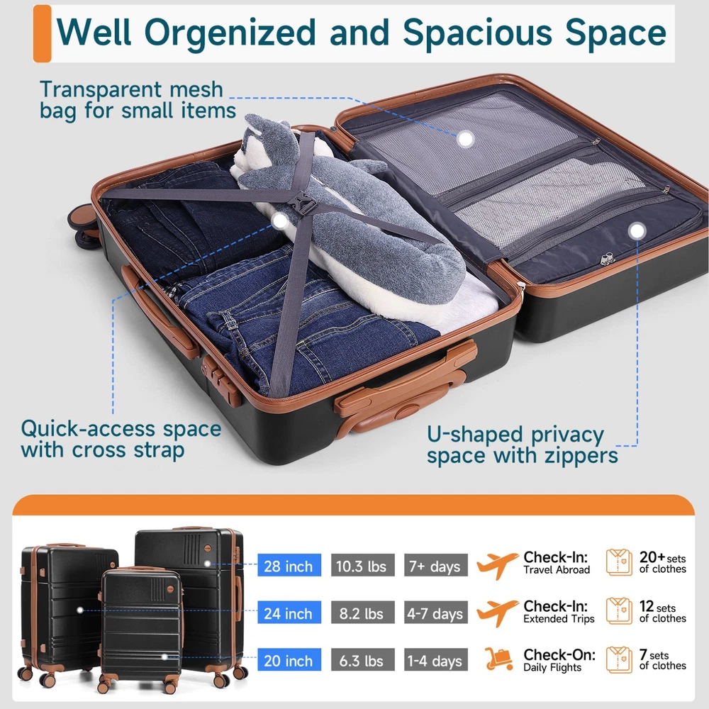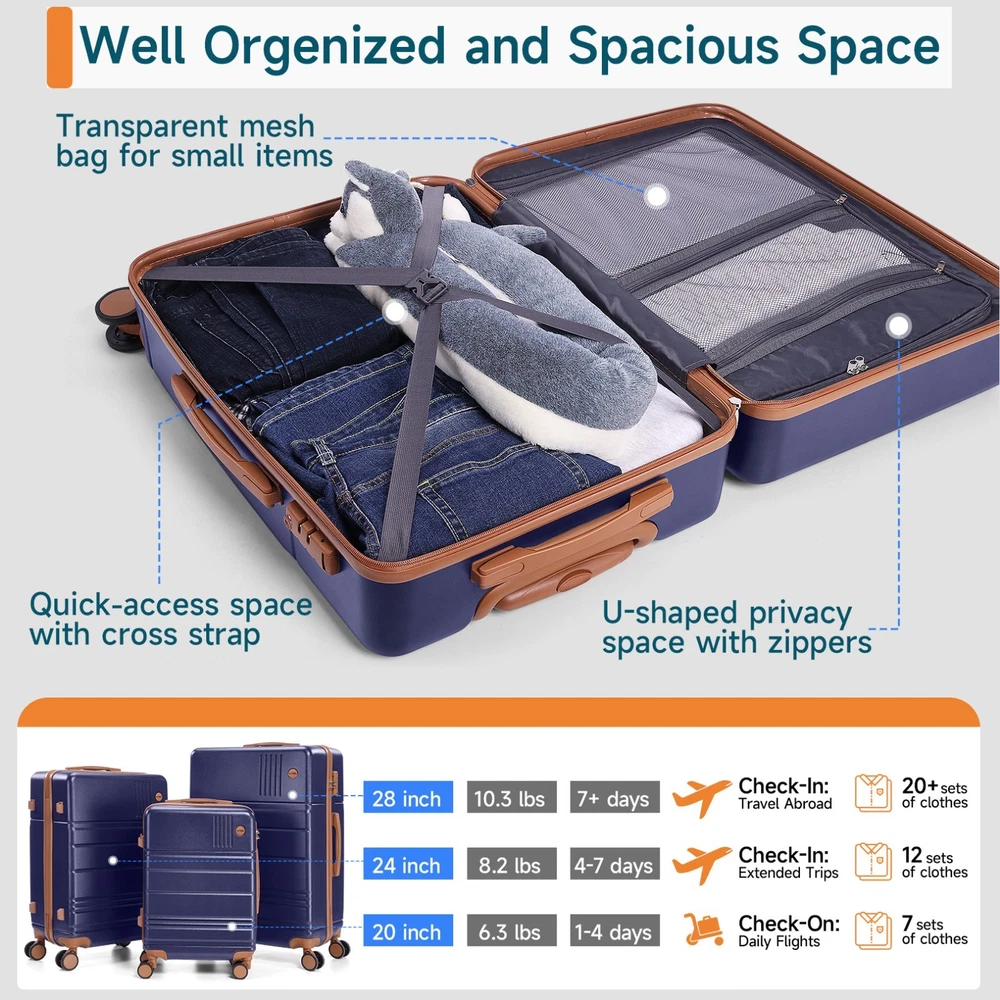 Description Luggage Sets 3 Piece, ABS+PC Hard Shell Suitcases with Wheels, TSA Aproved Lock and Convient Side Hook, Travel Suit Case Set for Men and Women 1 Set for Multiple Needs: The Luggage sets include a 20-inch carry-on suitcase, 24-inch and 28-inch checked suitcases, You can choose suitcase of different sizes according to your specific needs, or take all your suitcase when you go out with family and friends. TSA Lock and Hard Shell: Made of scratch-resistant ABS+PC composite material, the suitcase ensures reliable protection for your belongings and long-lasting appearance. The TSA-approved lock safeguards personal items and avoids violent openings during security checks. Well-Organized Expandable Space: The suitcase interior features zippered compartments, cross straps, and a mesh bag for an efficient organization, keeping items secure and clutter-free. Practical Additional Features: The rubber top/side handles ensure a comfortable grip when lifting, and 4 raised bottom feet keep the suitcase stable and protected from ground dirt during placement.The two feet at the top are hook-shaped and are used to secure small items. Professional Service Team: Contact our customer service team for immediate assistance with any product or delivery inquiries. We prioritize quick and tailored solutions to ensure your complete satisfaction. Payment 1 . We accept PayPal only. 2 . Payment should be completed within 4 (Four) days of auction closing. Or unpaid dispute will be filed for closing auction. 3 . Sales Tax of 9% will be applied for orders shipped within the state of California 4 . We will leave a positive feedback immediately after payment is received. We appreciate a positive feedback as much as you do. If for some reason there is any issue with the purchase, please contact us prior to leaving feedback, and we will be glad to work with you to have it resolved. Shipping 1 . We Ship to United States ONLY. 2 . Ship from two warehouses and only to eBay ADDRESS. Package handling only takes 1 business day at our warehouse, so please make sure entering correct payment and shipping information before checking out. Once your payment is completed, pls leave ebay note if the changes are needed before we send the product. 3 . Truck company: 3-8 business days. | USPS: 2-6 business days. | UPS/FEDEX: 3-5 business days. 4 . Lccal pick up is available. Warranty and Guarantee 1 . All of our items come with a 30-day return policy. We ensure all our items are new and in excellent condition prior to shipping. In the event that you receive the item that is not to the standards above, please contact us via e-Bay messages. All returns must be in new original condition as received and should be shipped with delivery confirmation 2 . We ONLY accept the return for original package. Please make sure that item has NO man-made sabotage. Used items will not be accepted for return. 3 . We reserve the right to refuse any returns for objective reasons. 4 . All NON-seller mistake returns for refund are subject to 20% re-stocking fee and buyer should pay for the round-trip shipping fee. (E.g. you bought wrong model or wrong color). Feadback 1 .Any problem after receiving our goods,please contact us before leaving Neutral/Negative feedback.We promise to help you solve it asap,and make you feel satisfactory absolutely. 2 . Please DO NOT leave negative feedback without asking for help. Please do not leave negative or neutral feedback if you haven't received item in 30 days, because we have mentioned the shipping time repeatedly.