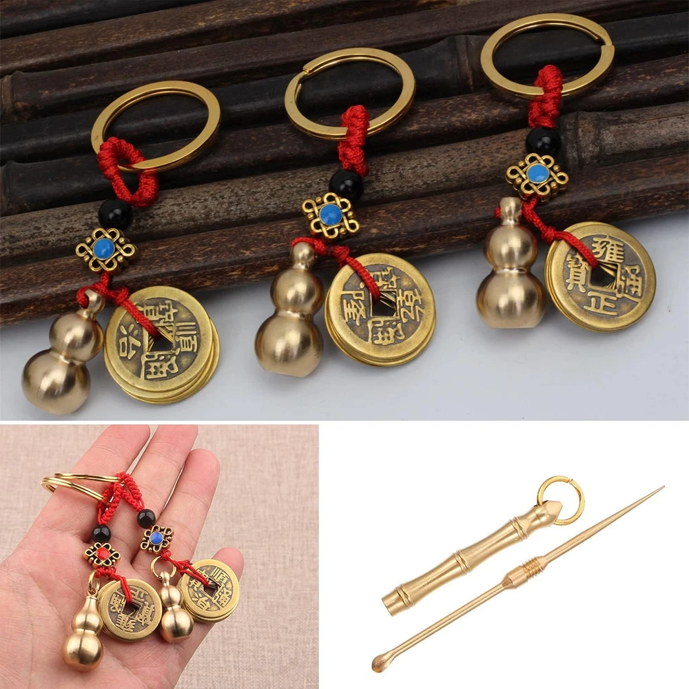 3 Pieces Chinese Gourd Brass Wu Lou Keychains with 1 Pcs Brass Ear Spoon Keychai