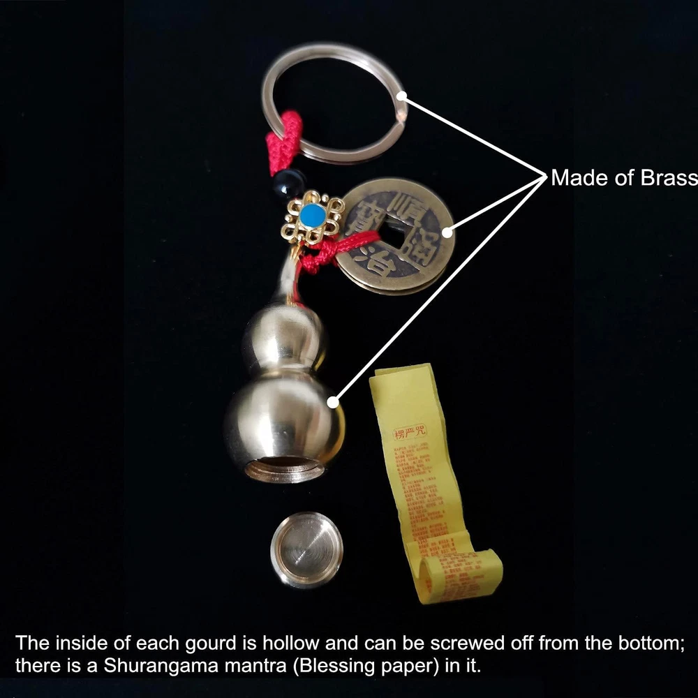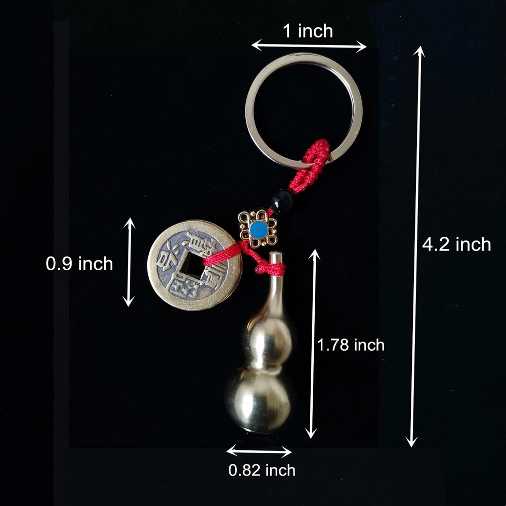 Material: The Gourd, Ancient Chinese Coins and Key Ring are made of brass,very durable and sturdy to use; Light in weight and portable to carry or store Size: The size of Wu Lou is 1.78 x 0.82 inch; The diameter of Ancient Coin is 0.9" and Keyring is 1", totall length is approx.4.2" Unique and Exquisite Design: Designed with brass gourd pendent, copper coins, black bead.The inside of each gourd is hollow and can be screwed off from the bottom and there is a Shurangama mantra (Blessing paper) in it Symbol of Good Fortune:This keychain is composed of a gourd and 5 different ancient Chinese coins.Gourd / Calabash / Wu Lou is the mascot of the "life giver" in Asian traditional culture, it means wealth and good luck Comes with 5 Different Ancient Chinese Coins:Imitation Ching-Dynasty-style coins, each with the clear name of one emperor,such as Shunzhi, Kangxi, Qianlong, Yongzheng and Jiaqing; people wear them and believe they can attract good luck and enhance positive Chi for health and wealth Widely Applications: You can hang it in your car, office, home to help you attract wealth, prosperity, success and all good things; Also can be used as a perfect blessing gift for your family, honey, children and friends as party favors, gift bag fillers and etc Package Included: 3 pieces brass gourd key chains with key rings; 1 pcs Brass Ear Spoon Keychain with small key ring This keychain is composed of a gourd and 5 different ancient Chinese coins.Gourd / Calabash / Wu Lou is the mascot of the "life giver" in Asian traditional culture, it means wealth and good luck. The Wu Lou (Calabash) in its original form is a vegetable and when dried was traditionally used to store wine or water which is how it got its name “giver of life”. The inside of each gourd is hollow and can be screwed off from the bottom and there is a Shurangama mantra (Blessing paper) in it.You can also DIY your own blessing card and put it in the Wu Lou. Specifications: Material: Brass Size: - The size of Wu Lou is 1.78 x 0.82 inch; The diameter of Ancient Coin is 0.9" and Keyring is 1",totall length is approx.4.2"; - Ear Spoon Keychain is 3 x 0.2 inch Weight: Wu Lou Key chain: 0.9 Ounce / 25g each; Ear Spoon Key chain: 0.2 Ounce / 5g; Package Weight: 2.9 Ounces / 84g. Color & Style: as pictures shown Package Included: 3 x Brass Wu Lou Keychains; 1x Brass Ear Spoon Keychain with toothpick Note: Please allow slight errors in size due to manual measurement.