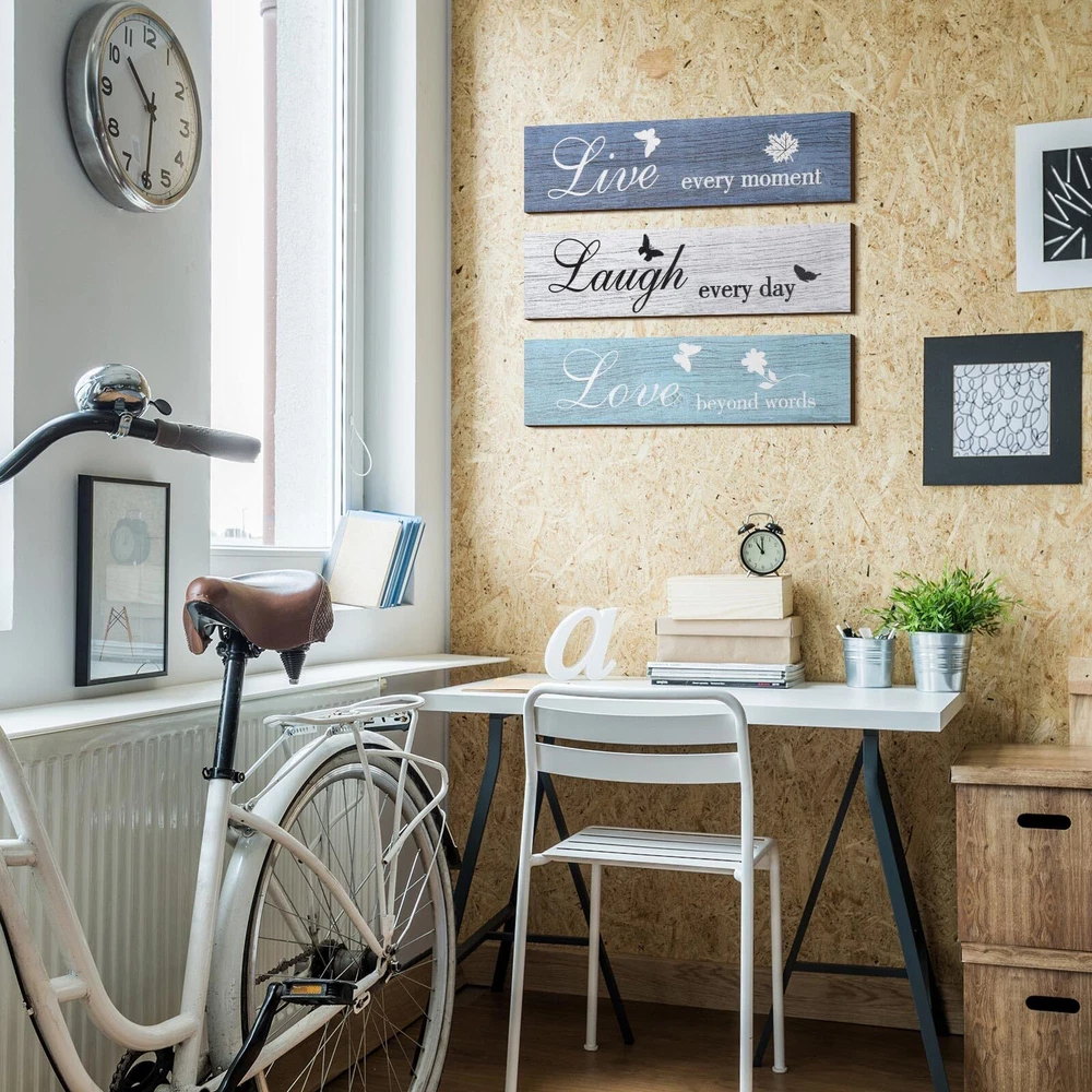 Features: Extensive application: These live love and laugh wooden plaques can be often seen at home, office, restaurant, cafe, bookstore, dessert , library or other places, not only can you hang them in living room, bedroom, study room, aisle, corridor, yard and so on, also place them directly on the shelf or cabinet, feasible for you to put them with other decorations there. Housewarming gifts: These artistic words of hanging wall wooden signs symbolize harmony, happiness, encouragement and unity, suitable for you to give them to your friends or family as considerate presents who are seeking home decorations, which can bring a warm feeling for their home. Specifications: Material: wood Color: as the picture shown Rustic wall wooden signs size: approx. 30 x 7.6 cm/ 12 x 3 inches Rustic wall wooden signs thickness: approx. 0.5 cm/ 0.2 inches Package includes: 3 x Rustic wall wooden signs Notes: Please allow a little error on the size due to manual measurement. The colors may exist slight difference due to different screen. What you will get: the package includes 3 pieces rustic wooden signs in different words about live, love and laugh, enough quantity for you to meet your daily decorations and make replacements, also packed well, avoiding being broken during transportation Sturdy material: these wooden wall decoration signs are made of quality wood, characterized with durability and good wooden texture, not easy to deform or break, also touch smoothly due to fine workmanship and polishing, which can be decorated repeatedly for a long time Easy to use: these are serrated hangers on the back of the wooden wall sign (each end has ), convenient for you to hang it on the wall or other places that have hooks, also easy for you to take off, meanwhile, the hanger design can help to prevent the wall from being imprinted with glue and leaving a trace Rustic design: these farmhouse wooden wall sign decorations are printed with cute butterflies and different quotes, namely [Live every moment], [Laugh every day] and [Love beyond words], suitable for you to decorate, which can create a style for your home Proper size: these rustic farmhouse wooden signs measure approx. 30 x 7.6 cm/ 12 x 3 inches and approx. 0.5 cm/ 0.2 inches in thickness, appropriate size and light weight for you to hang by yourself at home, also portable for you to carry and , would not take too much space