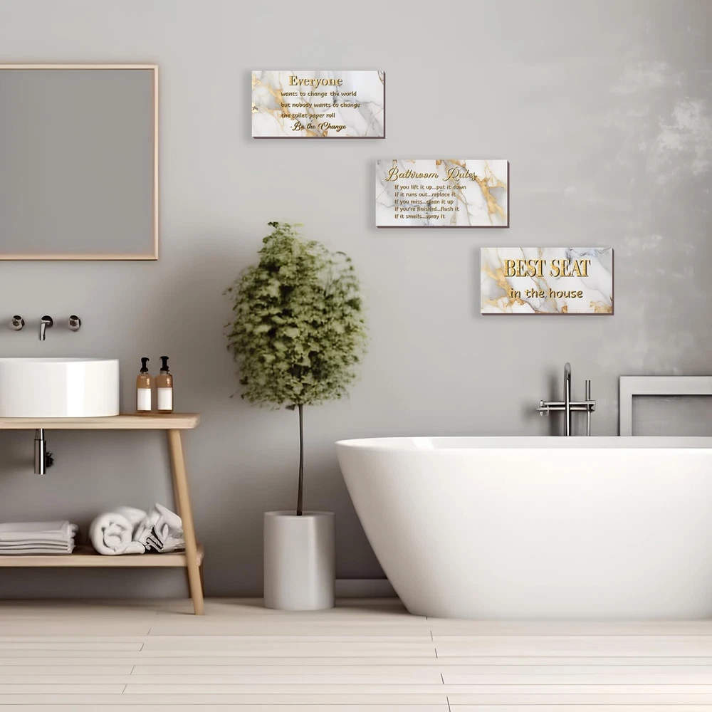 3 Pieces White Gold Bathroom Decor Bathroom Rules Wall Art White Gold Bathroom Rules Best Seat in The House Rustic Farmhouse Wooden Sign for Bathroom Toilet Wall Decor (White Gold 10x5) Product Details Color: White Gold Brand: DONFENTHY MPN: DON0012WHITE GOLD UPC: Does not apply EAN: Does not apply Color: White Gold Brand: DONFENTHY Material: Wood Theme: Flower Recommended Uses For Product: Bathroom decor and enhancement Mounting Type: Wall Mount Product Dimensions: 10"L x 5"W Shape: Rectangular Style: Rustic Item Weight: 8.8 ounces Elevate Your Bathroom Decor with a Set of 3: A trio of charming white gold bathroom rule wall decor pieces, each adorned with a captivating white gold flower background and a delightful phrase, like "Best Seat in the House." Suitable for a cohesive and stylish bathroom upgrade. Ideal Dimensions for Bathroom Elegance: Crafted at an ideal size of 10 x 5 inches, our white gold bathroom rule signs strike the right balance between visibility and subtlety. Hang them effortlessly on your toilet wall, creating a focal point that adds a touch of sophistication to your space. Quality Craftsmanship for Lasting Appeal: Meticulously crafted from quality materials, these rustic farmhouse wooden grey bathroom rule signs boast quality that stands the test of time. The 0.2-inch thickness adds a robust feel, ensuring they remain a timeless addition to your bathroom decor. Transform Your Space with Eye-Catching Charm: Catch attention and admiration with our white gold bathroom rule wall art. The white gold marble background and interchangeable bathroom rules not only create an inviting atmosphere but also leave a lasting impression of cleanliness and warmth on your guests. Versatile Decor for Every Bathroom Theme: Tailored for the bathroom theme, these white gold wall decor pieces effortlessly blend into any washroom aesthetic. With the right quantity and ideal dimensions, they become the focal point, effortlessly tying together the elements in your bathroom for a cohesive and inviting atmosphere.