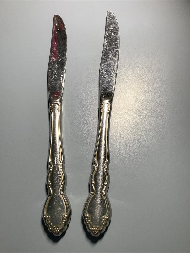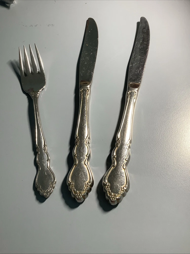 You are getting a salad fork which is 6 1/2 inches long and you are also getting two dinner knives, which are 9 inches long. They are in good. Use condition with every day uses and scratches.