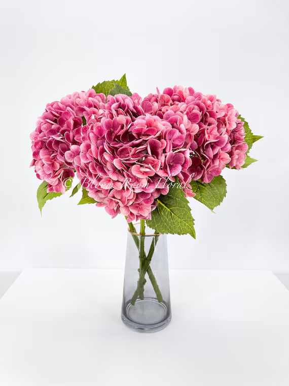 Set of 3 stems of Pink Hydrangeas. Add a bold floral design to your home with these remarkable, dazzling Hydrangea Stems, with spectacular handmade features in a pleasant pink shade, this is a wonderful piece to brighten a floral arrangement or as a striking single decoration. Sold as a set of 3 stems.