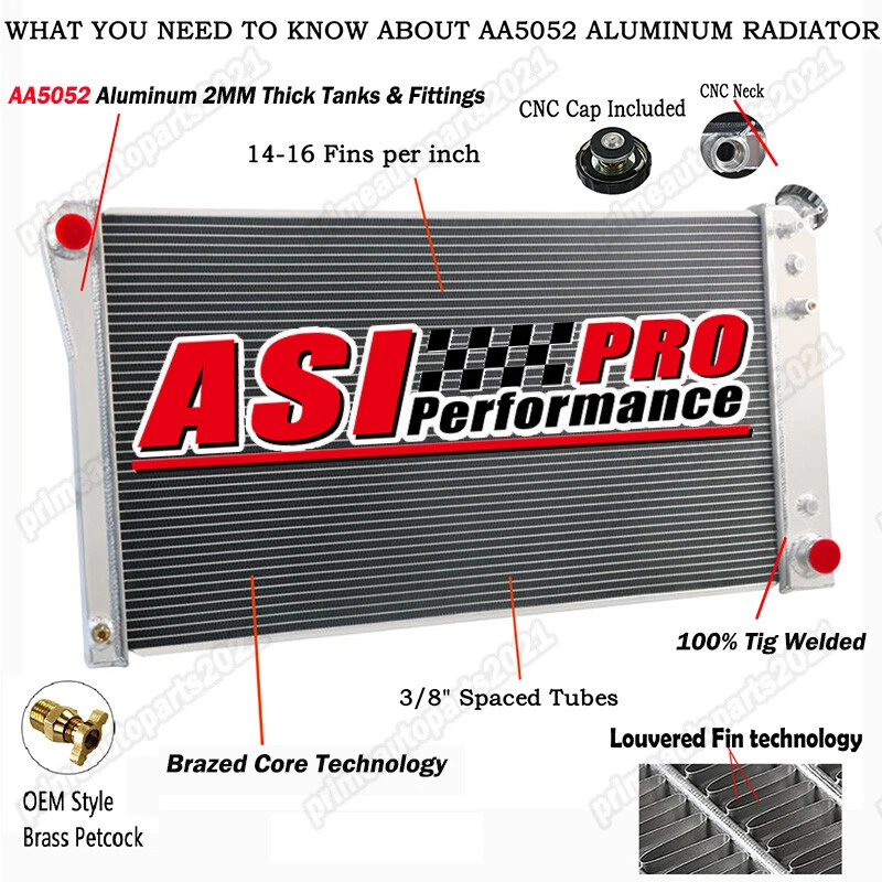 Welcome to our ebay store. Happy shopping Store Home New Arrival Ending Soon Add to Favourites View Feedback Contact us Store Categories Car & Truck Radiator Motorcycle & ATV Radiator TurboIntercooler Wheel Spacer Adapter Electric Thermo Fans Filler Neck & Cap Exhaust Head Pipe Coolant Tank&Billet Cap A-arms CV Axle Silicone Hose Turbo Exhaust Manifold/Gasket Tractor Radiator Shroud & Fan & Kit Why Choose us Free Shipping Fast Shipping Within 24 hours 60 Day Money Back Guarantee Trusted Store Satisfaction Guarantee Secure Shopping With Confidence Best Price and Good Quality Professional Customer Service 3 ROW Radiator Fits 1991-1993 Chevy Caprice/Buick Roadmaster/Oldsmobile 5.7L AT Items Description Package Include: 1 X 3-Row AA5052 Aluminum Radiator 1 X CNC Machined Radiator Cap Application: For Chevrolet Caprice 5.0L or 5.7L V8 Engine Without Eoc (Engine Oil Cooler) ; Without Lci 1991-1991 For Chevrolet Caprice 4.3L V6 / 5.0L or 5.7L V8 Engine Without Eoc ; Without Lci 1992-1993 For Oldsmobile Custom Cruiser 5.0L V8 Engine Without Eoc 1991-1991 For Oldsmobile Custom Cruiser 5.0L or 5.7L V8 Engine Without Eoc 1992-1992 For Buick Roadmaster 5.7L V8 Engine Without Eoc 1992-1993 Without Eoc With Toc: 11-1/2" Will Fit Automatic Or Manual Transmission Radiator Configuration: High Performance Racing Spec. 3-Row of tubes Core Racing Design Core Material: All Aluminum Tank Material: AA5052 Aircraft Grade Aluminum Surface Finish: Aircraft Grade Raw Aluminum Includes CNC machined filler neck and cap Core Dimensions: 30 1/2" Wide x 17 1/4" High x 1 3/4" Thick Overall Dimensions: 36 1/4" Wide x 19 1/6" High x 4" Thick Inlet Hose Connection: 1 4/7" Outlet Hose Connection: 1 1/4" Transmission Oil Cooler: Yes OEM Style Brass Petcock Drain. Please Check the Size Before You Buy! Material Description: Welcome to Primeautoparts2021, all our Products were made by OEM Approved & ISO Certified Manufacturers with materials that Meets Or Exceeds Strict OEM Requirements. Our Radiator is made of AA5052 aircraft aluminum. It is different from other sellers T-3303 Series. In fact, AA5052 series Aluminum is much better than T-3303 series. More than 90% of aftermarket manufacturers use the T-3303 series Aluminum, because it is cheaper and easier to get the material. However, T-3303 aluminum has many disadvantages, such as poor polishing effect, softness, easiness to scratch and corrode, poor heat dissipation effect. If the T-3303 aluminum radiator is operated in high pressure and high temperature for a long time, the leaking problem would occur very soon. AA5052 Aluminum is an Al-Mg alloy with good corrosion resistance, excellent reliability and cold workability and strength. The main alloying element of AA5052 is magnesium, which has good forming and processing properties. It is widely used in the manufacture of aircraft fuel tanks, oil pipes, and sheet metal parts of transportation vehicles and ships, hardware products, and electrical-appliance casings. This AA5052 Aluminum Radiator is designed to provide maximum cooling efficiency to prevent premature engine failure. Its light-weight, and high-heat transferring aluminum features a tube and fin design that, dramatically increases surface area that enables the heat to dissipate more efficiently. This AA5052 Aluminum Radiator is at least 30%-45% more efficient than stock ones. Most importantly, it has a much higher capacity for coolant than stock ones, which means that your cooling system will be more efficient and will be more resistant to temperature surges in racing applications. 1. Made from Aircraft AA5052 grade aluminum for prolonged lifespan and with raw aluminum finish 2. Brazed core technology to guarantee optimum performance and dependability 3. All AA5052 Aluminum 2mm thick tanks and fittings, Ensure it's hard and durable 4. Billet Aluminum CNC machined fill neck rugged and durable 5. Ergonomic design CNC machined cap with Engraved craftsmanship, anodized treatment. 6. OEM style brass petcock drain much better than other plastic one on eBay 7. Carefully crafted to exceptional OE standards for precise fit. Shipping Payment Return Policy Feedback About us Shipping Shipping: - Most of our orders ship within 1 business day of being placed. We ship our products primarily through FedEx Ground. - Delivery is not available to P.O. Box and the states of Alaska, Hawaii or Puerto Rico. - Most of our products ship FedEx Ground or Home, but some larger items (such as rattan furniture sets) do ship FedEx LTL (Freight) and can take up to 6 business days to arrive from the time the product ships. These shipments will need to be scheduled for an appointment to deliver by the local FedEx facility when it arrives in your area (the appointment will need to be scheduled within three days from their first contact attempt). Someone must be present to take delivery of LTL shipments and sign for the delivery (drivers only offload the product into the driveway; any additional help by the driver including a lift-gate will require an additional charge). - We can only ship your order to the PayPal verified address given to us at the time you checkout on eBay. Please verify that this address is the correct one you wish to have your package sent to. If an address change is needed you will be responsible for any fees associated. - If FedEx cannot deliver it for any reason (including they cannot reach you with the telephone number provided in the order or there is no phone number in the order), it will be re-consigned back to our warehouse and treated as a refused package where the order will be refunded minus a 20% processing fee. Payment Payment: - We accept PayPal and major credit cards (Visa, Mastercard, & American Express) -Immediate payment is required after the purchase Return Policy Return policy: - All return items MUST be in brand new condition which means the item is never installed and kept in the original packaging, otherwise a 20% restocking fees will be charged. - We will 
