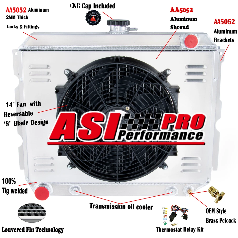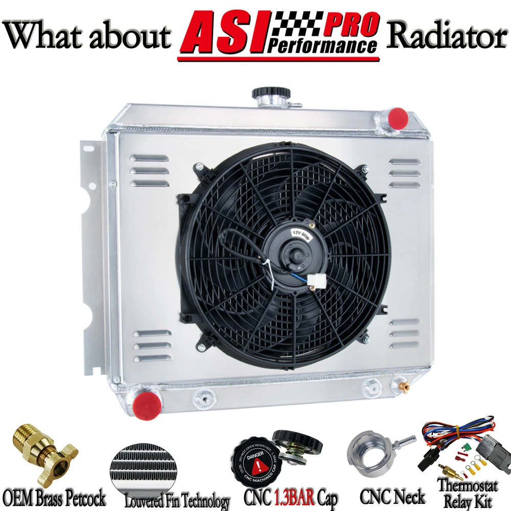 DELIVERY PAYMENT RETURNS WARRANTY FEEDBACK Store Home Car&Truck Radiator Oil Tank/Can Arms/Carrier Motorcycle Radiator Intercooler&Kit Exhaust Head Pipe Radiator Intercooler Hose Pipe Cooling Thermo Fans&relay Radiator Cap&Filler Neck&Plug Other Products DESCRIPTION Package Include: 1 X 3-Row AA5052 Aluminum Radiator 1 X CNC Machined Radiator Cap 1 X AA5052 Aluminum Shroud 1 X 14" Fans (Includes mounting kits) 1 X Thermostat Relay Kit Radiator Size: Condition:New Material:Aircraft AA5052 grade aluminum tank & core High Performance Racing Spec. 3 -Row of tubes Core Racing Design Core Size: 16 3/8''High x 22'' Wide Overall Size:21" High X 25 3/4" Wide Inlet Hose Connection: 1 1/2'' Passenger Side Outlet Hose Connection: 1 3/4'' Driver Side Transmission Oil Cooler: YES Fans Details : Volt :12v Maximum Fan CFM: 1730 cfm Fan Diameter (in): 14.050” Thickness (in): 2.500” Number of Blades: 8 S-Type blades Maximum Fan RPM: 2,250 rpm Blade Material: Plastic Amp Draw: 12.70 amps Includes the Mounting Tabs for an Easy Zip Tie Installation Thermostat Kit Installation: Universal fit for any automotive vehicle and electric fan. Activates by grounding electric fans at preset temperature. 180'F turn-on temperature, 165'F turn-off temperature. Probe typically threads into radiator, water outlet or manifold. RED + connect directly to battery. WHITE wire to ignition switch power source. BLACK goes to thermos switch. BLUE wire goes to the Fans. Vehicle Fitment 1970-1971 DODGE CHALLENGER 22" CORE - BIG BLOCK 1970-1972 DODGE CHARGER 22" CORE - BIG BLOCK 1970-1972 DODGE CORONET 22" CORE - BIG BLOCK 1972 PLYMOUTH ROADRUNNER 22" CORE - BIG BLOCK 1967-1971 PLYMOUTH GTX 22" CORE - BIG BLOCK The advantages of our radiator : Made from Aircraft AA5052 grade aluminum for prolonged lifespanand with raw aluminum finish Brazed core technology to guarantee optimum performance and dependability All AA5052 Aluminum 2mm thick tanks and fittings,Ensure it's hard and durable Billet Aluminum CNC machined fill neck rugged and durable CNC machined cap with Engraved craftsmanship, anodized treatment. OEM style brass petcock drain much better than other plastic one on eBay Carefully crafted to exceptional OE standards for precise fit. RETURN & EXCHANGE DELIVERY PAYMENT RETURNS WARRANTY FEEDBACK DELIVERY Paypal ONLY --the easiest and most secure way to pay on line PAYMENT All orders will be sent within one business day after payment received. Note: Please contact for quote if international postage NOT display. (shipping and handling charge is only for the lower 48 states in USA, other states'[Alaska, Hawaii, and Puerto Rico etc.]shipping cost , please contact us for quote.) RETURNS A new return is considered a brand new item that you ended up not needing or perhaps you purchased incorrectly for your specific vehicle. Please keep in mind that spending time before purchasing the part to confirm it is indeed exactly what you need can help prevent you from ordering the wrong part. Please remember to email us which warehouse to send the item back before return. And all returns must be shipped back in their original factory packaging. Shipping Damage Shipping damage is any item/package suspected of being broken or damaged in anyway during the shipping process. We purchase full insurance for this, however the damage must be reported to us within 3 days of receiving the package. WARRANTY 1 Year warranty against manufacture defect. Replace/return are available if buyers receive wrong/damaged/defective items. For replacement or return , buyer should keep the item in acceptable packing. Before replace or return ,buyer should submit proof to us by pics if possible. Anyway ,by nice communications ,we can find a way to make you satisfied FEEDBACK Very appreciated for your support. I hope you are happy with your purchase. We maintain high standards of excellence and strive for 100% customer satisfaction! Feedback is very important to us. We request that you contact us immediately BEFORE you give us or feedback, so that we can satisfactorily address your concerns. If you have any problem, please feel free to contact us via ebay message, we will reply your email within 24 hours (except weekends and holidays). We will do our best to solve your problem as soon as possible. We appreciate your continued patience and willingness to work with us. Thank you for choosing us and have a great day! DELIVERY PAYMENT RETURNS WARRANTY FEEDBACK Copyright ? ASI_coolingsupport. All Rights Reserved. Package Include: 1 X 3-Row AA5052 Aluminum Radiator 1 X CNC Machined Radiator Cap 1 X AA5052 Aluminum Shroud 1 X 14" Fans (Includes mounting kits) 1 X Thermostat Relay Kit Radiator Size: Condition:New Material:Aircraft AA5052 grade aluminum tank & core High Performance Racing Spec. 3 -Row of tubes Core Racing Design Core Size: 16 3/8''High x 22'' Wide Overall Size:21" High X 25 3/4" Wide Inlet Hose Connection: 1 1/2'' Passenger Side Outlet Hose Connection: 1 3/4'' Driver Side Transmission Oil Cooler: YES Fans Details : Volt :12v Maximum Fan CFM: 1730 cfm Fan Diameter (in): 14.050” Thickness (in): 2.500” Number of Blades: 8 S-Type blades Maximum Fan RPM: 2,250 rpm Blade Material: Plastic Amp Draw: 12.70 amps Includes the Mounting Tabs for an Easy Zip Tie Installation Thermostat Kit Installation: Universal fit for any automotive vehicle and electric fan. Activates by grounding electric fans at preset temperature. 180'F turn-on temperature, 165'F turn-off temperature. Probe typically threads into radiator, water outlet or manifold. RED + connect directly to battery. WHITE wire to ignition switch power source. BLACK goes to thermos switch. BLUE wire goes to the Fans. Vehicle Fitment 1970-1971 DODGE CHALLENGER 22" CORE - BIG BLOCK 1970-1972 DODGE CHARGER 22" CORE - BIG BLOCK 1970-1972 DODGE CORONET 22" CORE - BIG BLOCK 1972 PLYMOUTH ROADRUNNER 22" CORE - BIG BLOCK 1967-1971 PLYMOUTH GTX 22" CORE - BIG BLOCK The advantages of our radiator : Made from Aircraft AA5052 gra