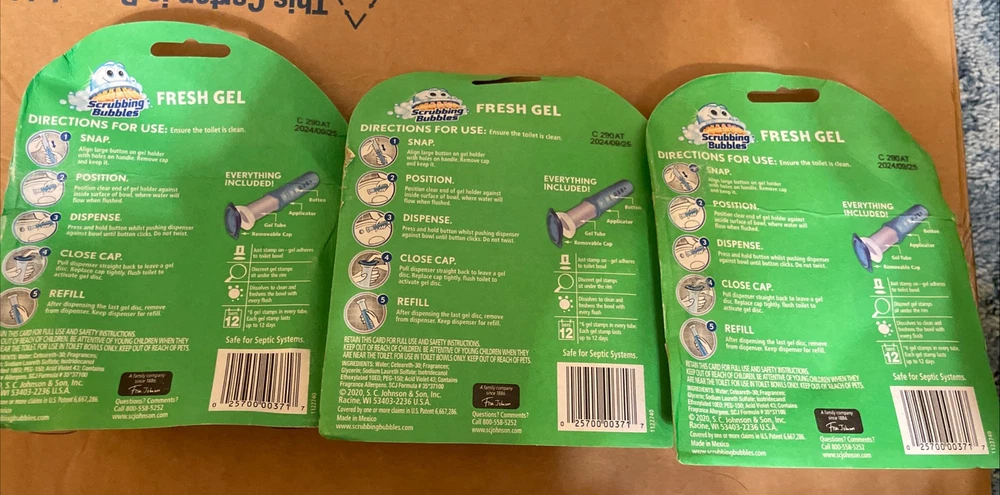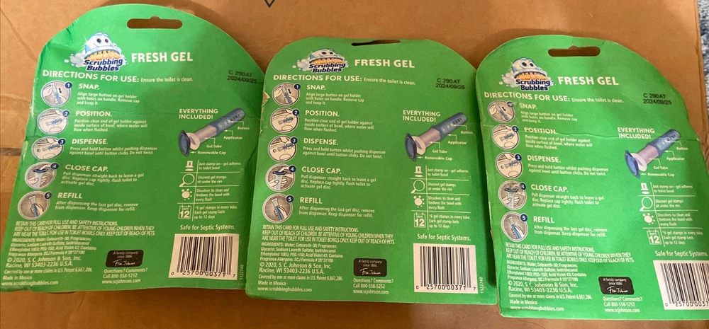 3 pack- Scrubbing Bubbles Fresh Gel Toilet Cleaning 6 Stamps Dispense FLORAL FUSION - new in packaging - starter packs - lasts up to 10 weeks of freshness - 1.34oz - 1 dispenser in each pack & 6 gel stamps in each packages as well - scrubbing bubbles - ScJohnson a family company brand - packages may have imperfections, everything is intact - best offers are welcome - fresh gel & neutralizes Oder in the air - 18 gels altogether and three dispensers in total