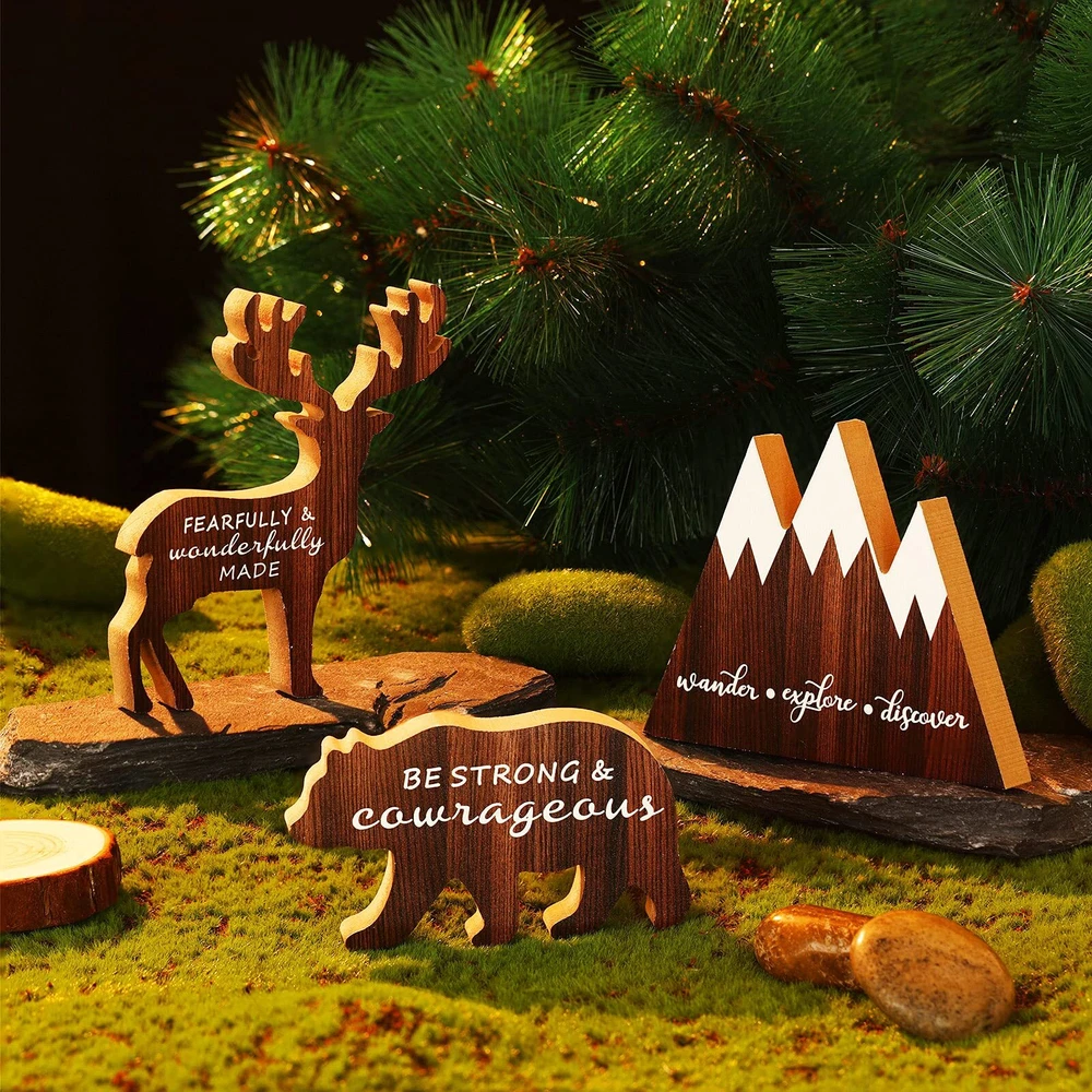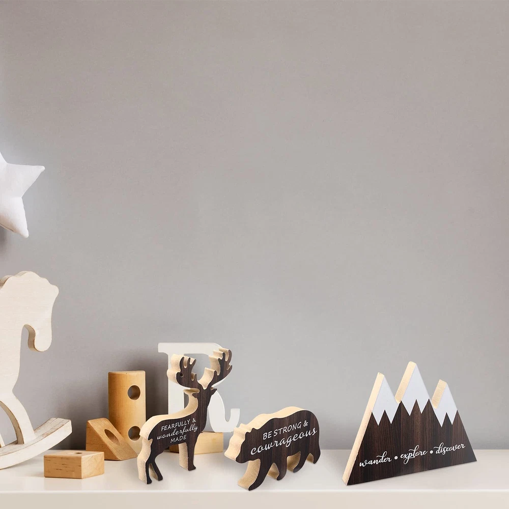 Features: Inspirational signs: The woodland theme signs are printed with different words and designed with different shapes, which will make your home different. Reliable material: These forest theme party decors are made of quality wood, odorless, durable, reusable and easy to store, allowing you to use for a long time. Wide range of uses: The wooden wall signs can be hung on the wall or placed on a shelf for home decoration, nursery decoration, cottage decoration, mountain decoration, woodland decoration, etc. Specifications: Material: wood Size: as shown Color: as shown Package includes: 3 x Woodland wooden signs Notes: Due to manual measurement, please allow a slight dimensional error. Due to different screens, the color may be slightly different. Package includes: you will receive 3 pieces of forest-themed wooden ornaments with rustic mountain, deer and bear shapes, which are very appropriate for decorating the forest-themed room Woodland style: the wood mountain sign is printed with "Wander Explore Discover", the wood deer ornament is printed with "Fearfully and Wonderfully Made", and the wood bear decor is printed with "Be Strong and Courageours"; These wooden quote decors are designed with different words, which have beautiful appearance Quality material: these woodland-style wooden blocks are made of quality decorative material, odorless, durable, not easy to fade and break, reusable and easy to store, which can serve you for a long time Nice gift: these exquiste forest-themed wooden ornaments are very suitable for new mothers as birthday gifts,Halloween gifts and Christmas gifts, which will be loved by them Wide application: the wooden wall signs with quotes are very suitable for dressing up a forest theme party or even an outdoor and wilderness theme bathroom, and can be applied for home, nursery and cottage decoration; The wooden animal signs can be hung on the wall or placed on a shelf to create an interested atmosphere
