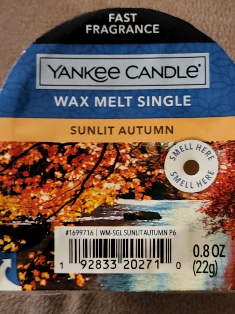 Shape: Round Handmade: No Scent: Sunlit Autumn Type: Wickless Tart/Bar Brand: Yankee Candle Size: Small Customized: No Color: Yellow Item Weight: 2.2 oz Number in Pack: 1 Theme: Nature Material: Wax Model: yankee candle Features: Scented Personalize: No
