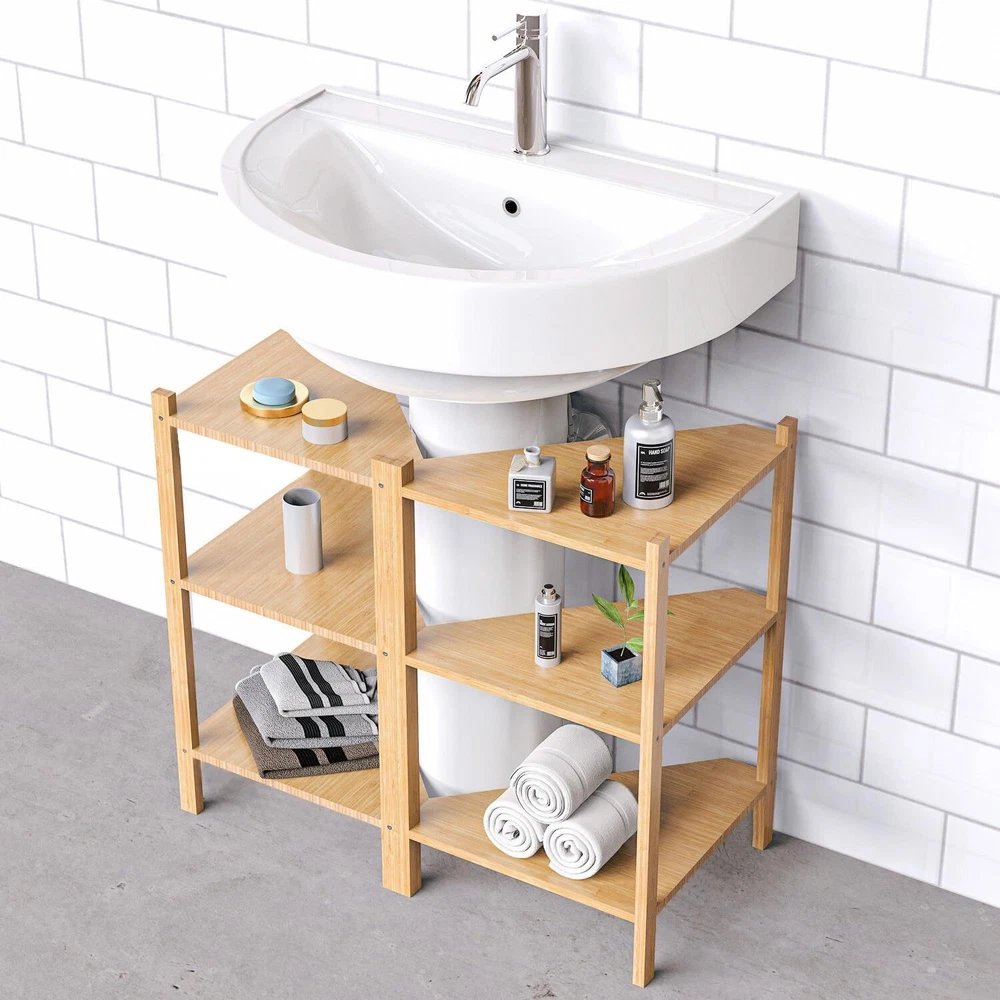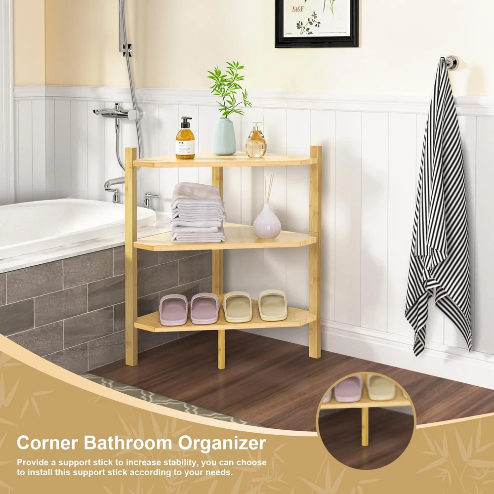 【ECO-FRIENDLY SUPERIOR MATERIAL】The entire frame of our 3-tier shelf consists of environment-friendly and sturdy . Durable and long-life in use. 【MULTIPURPOSE SHELVING】This corner cabinet organizer can be put in various places such as the bathroom, hallway, living room, bedroom, balcony, etc. Place towels toiletries, or any other stuff like books, plants, and photos. 【SPACE SAVING】Size: 13.4"D x 13.4"W x 23.6"H. It occupies a small area which greatly helps you save storage space. Perfect for any small corners in the living room and bedroom. 【STABLE & DURABLE】 The triangle shape is the most stable, which constitutes a sturdy base. Our corner shelf stand is put in your shower for convenient accessing bath supplies while keeping them tidy. It won't be affected to fall apart by humidity. 【EASY TO ASSEMBLE】All parts and hardware plus detailed instruction are included for easy assembly, you can successfully install it in several minutes.