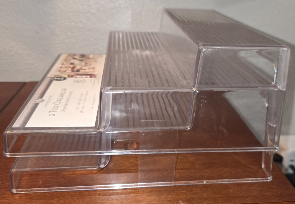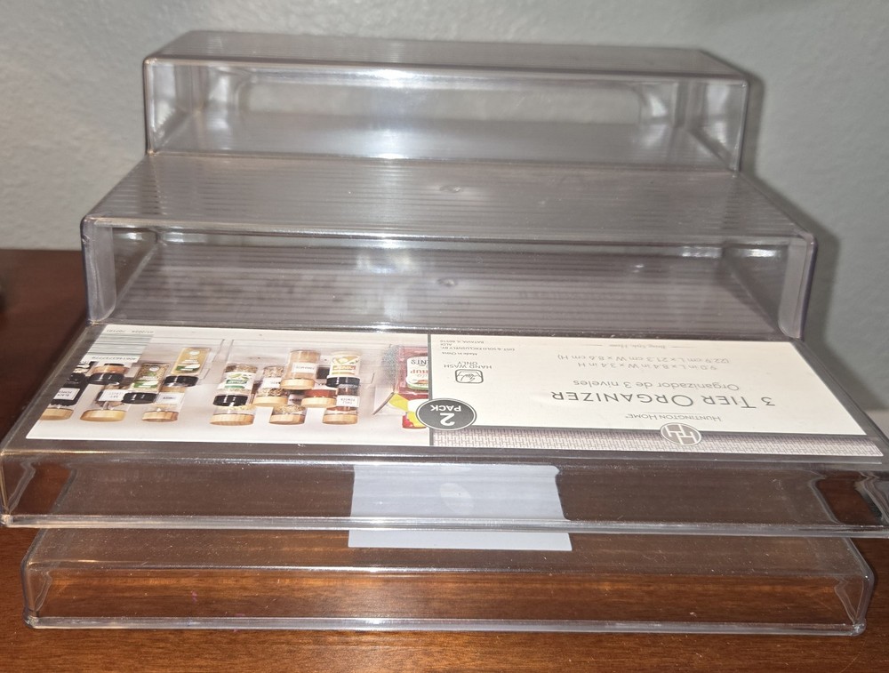 Huntington Home, 3 Tier Organizer, 2 pack, New, Never Used, Clear Plastic, Non slip traction stripes as shown in picture.