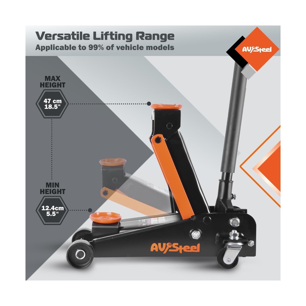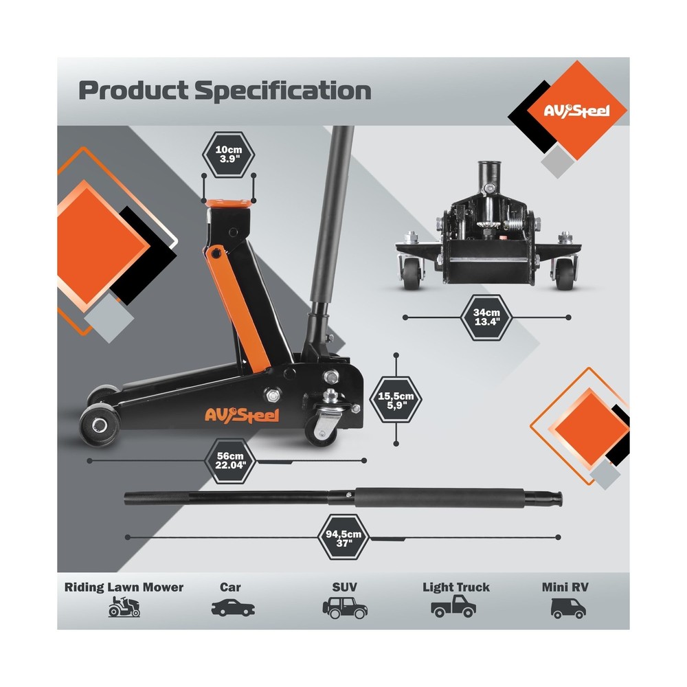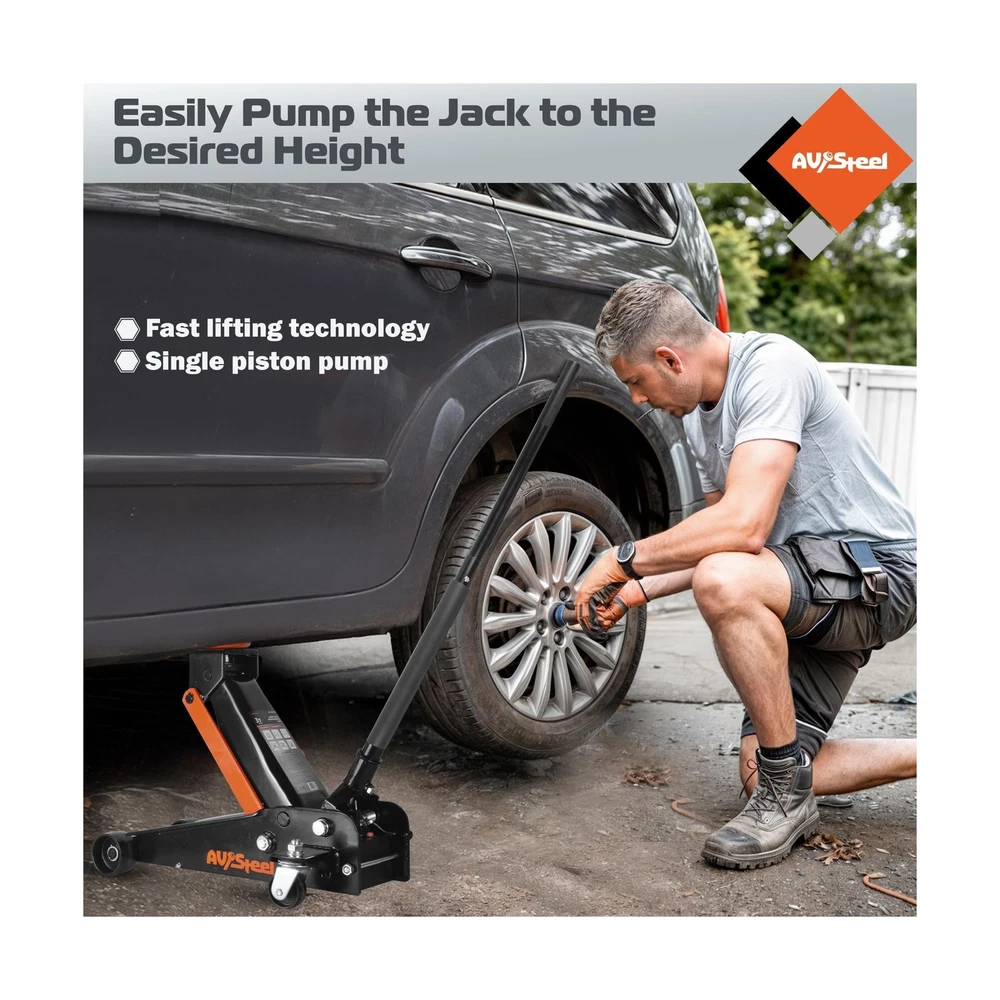3 Ton Floor Jack (6600 lbs), Heavy Duty Hydraulic Jack for Car, Heavy-Duty Floor Jack with Single Piston Pump, Quick Lift Car Jack 3 ton with Lifting Range 5.5'' to 18.5'' Description Features: Capacity: AV Steel car floor jack can easily lift up to 3 tons (6,600 lbs) with a min lifting height of 5.5" and a max height of 18.5", making it suitable for most cars, trucks, and SUVs in terms of listing range and capacity. Truck jack is great for garage service and heavy-duty industrial use. Overload Protection: A safety measure in the hydraulic car jack serves to provide extra protection in case of excess weight and to avoid harm or damage. A 360 rotatable saddle provides maximum protection to your vehicle. High Quality: Our heavy-duty car lift jack is made of strong and durable steel construction. With wheels, including 2 rotating rear wheels that are universal, this jack is easy to move, steer, and roll. Meets ANSI/ASME PASE safety standards. Universal fit: Whether you need to change a tire, perform maintenance, or make repairs, the 3ton floor jack is the perfect tool for the job. Its easy-to-use design and reliable performance make it a great addition to any garage or workshop. Product Details: Load Capacity: 6600 Pounds Maximum Lifting Height: 18.5 Inches Brand: AV Steel Color: Multi color Item dimensions L x W x H: 26.4 x 14.2 x 8.3 inches Load Capacity: 6600 Pounds Maximum Lifting Height: 18.5 Inches Brand: AV Steel Color: Multi color Item dimensions L x W x H: 26.4 x 14.2 x 8.3 inches Style: Quick lift Manufacturer: AV Steel UPC: 198168207376 Model: Floor Jack Item Weight: 63.9 pounds Product Dimensions: 26.4 x 14.2 x 8.3 inches Item model number: AV-300101F Manufacturer Part Number: AV-300101F Date First Available: April 27, 2024 Delivery We Do Not Ship Outside of the Continental US. Return Policy All items qualify for returns within 30 days of receipt. Buyer is responsible for return shipping on any item that is not damaged. Feedback We take our reputation seriously, we buy and sell online, so we understand the value of trust. If you are unsatisfied with your order, please contact us and we will work with you to resolve it to your satisfaction.