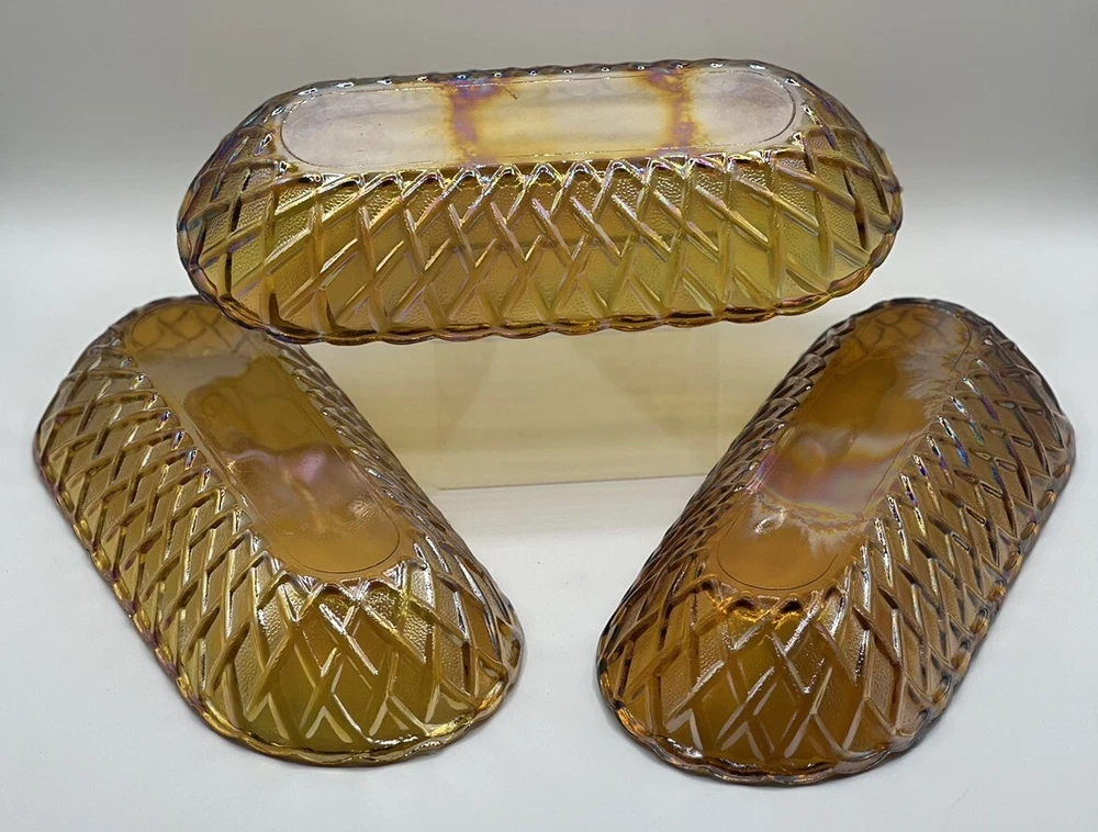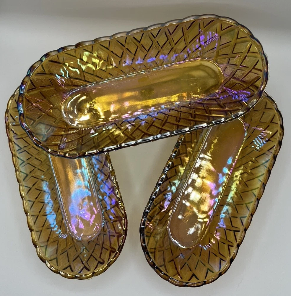 Add a touch of vintage charm to your table setting with this beautiful gold oval relish dish from Indiana Glass. With its unique pretzel amber color and mid-century modern style, it's sure to be a conversation starter. Made in the United States, this dish is perfect for serving your favorite snacks or small dishes. It's not handmade, but its quality and durability are undeniable. Indiana Glass is a trusted brand known for their exceptional glassware, and this dish is no exception. Bring a piece of history to your home with this gorgeous vintage relish dish. 10.5” Long