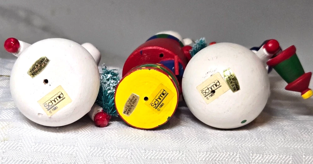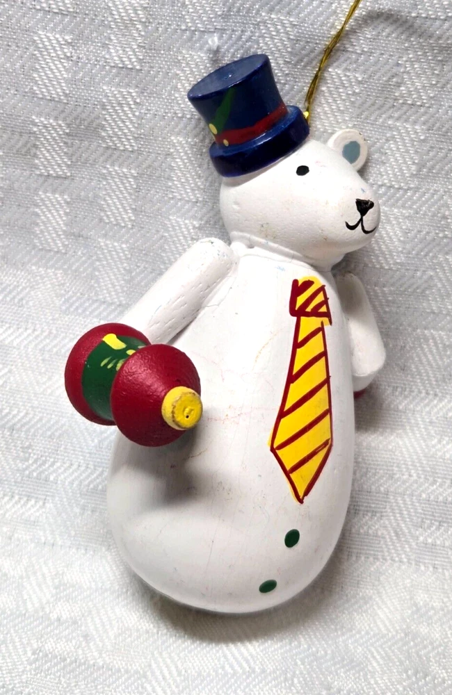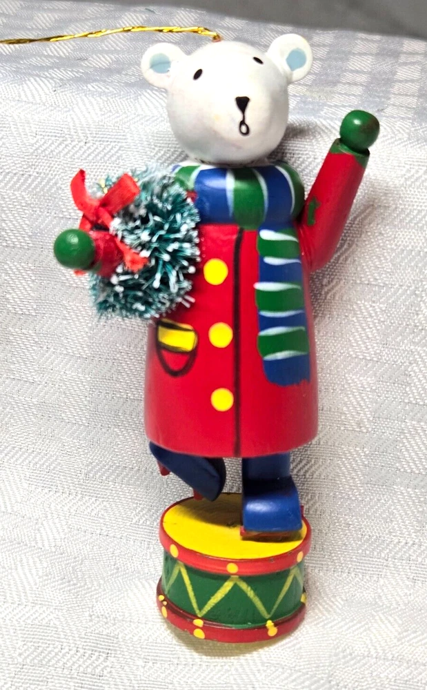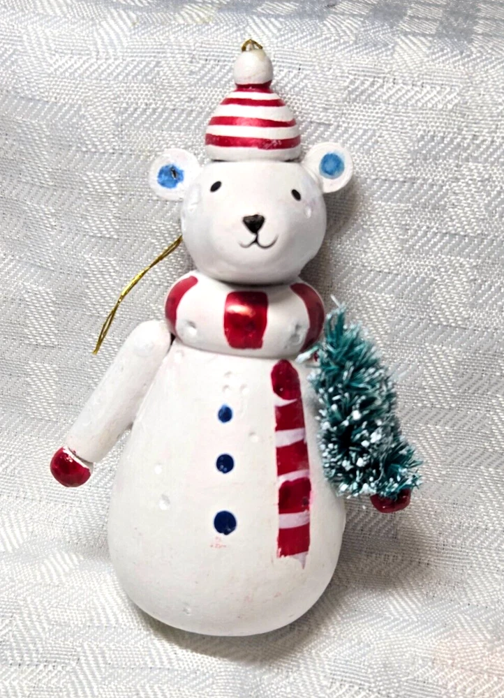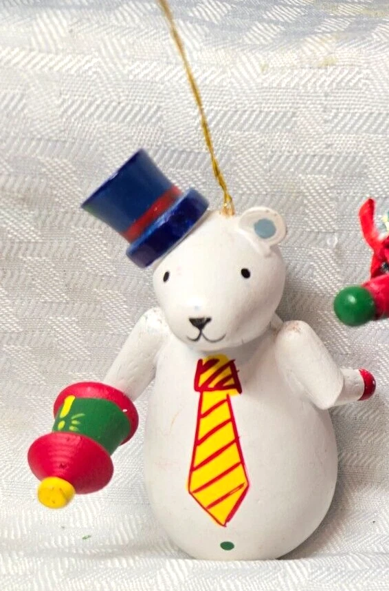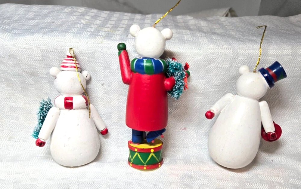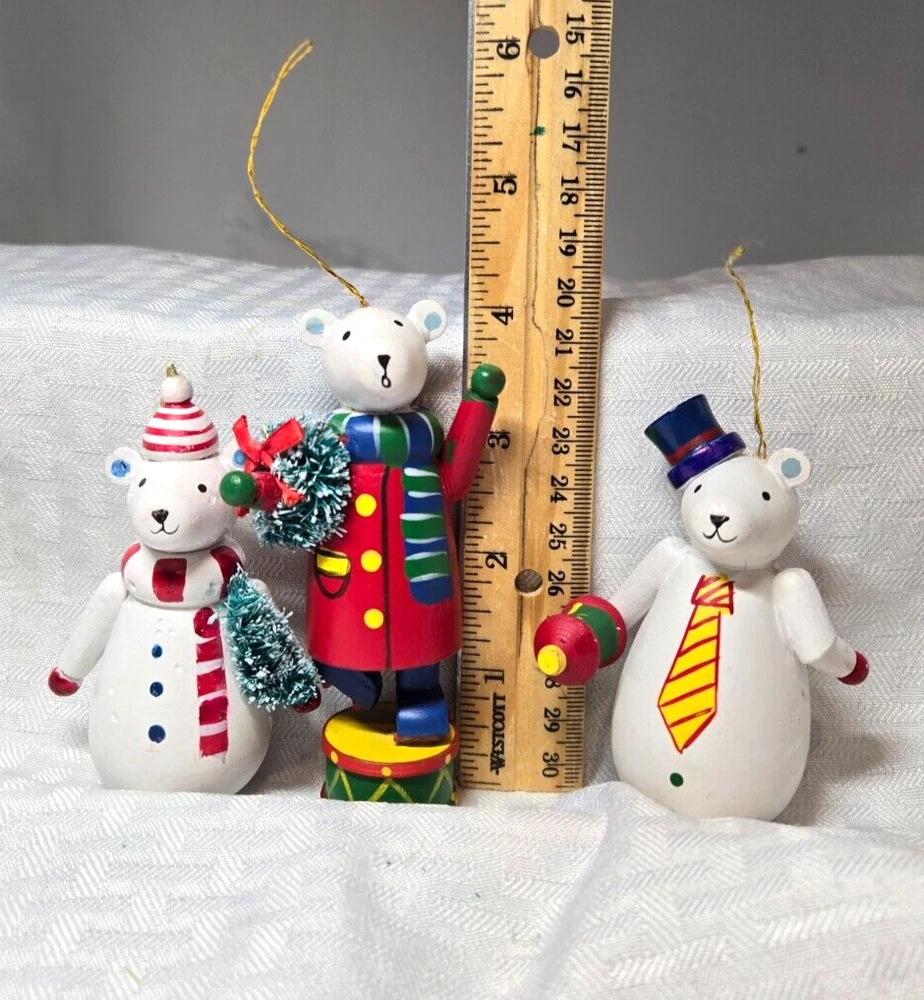 Three Schmid Polar Bear Ornaments Each one with its own prop - Lantern, Wreath and Christmas tree Three to Four inches tall - made of Wood and Hand painted