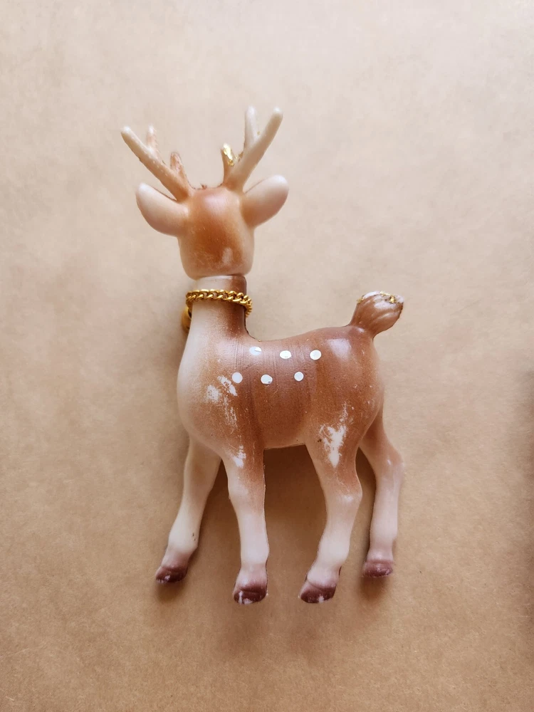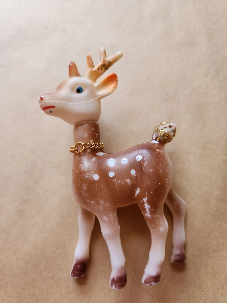 3 Vintage Soft Plastic Reindeer 5 inches tall Pre-Owned one of the reindeer missing a bell, some paint rubbed away here and there Please refer to photos for condition