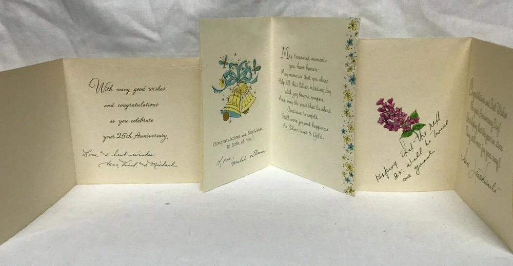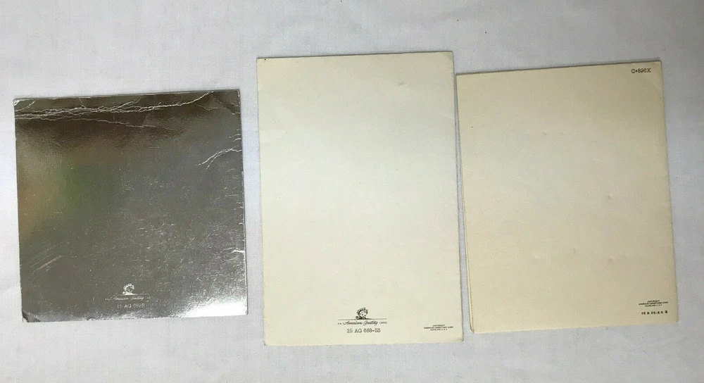 3 vintage used anniversary greeting cards by American Greetings Corp. Cards have handwritten messages inside. Largest card is 6 1/2" x 4 1/2", smallest card is 5"x5". No envelopes. The p ictures show the exact items that you will receive. Ships from Alberta, Canada. GST applies to purchases shipped within Canada.