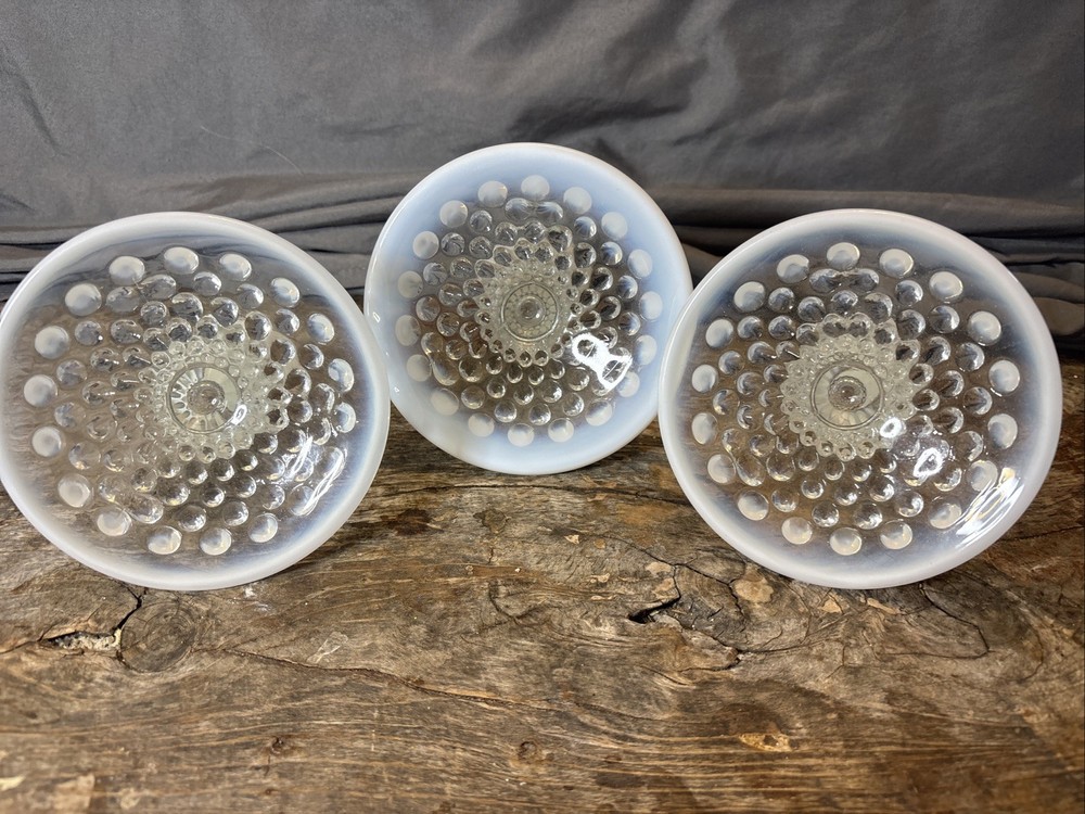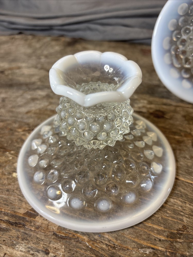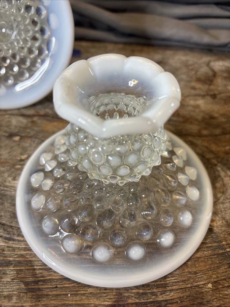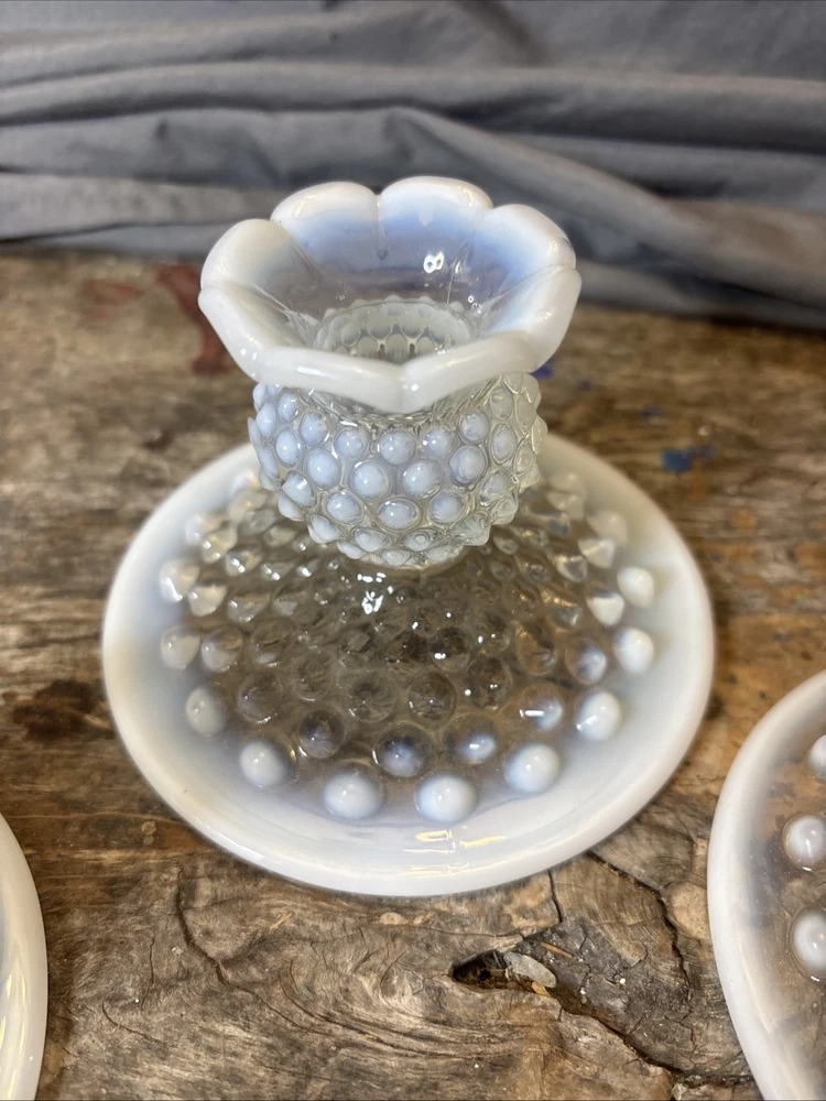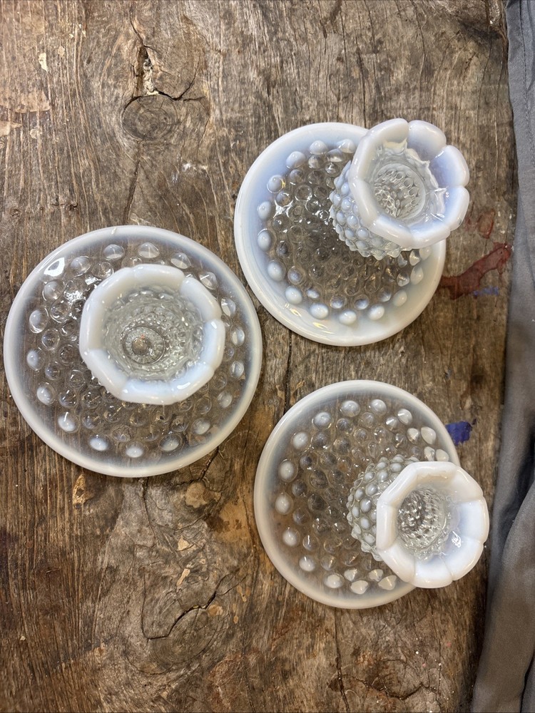 * Mo chips. Candlesticks are in excellent condition. See photos. This product is a set of three vintage Fenton candlestick holders made of opalescent moonstone glass with a ruffled pattern. These candlesticks are a beautiful and uniquea addition to any North American-inspired decor, showcasing the artistry and craftsmanship of Fenton's studio production style. The iridescent glass creates a soft, glowy light that adds a touch of elegance to any space, making them a sought-after decorative piece for collectors and enthusiasts of vintage glassware.