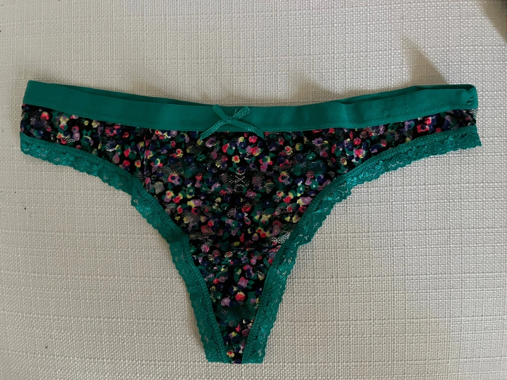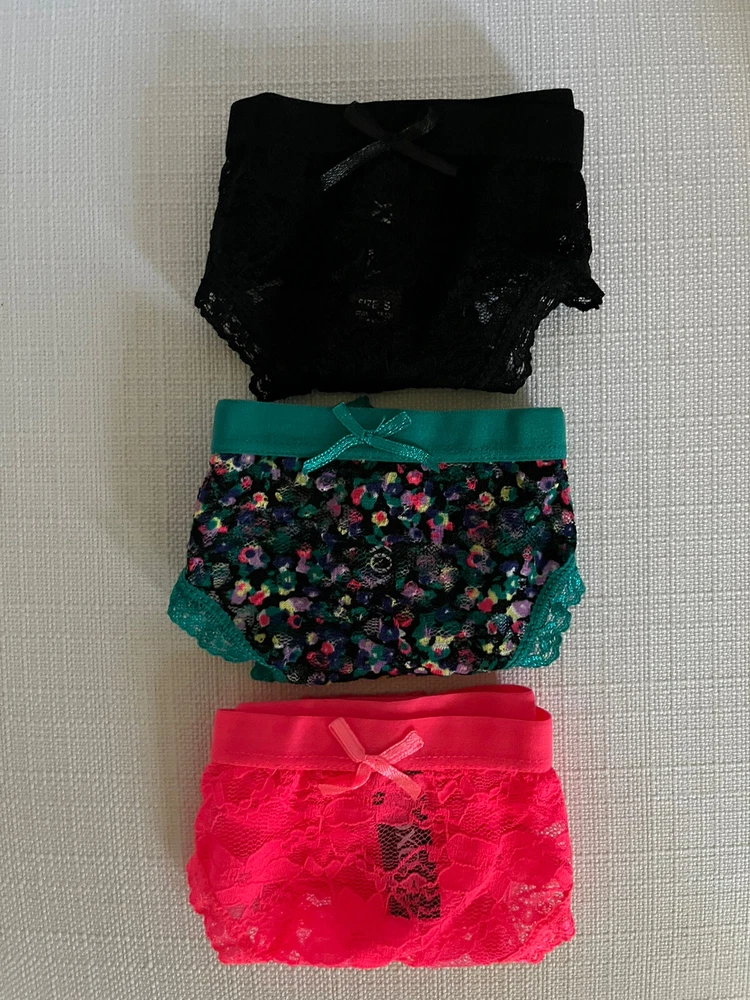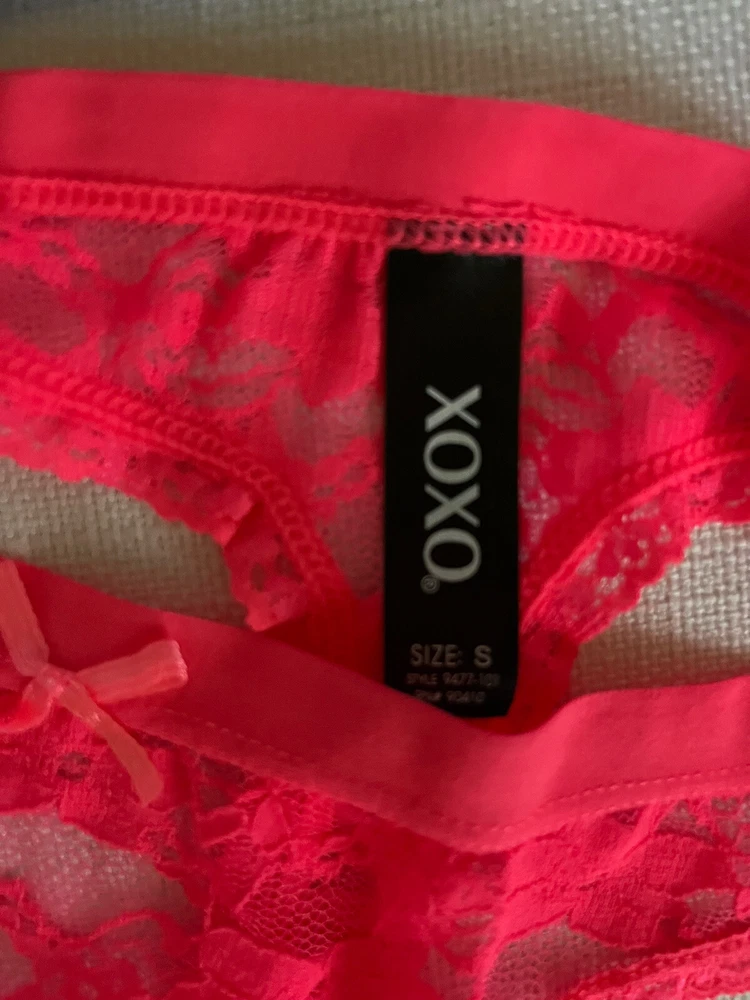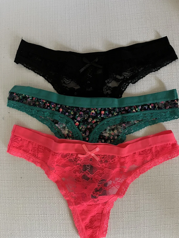 These are 3 NEW LACE THONG PANTIES by XOXO INTIMATES 3PK Collection. one Pink , one Black, and one multicolor , with Fused Logo Waistbands, in Soft Lightweight Silky Fabric. Labels read 90% Polyester, 10% Spandex, SIZE S, Mfg List Price $24. One is pink One is black One is multicolor