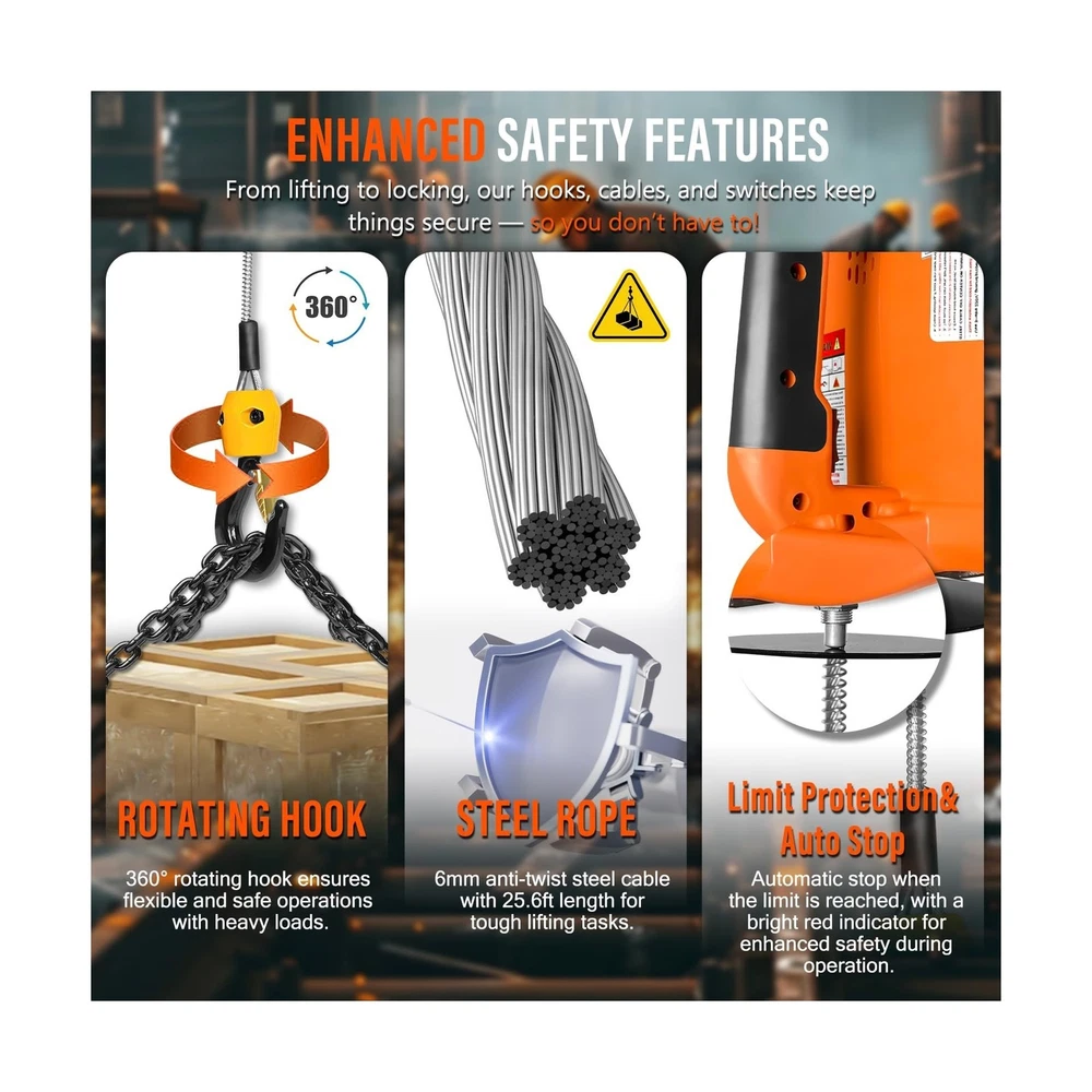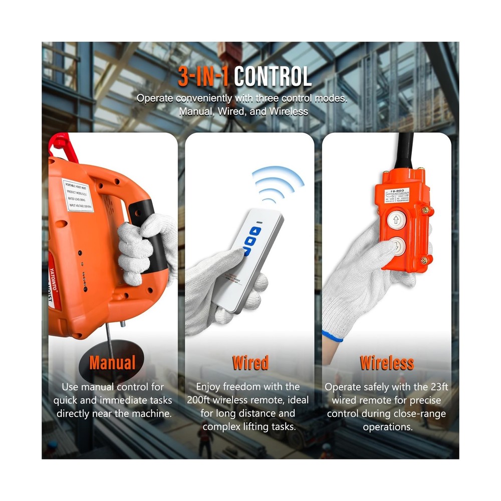 3 in 1 Electric Hoist Winch, 1500W Portable Electric Power Winch, 120V Electric Hoist Crane, 25ft Lifting Height, with Wire and Wireless Remote Control, Overload Protection for Towing Lifting Description Features: 3-in-1 High-end Configuration: Equipped with wireless remote control (AAA Batteries Included), wired remote, and direct manual operation, offering multiple control methods for added flexibility; avoid running the hoist without load on its first use for optimal safety. Enhanced Safety Features: Features a safety limit switch that automatically cuts power to prevent accidents; includes a reinforced crane mechanism and a 360-degree rotating forged alloy hook with a safety latch for superior load-bearing capacity and added safety; overload protection included. Industrial Grade Materials: Utilizes a high-efficiency pure copper motor with multiple copper windings for stable operation; galvanized anti-rotation wire rope offers durability and resistance to corrosion; aluminum shell gearbox enhances motor durability and damage resistance. Thoughtful Design Details: Waterproof remote control handle for durability and convenience; high-strength bearings extend the lifespan of the device; LED indicator provides a quick status check; dust cap design ensures stability of handle connections. Versatile Use: This electric winch is an ideal tool for lifting and towing tasks in gardens, forests, factories, warehouses, and construction sites; versatile installation options allow horizontal or vertical mounting in garages or ceilings for diverse space requirements. Product Details: Package Dimensions: 13.1 x 10.6 x 10.1 inches Item Weight: 24 pounds Manufacturer: YATOINTO Date First Available: March 1, 2022 Delivery We Do Not Ship Outside of the Continental US. Return Policy All items qualify for returns within 30 days of receipt. Seller is responsible for return shipping on any item that is not damaged. Feedback We take our reputation seriously, we buy and sell online, so we understand the value of trust. If you are unsatisfied with your order, please contact us and we will work with you to resolve it to your satisfaction.
