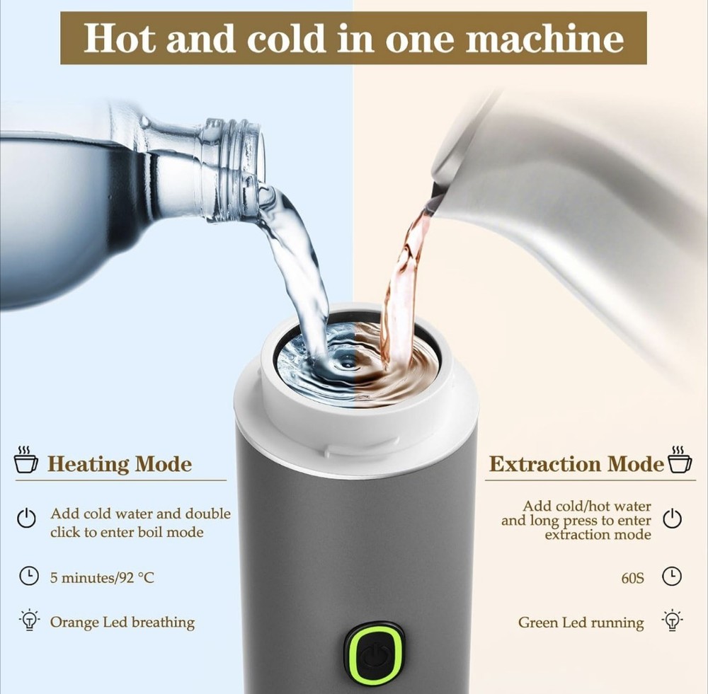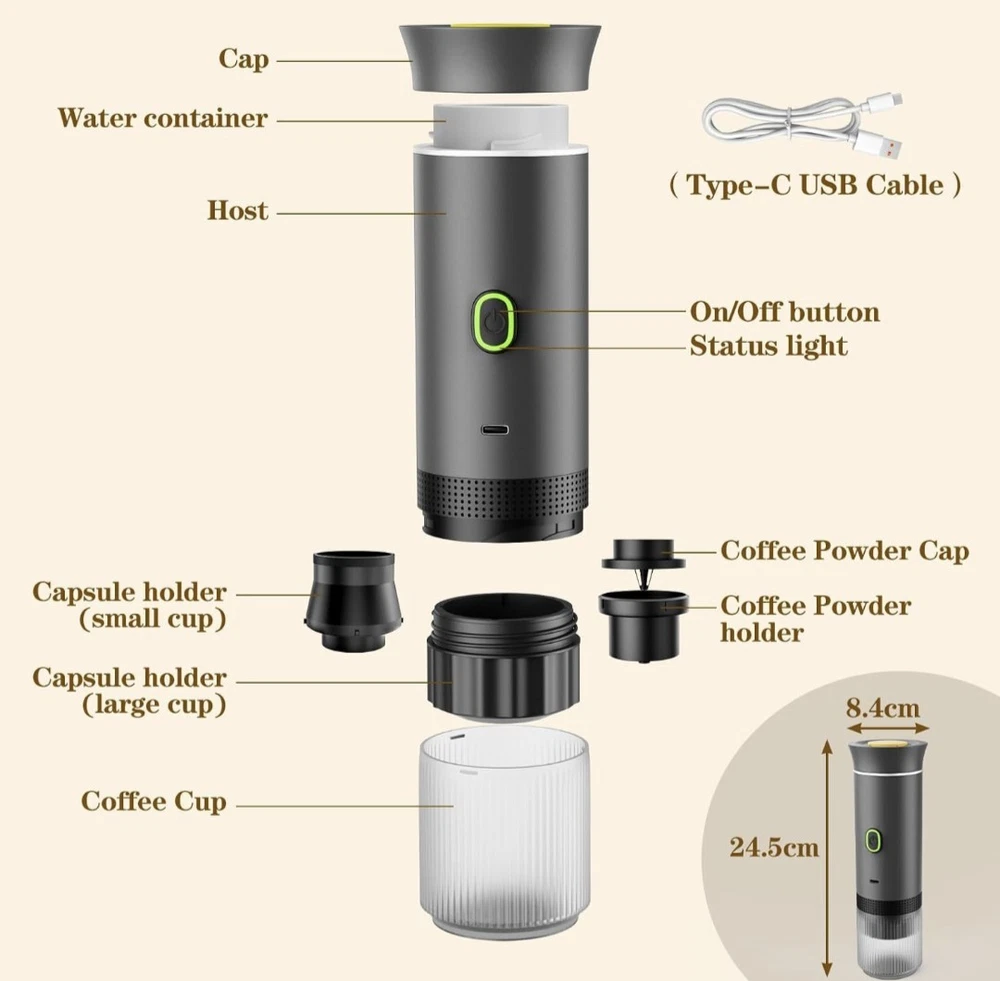 Excellent condition. Used for a weekend. 【Multifunctional 3-in-1 Espresso Machine】The portable espresso maker is ingeniously designed, and in addition to being compatible with ground coffee, it also supports large and small capsules (NS & DG capsules). Whether you prefer traditional ground coffee or the convenience of capsule coffee, the mini coffee maker can be perfectly adapted to meet different tastes and needs. 【Lightweight & Portable】Portable espresso machine weighs only 680g. You only need the space of a water cup to carry it, making it easy to carry around and perfect for camping, traveling, and hiking. The portable espresso machine it has a sleek design with a modern Type-C charging port that supports in-car charging and USB charging, making it suitable for camping, travel, hiking, and office use. 【Premium Battery Capacity】 The travel coffee maker comes with a 7500mAh battery, and a modern Type-C charging port that supports in-car and USB charging, meeting your needs for multiple daily uses. Portable coffee maker supports 5 cups of coffee using 1.7 ounces of room temperature water at 77°F, and over 200 cups using hot water. 【Self-Heating Function&Powerful Pessure】This portable coffee maker has a self-heating function With just a gentle tap, you can enjoy the perfect espresso in 5 minutes.No additional equipment or complicated preparation steps are required.Portable coffee machine with a 20Bar pressure pump.The high-pressure pump simulates the brewing technique of a professional barista, ensuring that each cup of coffee achieves a full-bodied flavor and perfect layering.