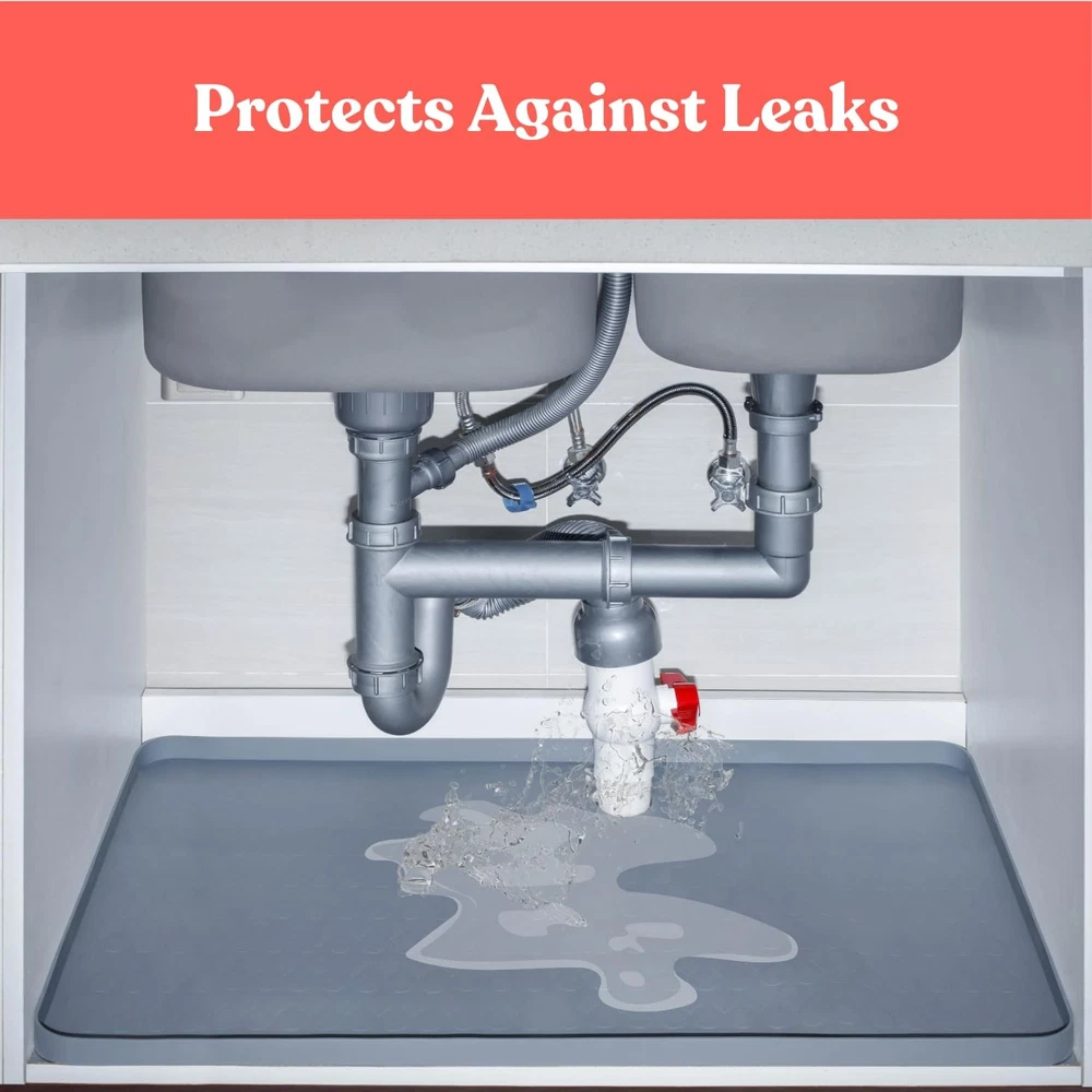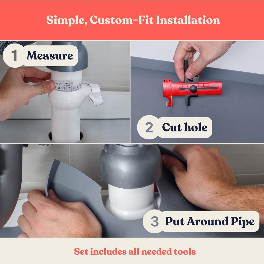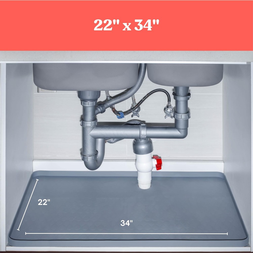 Protect your kitchen cabinets with our undersink mats for bottom of kitchen sink, engineered to safeguard against water damage, spills, and leaks. Under the sink mat waterproof measuring 34"x22" (86.36 cm x 55.88 cm), sink mats for bottom of kitchen sink fits most standard under-sink areas seamlessly. Unlike regular mats that are hard to customize, our silicone sink mats for kitchen sink comes with a circular scissor tool to help you cut precise, clean pipe holes effortlessly. Rubber mat for under kitchen sink paired with an included measuring tape, you can measure pipe diameters accurately and mark under the sink mat waterproof cut to fit for a perfect, mess-free installation, under sink mats for kitchen cabinet ensuring a flawless fit that enhances both functionality and appearance. This under sink silicone mat 34x22 inches is crafted from durable, waterproof material designed to withstand daily wear and tear while under sink liners for kitchen waterproof protecting your cabinets from moisture buildup. The installation is simple and quick: position the water proof mat under the sink, measure from the back of the cabinet to the pipes, mark the spots on the silicone kitchen sink mat, and use the circle cutter to make accurate cutouts. Once the holes are created, you can easily slide the under sink protector mat into place around the pipes, under sink waterproof mat avoiding awkward, uneven trimming and providing a sleek, professional look for your under-sink space. Our undersink mats for bottom of bathroom sink offers an ideal combination of protection, durability, and convenience. Its easy-to-use design makes under sink tray for kitchen waterproof perfect for water damage and maintain a clean, mat for under kitchen sink organized under-sink area. Say goodbye to messy cuts and water-damaged cabinets with under sink cabinet mat all-in-one solution that provides lasting moisture protection while keeping your cabinet space neat and protected. WATERPROOF & DURABLE: Under the sink mat crafted from high-quality waterproof material, these kitchen sink mats prevents leaks and spills from damaging your cabinets. Silicone under sink mat’s durable design ensures long-lasting protection, even in high-moisture areas. PRECISE CUT-TO-FIT DESIGN: 1. Measure your piper cicrumference. 2. Cut the circle out of the mat. 3. Wrap the mat withthe hole around the pipe. All needed tools are included in the ' under sink mat with pipe holes ' set. Easily customize the mat to fit around pipes with the included circular scissor tool. Achieve clean, precise pipe holes without messy cuts, cut to fit under sink mat offering a tailored fit for your under-sink space. MEASURING TAPE AND CIRCLE CUTTER INCLUDED: Undersink waterproof mat included measuring tape allows for accurate pipe measurements, ensuring perfectly placed cutouts. Say goodbye to guesswork and uneven cuts with kitchen sink mat for bottom of sink easy-to-use solution. PERFECT SIZE & EASY INSTALLATION: Sized at 34"x22" (86.36 cm x 55.88 cm), this sink matt for kitchen sink is ideal for standard cabinets. The simple installation process lets you measure, cut, and fit the under bathroom sink mat quickly, under sink protector mats providing a mess-free, professional look. EASY TO CLEAN: The waterproof surface kitchen under sink mat makes cleaning effortless. Simply wipe the undersink mats to maintain a dry and tidy under-sink area, under sink mats for kitchen waterproof keeping your cabinets in top condition while preventing moisture buildup.