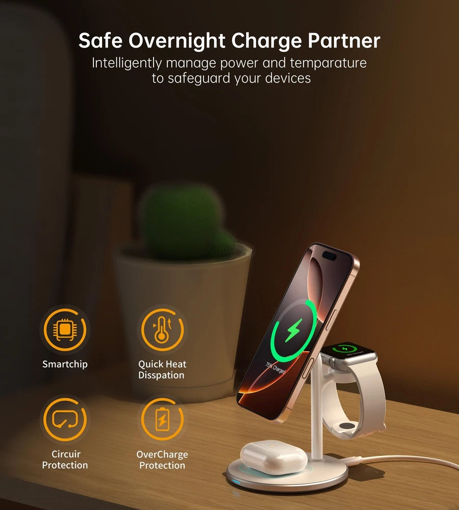 ๐ฃ๐ผ๐๐ฒ๐ฟ ๐ถ๐ป ๐ญ๐ ๐ฆ๐ป๐ฎ๐ฝ: Built in with dedicated magnets, the wireless charging spots provide precise magnetic alignment for MagSafe charging. Wireless solid magnetic connection ensures the convenience and security of charging and holding your devices in any orientation portrait or landscape. ๐ฆ๐ฎ๐ณ๐ฒ ๐ช๐ถ๐ฟ๐ฒ๐น๐ฒ๐๐ ๐๐ฎ๐๐ ๐๐ต๐ฎ๐ฟ๐ด๐ถ๐ป๐ด: This magnetic wireless charger come with a PD/QC 20W adapter, provide extra fast wireless charging from 0% to 100% in 2-3 hours (Based on our lab tests). Nearly as fast as the original Apple Mag-Safe charger. With an upgraded safety system and CE, FCC certificates, this wireless charger station provides double guarantees to ensure fast and safe charging! ๐ช๐ฒ๐ถ๐ด๐ต๐๐ฒ๐ฑ ๐ ๐ฒ๐๐ฎ๐น ๐ฅ๐ผ๐ฑ & ๐๐ฎ๐๐ฒ: Different from other poor pvc quality products which are easy to break in pieces or shake, as to ensure the durability and stability, the rod and the base of XooFly's charger station are made of weighted excellent metal inside and outside with exquisite design, allow your mobilephone to rest steadily on it for fast charging simultaneously. ๐ช๐ถ๐ฑ๐ฒ ๐๐ผ๐บ๐ฝ๐ฎ๐๐ถ๐ฏ๐น๐ฒ ๐ ๐ฎ๐ด๐ฆ๐ฎ๐ณ๐ฒ ๐๐ต๐ฎ๐ฟ๐ด๐ถ๐ป๐ด ๐ฆ๐๐ฎ๐๐ถ๐ผ๐ป: This 3 in 1 wireless charging station stand acts like a mini hallstand, holding and charging your iPhone 12-16 series(iPhone 8-11 with MagSafe case) , Apple Watch and AirPods Pro/3/2(wireless charging case) in one place, helping you end the messy cord life and tidy your desktop. A must-have 3 in 1 charging stand for different charging options as you need. ๐๐ ๐ฐ๐ฒ๐น๐น๐ฒ๐ป๐ ๐๐ถ๐ณ๐๐ ๐ณ๐ผ๐ฟ ๐ ๐ฒ๐ป & ๐ช๐ผ๐บ๐ฒ๐ป: Simple and elegant design make this magnetic charging station is not only a Place-Saving beside desktop charging stand, but a pretty desk tidy gift for your boy/girl friends and family. ๐ช๐ต๐ฎ๐ ๐ฌ๐ผ๐ ๐๐ฒ๐: 3-1 Wireless Charging Station; 20W QC 3.0 Charger; Type C Fasting Charging Cable(1.5m/5ft); User Manual; 24-Month Warranty & 24-hour Customer Service.