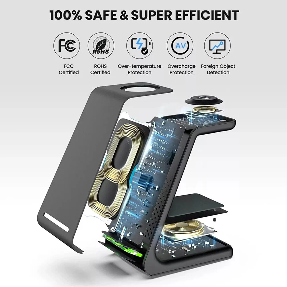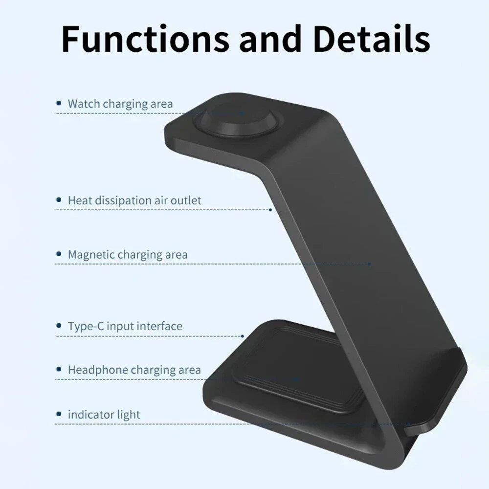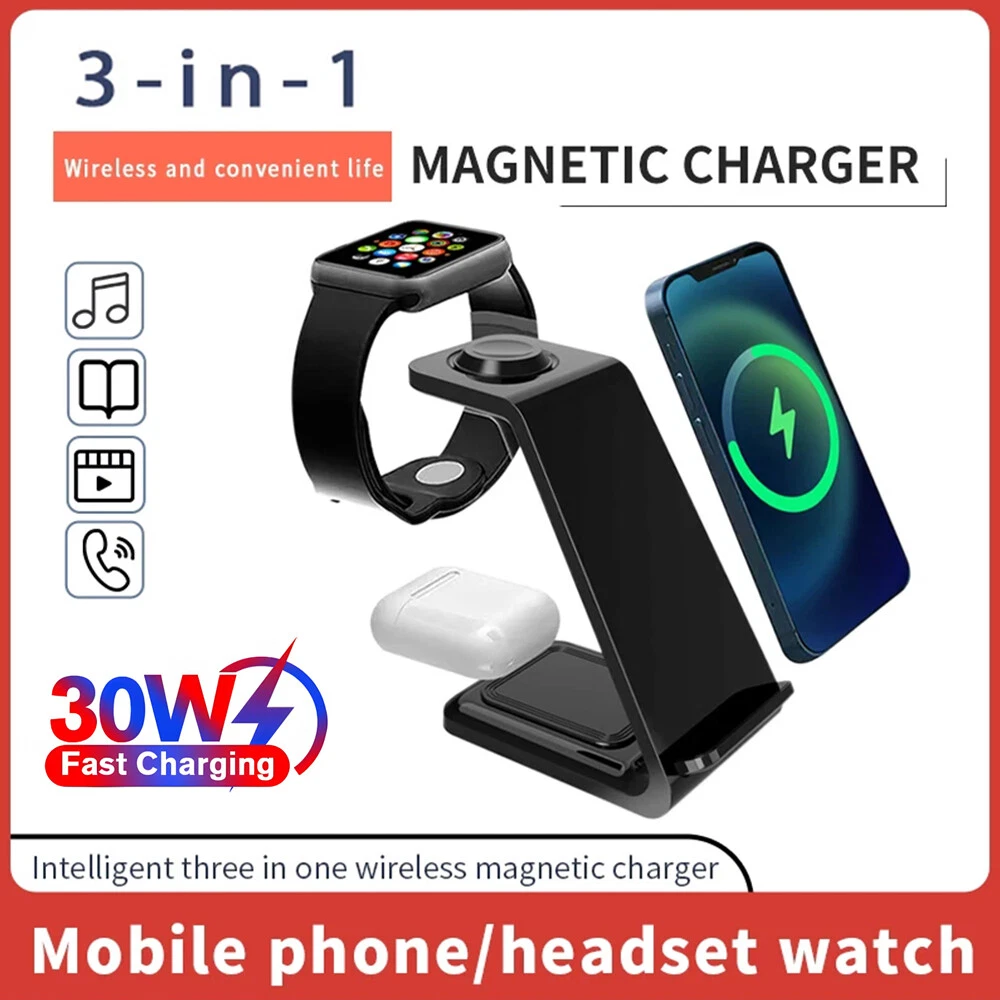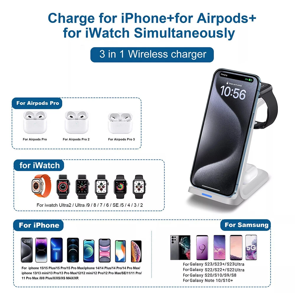 Picture Gallery Description Note: For a fast charging experience, please use a QC 3.0 power adapter (QC 3.0 adapter not included) Features: 1. [Multi-Device Wireless Charging Station] The 3 IN1 wireless charger is specifically designed for charging Apple devices. 2. [With Dual Charging Coil Design] The new 2024 3 in 1 wireless charging station provides a more stable charging experience without intermittent charging or overheating due to mismatches. Increases charging speed and eliminates the hassle of finding the “sweet spot”. 3. [Safe Charging] The wireless phone charger provides temperature control and voltage protection to prevent short circuits, with ventilation holes on the back of the charger to ensure safe and stable charging. Anti-slip silicone pads on the base and bottom protect your device from scratches and slips while charging. 4. [For Apple Watch] For Apple Watch Ultra2, Ultra, SE 2nd, SE 1st, 9, 8, 7, 6, 5, 4, 3, 2 5. [For Apple] For Apple iPhone 15Pro Max, 15 Pro, 15 Plus, 14 Pro Max, 14 Pro, 14 Plus, 13 Pro Max, 13 Pro, 13 mini, 13, 12 Pro Max, 12 Pro, 12, 12 mini, 11 Pro Max, 11 Pro, 11 XS Max, 11 XS Max, 11 XS Max. Pro, 11 XS Max, XS, XR, X, 8Plus, 8, SE 3rd, SE 2nd 6. [Applicable Headphones] For Apple AirPods Pro 2nd, Pro, 3, 2 (Note: Not applicable to Samsung Watch or other brand watches). Specification: *Product Name: 3 IN1 Wireless Charger *Mobile phone output: 5W/7.5W/10W/15W/30W *Watch output: 5W (max) *Headphone output: 5W (max) *Transmission distance: ≤6MM *Charging efficiency: ≥73% *Product Material: ABS *Product color: black/white Package List: 1*3-in-1 wireless charger 1*Type-C cable 1*User Manual Attention: 1. QC 3.0 adapter is not included! 2. Item is limited to charger only, not including headphones, watch! 3. Please allow 1cm difference due to manual measurement! 4. Depending on the light color or monitor hue may vary! Shipping Policy Payment Policy Return Policy Shipping Policy 1. We only ship to confirmed PayPal addresses. 2. Economy Shipping, with no tracking number. Standard Shipping, with tracking number. Express (Expedited) Shipping, with tracking number. 3. Economy shipping needs 2-5 weeks to arrive mostly. In rare case, it can take up to 6-8 weeks. It depends on your location and local postal service, as well as the weather condition along the shipping. 4. If you need a faster delivery time, you could choose Express (Expedited) Shipping. If you need a tracking number, you could choose Standard Shipping. Payment Policy We accept PayPal only. We only ship item to your PayPal verified address. Please pay attention that import duties, taxes and charges are not included in the item price or shipping charges. These charges are the buyer's responsibility. Please check with your country's customs office to determine what these additional costs will be prior to bidding/buying. Return Policy 1. We offer 60 day money back or replacement guarantee. In addition, it allows customers to return new and unused products in their original factory condition for any reason within 60 days from the date of purchase. 2. Although we test each item and they are packed professionally, few item (less than 0.1%) might be damaged during the shipping. Please feel free to contact us within 4 days after you receive your package about replacement. 3. If you don't receive items over 35 days, please make sure to contact us before leaving any neutral or negative feedback. We'll try our best to help you solve the problem. If we authorized the return, customers will get an email with instructions for returning the item. Email will be replied within 24 hours on Chinese business hours. On Jan 25, 2025 at 12:07:36 PST, seller added the following information: