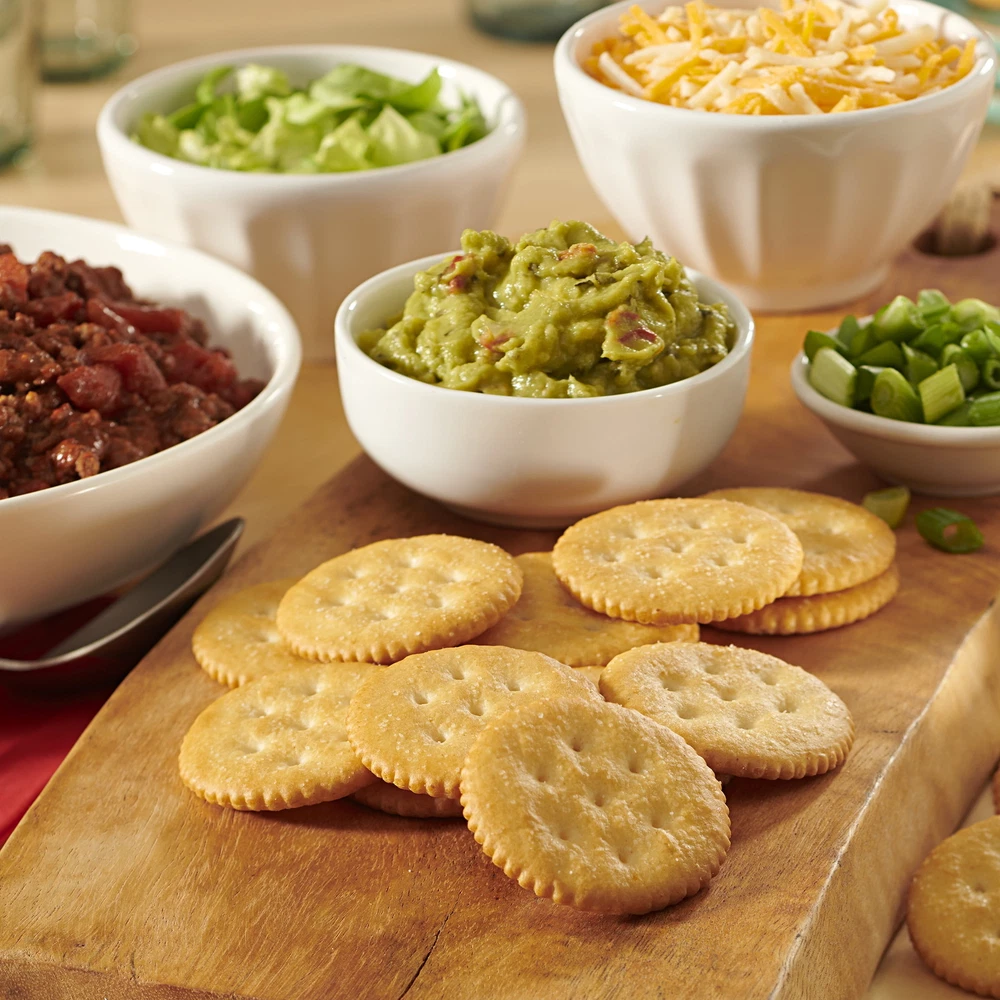 One 27.4 oz party size box with 8 individually wrapped sleeves of Flaky and delicious snack crackers with a rich, buttery flavor Kosher crackers are great for snacking, appetizers or quick meals Pairs with almost any topping, from meat and cheese to fruit and whipped cream Individually wrapped sleeves lock in freshness have a rich, buttery flavor that's perfect for pairing, topping or enjoying on its own. No matter the occasion, these tasty round crackers make a great snack food, appetizer or quick meal. Keep a package of snack crackers on your shelf for a salty snack anytime. Each 27.4 ounce box contains 8 individually wrapped sleeves of crackers to lock in freshness.