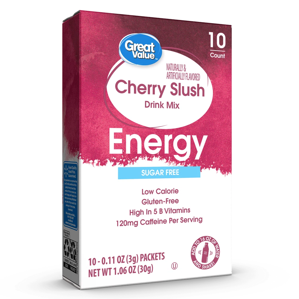 About this item Product details Each box of Great Value Cherry Slush Energy contains 10 Singles To Go and is a naturally and artificially flavored, low calorie drink mix containing zero sugar, and is gluten free and Kosher. High in 5 B Vitamins. Contains 120mg Caffeine Per Serving. Contains 120mg Caffeine Per Serving. Zero Sugar, Low Calorie, Kosher and Gluten Free Drink Mix. Each serving is high in five B Vitamins. Easy to Make SIP from a full bottle of water to make room for powder
