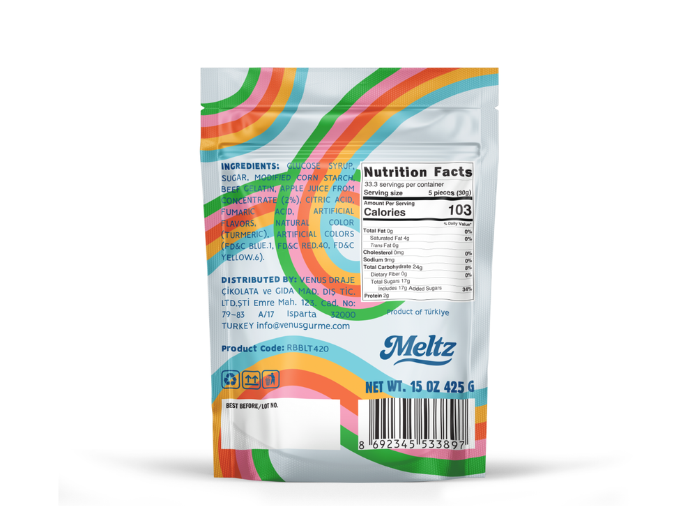 Meltz Gummy Sour Rainbow Belts – Swedish Style, 15 oz (425 g) Add color and bold flavor to your snack time with Meltz Gummy Sour Rainbow Belts , crafted in Swedish style for a soft, juicy, and smooth chew . These vibrant rainbow strips are coated with a light sour sugar, delivering a perfectly balanced sweet-and-tangy bite in every piece. Designed for gummy lovers who value texture and taste, Meltz Sour Rainbow Belts offer a tender, less-sticky chew with bright fruity flavors. Packed in a generous 15 oz (425 g) bag, they’re perfect for sharing, parties, candy bowls, or everyday snacking. A premium European-style gummy experience that’s as fun to eat as it is delicious.