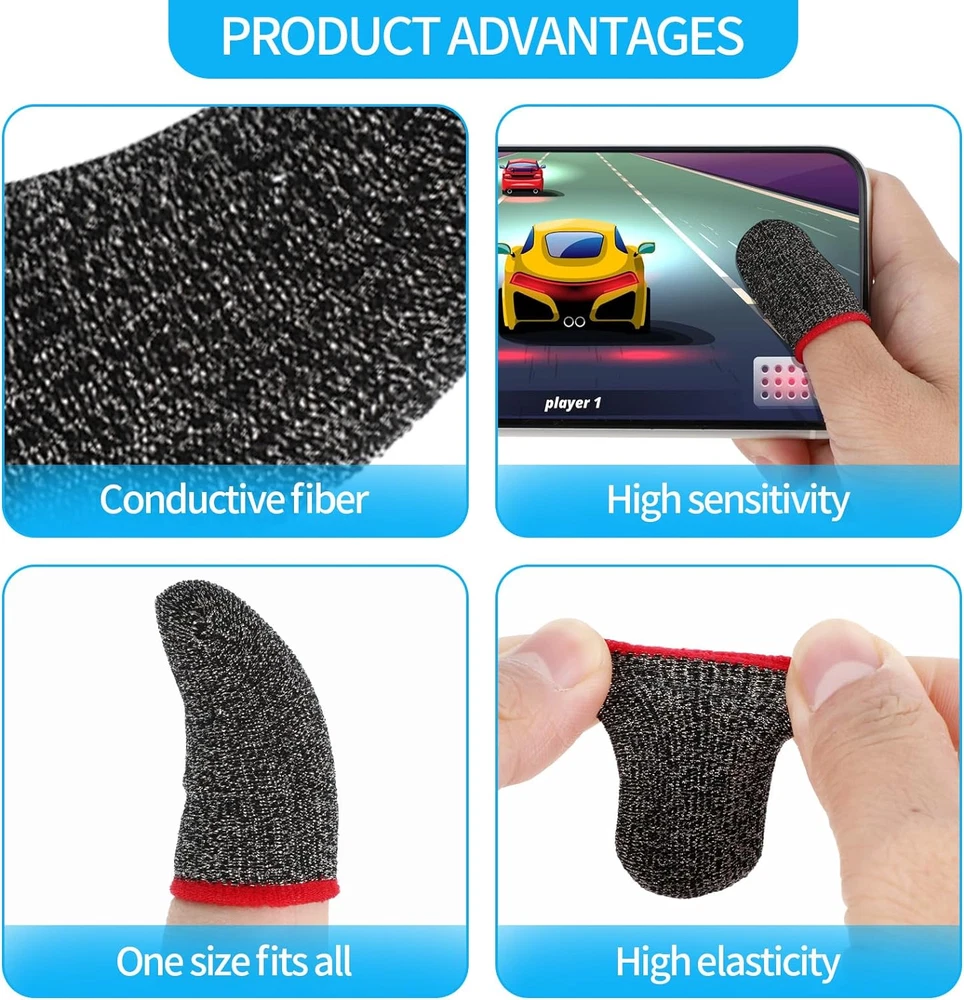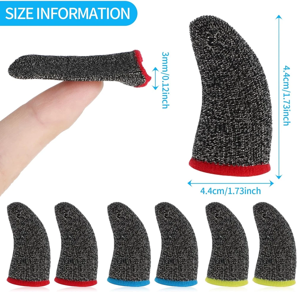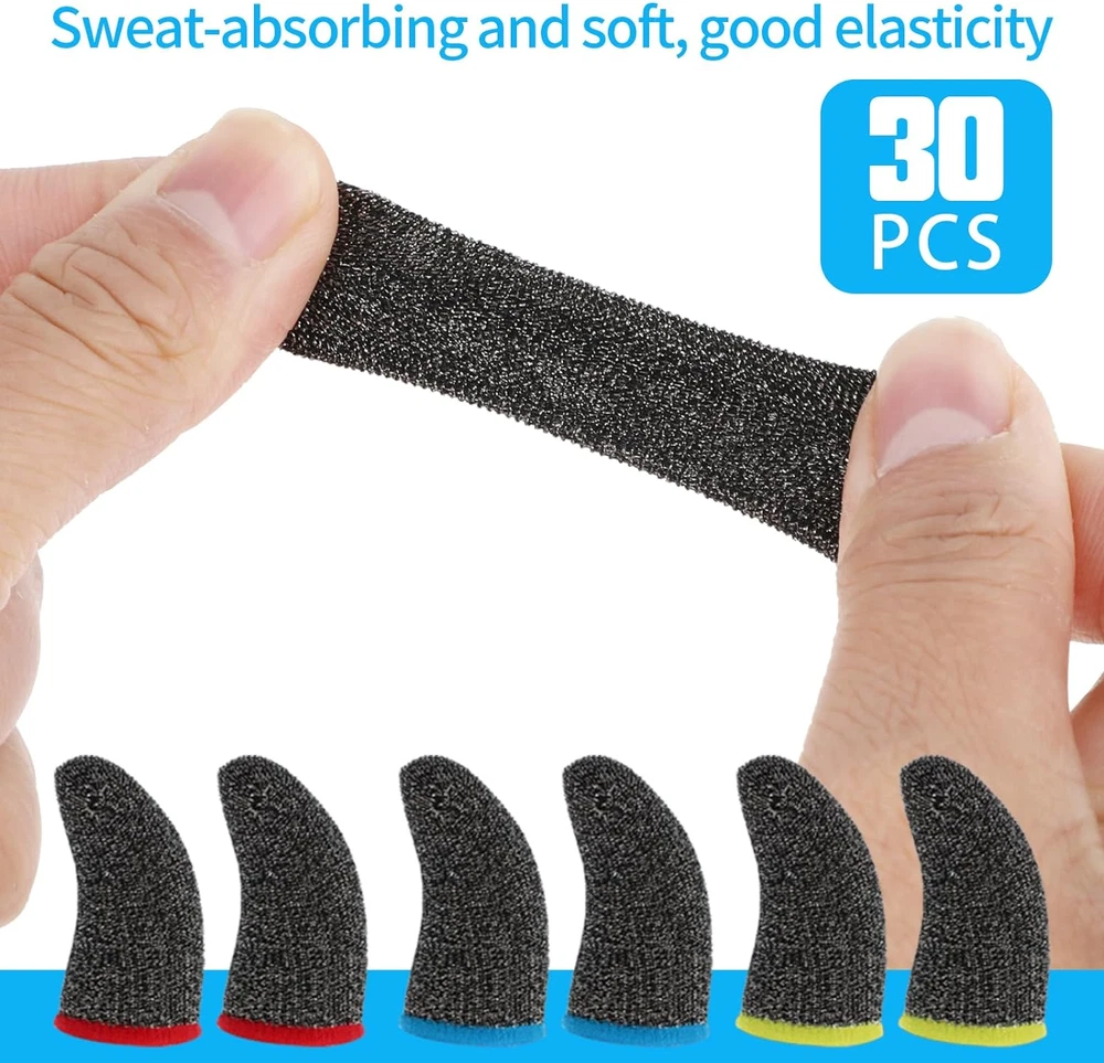 Compatible with all devices: Precision Gaming Finger Sleeves remove friction and "game drag" for the ultimate in touch control accuracy and smooth consistency. High sensitivity: Finger gamer gloves made from genuine carbon fibre, providing highly conductive touch response and sensitivity with strong tensile strength. Not only does it reduce friction on the screen, but it also ensures touch sensitivity, allowing you to fully immerse yourself in the gaming experience without any distractions from the outside environment. Thin and breathable: Finger sleeve for gaming gray is breathable and seamless, greatly enhancing touch sensitivity. Thin, soft and comfortably flexible. Our gaming finger covers resist the adverse effects of moisture, sweat, dust and oil on the game. Highly elastic: The mobile game finger sleeve can be adjusted and fits most people's finger sizes, fits comfortably for different finger sizes, no tightness, no friction, easy to carry and can be kept in your pocket or bag. Packaging: 30 pieces of gaming finger sleeves, enough to meet your gaming daily needs. These finger covers can be used not only when you are playing mobile games, you can also use it while using your mobile phone. Compatible with all devices, finger sleeves for precision gaming for ultimate touch control accuracy and frictionless consistency . With strong tensile strength, it reduces friction on the screen, allowing you to fully immerse yourself in the gaming experience without any outside distractions. Our mobile gaming finger covers resist the adverse effects of moisture, sweat, dust and oil on the game. The mobile gaming finger covers can be adjusted and fit most people's finger sizes for a comfortable fit with no tightness for different finger sizes. Name: 30pcs Seamless Anti-Sweat Breathable Finger Sleeve Gloves for Gaming Colour: red/ blue/yellow Material: fibre Size:4.4 x 2.3cm/1.73 x 0.91inch