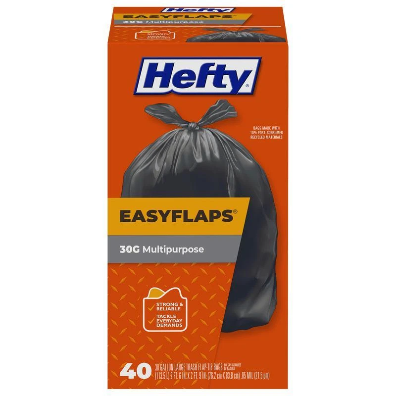 You may also like 45 Pack Unscented 21 Gallon Drawstring Trash Bags Puncture Resistant Leakproof 13.1 USD 13.79 USD Free shipping 5% off Round Contemporary White Steel Trash Can Wastebasket New Bathroom Office Bedroom 44.41 USD 46.75 USD Free shipping 5% off 2.2gal Metal Bathroom Wastebasket, Brushed Nickel General Trash Can 17.62 USD 18.55 USD Free shipping 5% off Durable 13 Gallon White Swing Lid Garbage Can Home Essential Kitchen Waste Bin 20.79 USD 21.88 USD Free shipping 5% off Metal Bathroom Waste Basket 1.3 Gallon Step Garbage Can Soft Close Versatile New 26.46 USD 27.85 USD Free shipping 5% off Plastic Trash Can 13 Gallon Black Kitchen Garbage Bin Swing Top US 20.04 USD 24.47 USD Free shipping 18% off 1.64 Gallon Ribbed Indoor Plastic Trash Can Decorative Wastebasket Organizer New 12.63 USD 13.3 USD Free shipping 5% off Hefty Strong Large Multipurpose Trash Bags help you tackle cleanup jobs all around the house, thanks to their Hefty! Hefty! Hefty! strength and large capacity. With their 30 gallon size, these garbage bags are ideal for storing donations, seasonal decorations, everyday kitchen trash and more. Signature Hefty quality ensures these large trash bags deliver superior puncture resistance for outside and inside jobs. Plus, with the Easy Flaps closure, these plastic trash bags make removal and transporting easy; simply tie shut and carry out to the car or curb. Count on these plastic trash bags for the strength and reliability you expect from Hefty. Don’t forget: all Hefty trash bags are backed by a 100% satisfaction guarantee. Hefty Easy Flaps Multipurpose Large Trash Bags, 30 Gallon, 40 Count Handy Easy Flaps® closure. Economical alternative to drawstring trash bags. Features: Puncture Resistant, Tear-Resistant Volume Capacity: 30 gal Bag Closure: Twist Tie Scent: Unscented Recommended Use: Residential, Commercial Recommended Room: Kitchen, Garage Brand: Hefty Manufacturer Part Number: E27744 Color: Black Manufacturer: Reynolds Consumer Products Assembled Product Dimensions (L x W x H): 4. 31 x 4. 56 x 9. 00 Inches Queen Electric Heated Blanket Micro-Fleece Soft Warm Low Voltage Safe Technology 113.71 USD 119.7 USD Free shipping 5% off Heavy Duty 15" Paper Cutter Self-Sharpening Blade Safety Guard Wood Base Durable 80.79 USD 85.04 USD Free shipping 5% off Two Way Radio Pair 36 Mile Range Durable Weather Alert Waterproof Communication 102.5 USD 107.89 USD Free shipping 5% off Faux Fur Saucer Chair Foldable Steel Frame Cozy Lounge Seating Indoor Durable US 75.57 USD 79.55 USD Free shipping 5% off Superwide Baby Gate Play Yard Safety Fence Portable Configurable Plastic 6 Panel 94.88 USD 99.87 USD Free shipping 5% off Digital Ceramic Tower Heater 1500W Oscillating Indoor Space Heater W/ Thermostat 95.7 USD 100.74 USD Free shipping 5% off Personalized Turkish Cotton Chaise Lounge Cover Waterproof Comfort Protection US 54.87 USD 57.76 USD Free shipping 5% off AM/FM Weather Band Clock Radio NOAA Alerts Digital Tuner Auxiliary Input Durable 71.8 USD 75.58 USD Free shipping 5% off 4 Tier Plastic Garage Storage Shelves Organizer Heavy Duty Durable Unit Indoor 80.97 USD Free shipping 12-Piece Nonstick Aluminum Cookware Set W/ Glass Lids Acacia Wood Utensils New 88.4 USD 93.05 USD Free shipping 5% off 10FT Patio Umbrella Auto Tilt Vented Canopy Backyard Shade Outdoor Relaxation US 82.76 USD 87.12 USD Free shipping 5% off Gold Durable Bar Serving Cart W/ Shelves Wine Holders Rolling Mobile Kitchen New 91.3 USD 96.11 USD Free shipping 5% off
