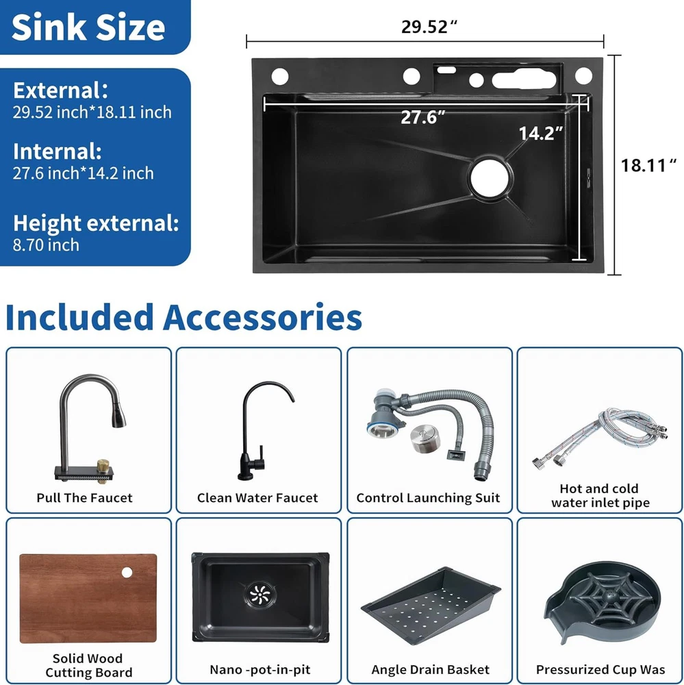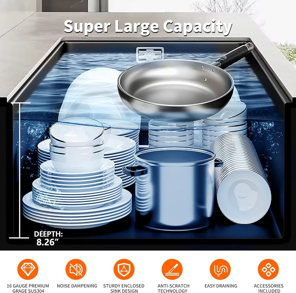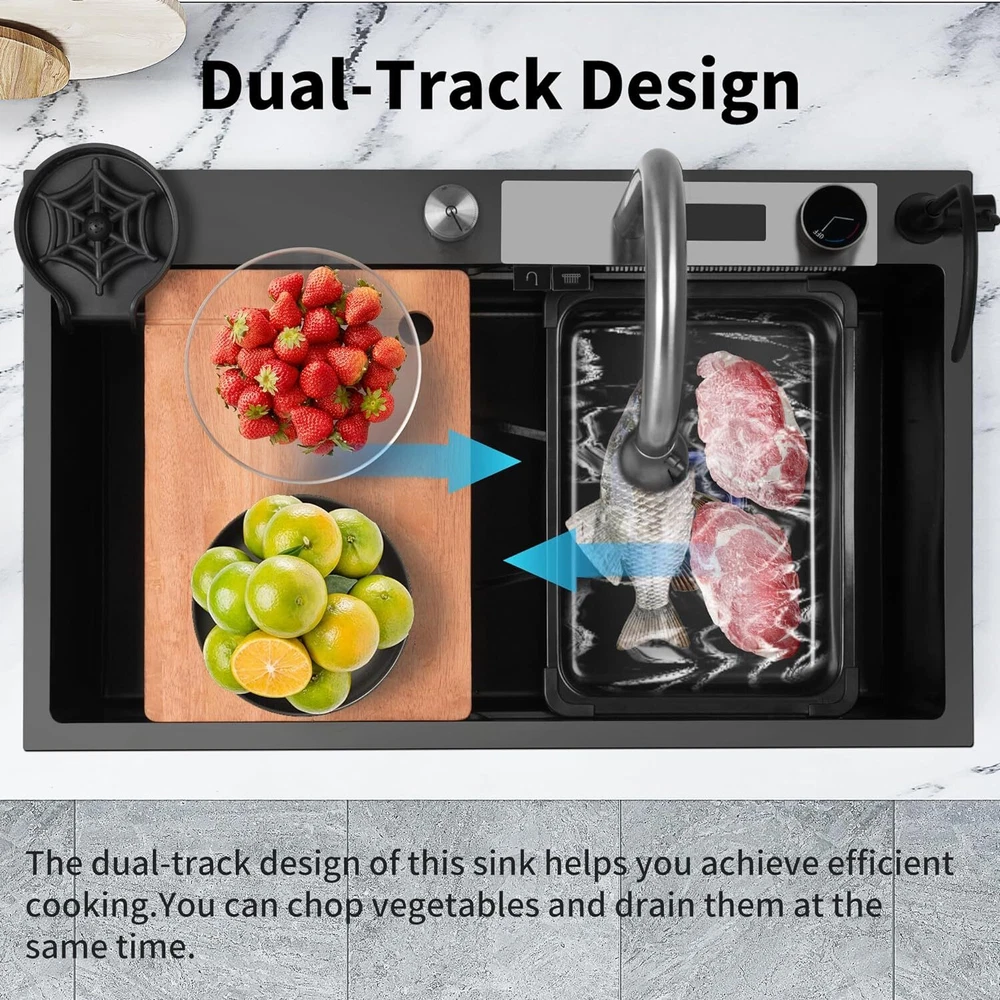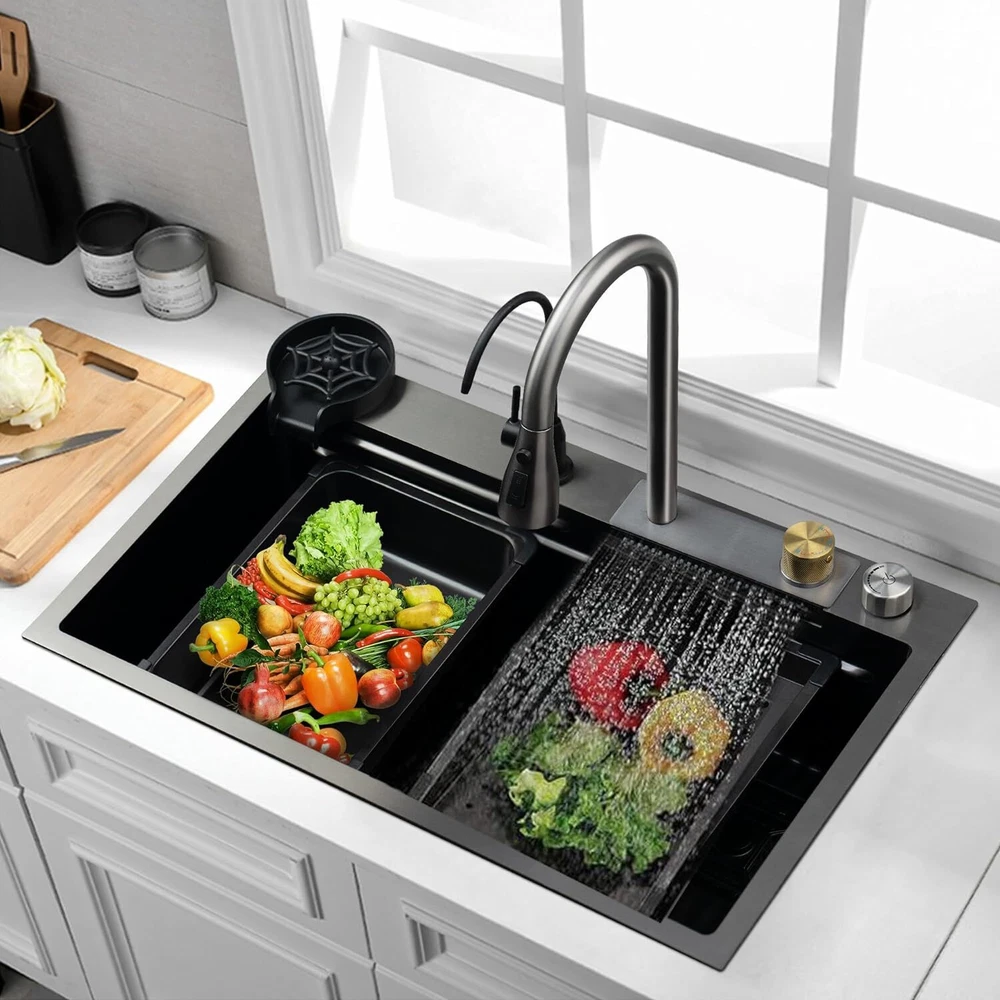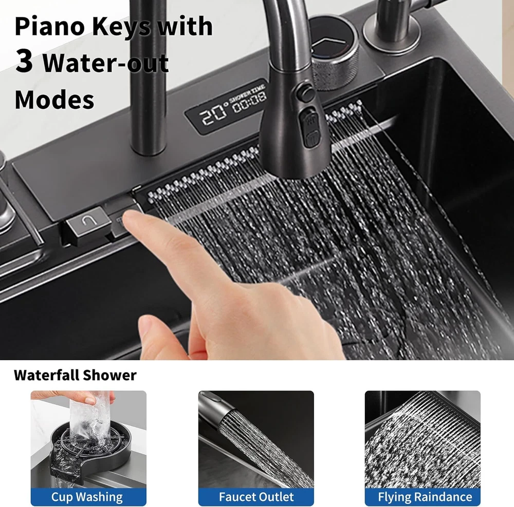 From the brand TTG Steel Kitchen Sink Our idea was to create a multi-functional sink that would help full-time moms cook and clean efficiently with less effort. TTG Kitchen Sink Stainless Steel Kitchen Sink Drop-In Kitchen Sink Waterfall Kitchen Sink Undermount kitchen sink Product Description TTG Smart Kitchen Waterfall Sink with Multifunctional Faucet 1 304 Stainless Steel 2 Noise Reduction 3 Various Size to use 4 Effecient Draining