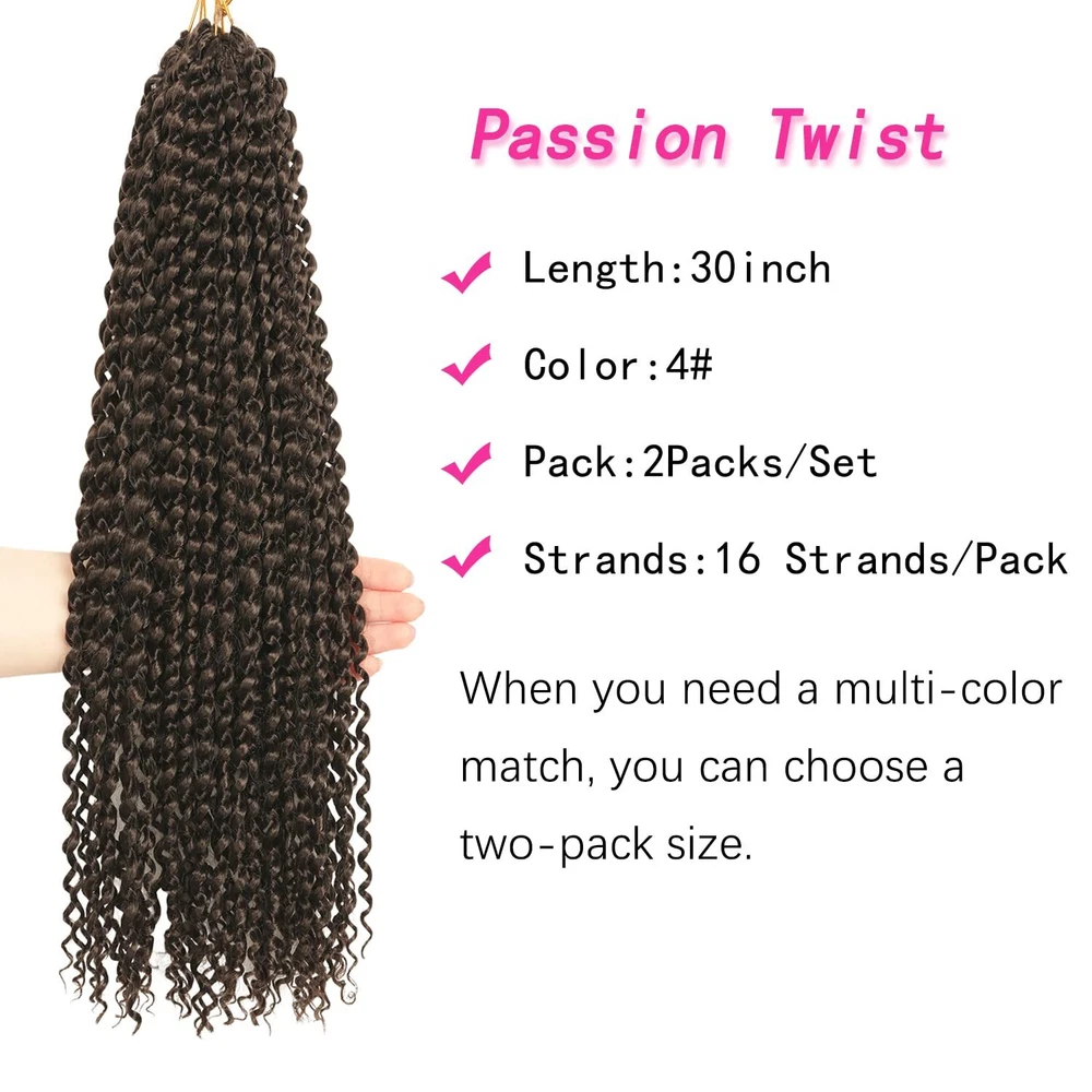 Product Name:Long Passion Twist Hair. Material: Water Wave Crochet Hair is made of 100% Low-Temperature Synthetic Fiber, Hot Water Setting Available. Feature: Our Passion Twist Crochet Hair is Soft And Bouncy; Lightweight; Itch-free; No smell; No Tangle; No shedding; Smooth; Tight; Very easy to twist and install;Natural & Stylish looking; Hold a long time. Passion Twist Braiding Hair Specification: Length: 30 inch Passion Twist Hair,16 strands/pack,2 packs/lot. Are you tired of Long hairstyles? Try this, it will bring you different feelings. ☀ Passion Twist Hair Is Made Of 100% High-quality Low-temperature Flame-Retardant Synthetic Fiber. Hot Water Setting Passion Twist Crochet Hair. ☀ Water Wave Crochet Hair is Soft And Bouncy;Lightweight;No smell; No Tangle;No shedding; Smooth; Tight; Very easy to twist and install; Natural & Stylish looking; Hold a long time. ☀ Passion Twist Braiding Hair Specification:22 strands/pack,three package options (2 Packs/lot,6 Packs/lot and 7 Packs/lot) . Usually 6-7 Packs Are Enough To Full A Head.Additional include:1 crochet needle, a pack of rubber bands, and some cute hair jewelry. ☀ Different Style:Water Wave, as the basic product, can be made with many new hairstyles. Such As Distressed Locs, Faux Locs, Passion Braids et. ☀ We suggest you wear a cap when you wear the passion twist hair, before you are going to bed. So that you can use it for longer.